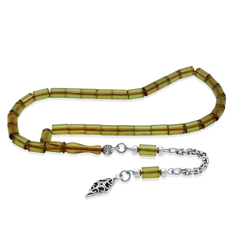 Ateş Kehribar Tesbih - Kararmaz Metal Arnavut Püsküllü - Mini Boy - Ihlamur Sarısı - Kesme Kesim