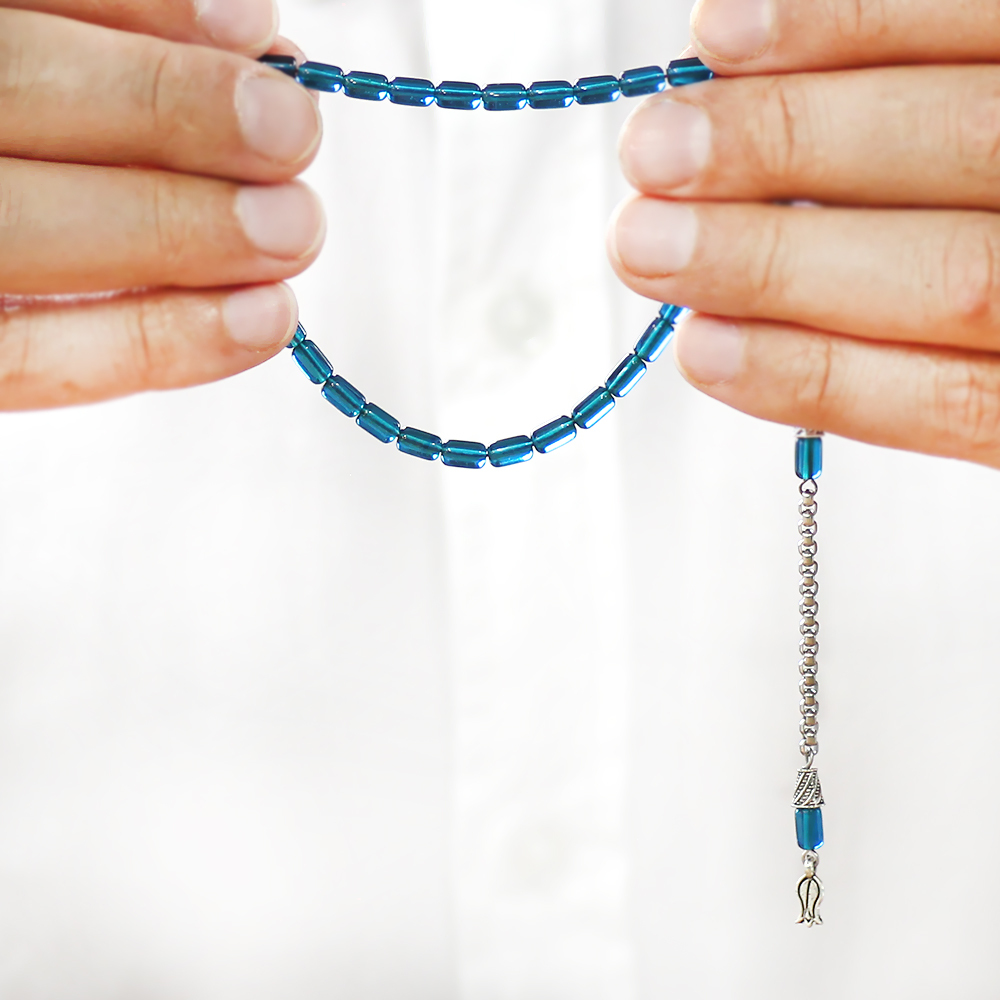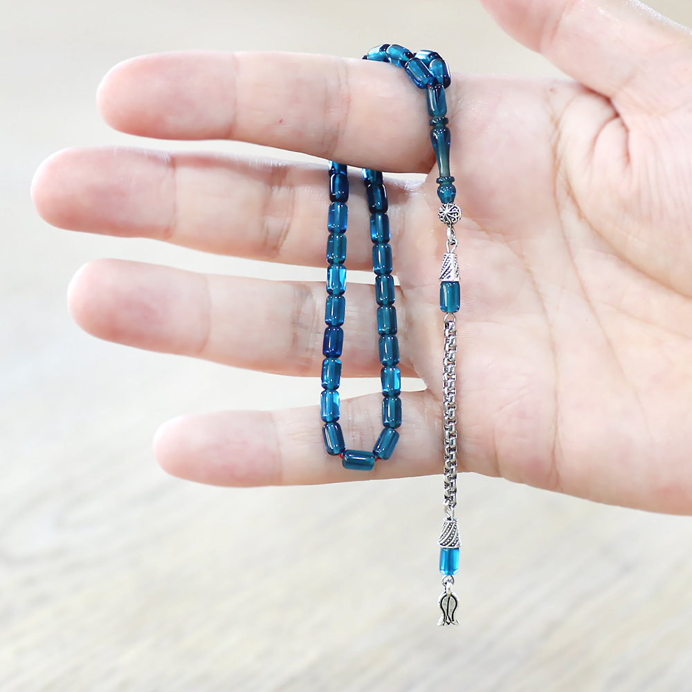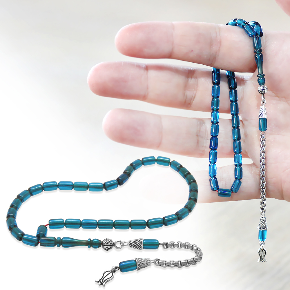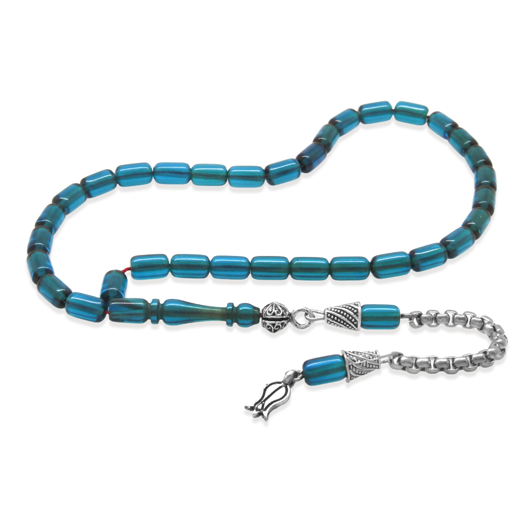 Ateş Kehribar Tesbih - Kararmaz Metal Püsküllü - Bilek Boy - Mavi Renk - Kapsül Kesim