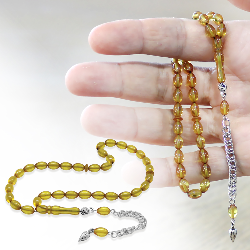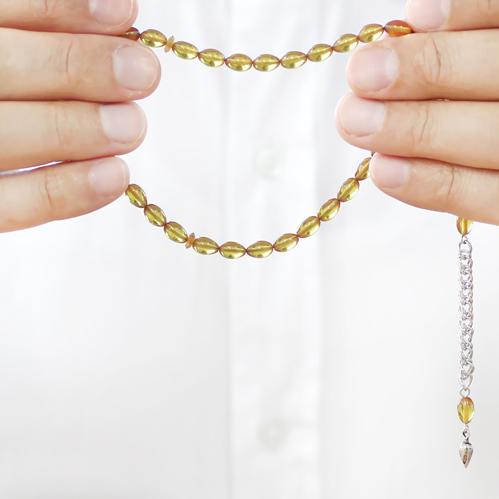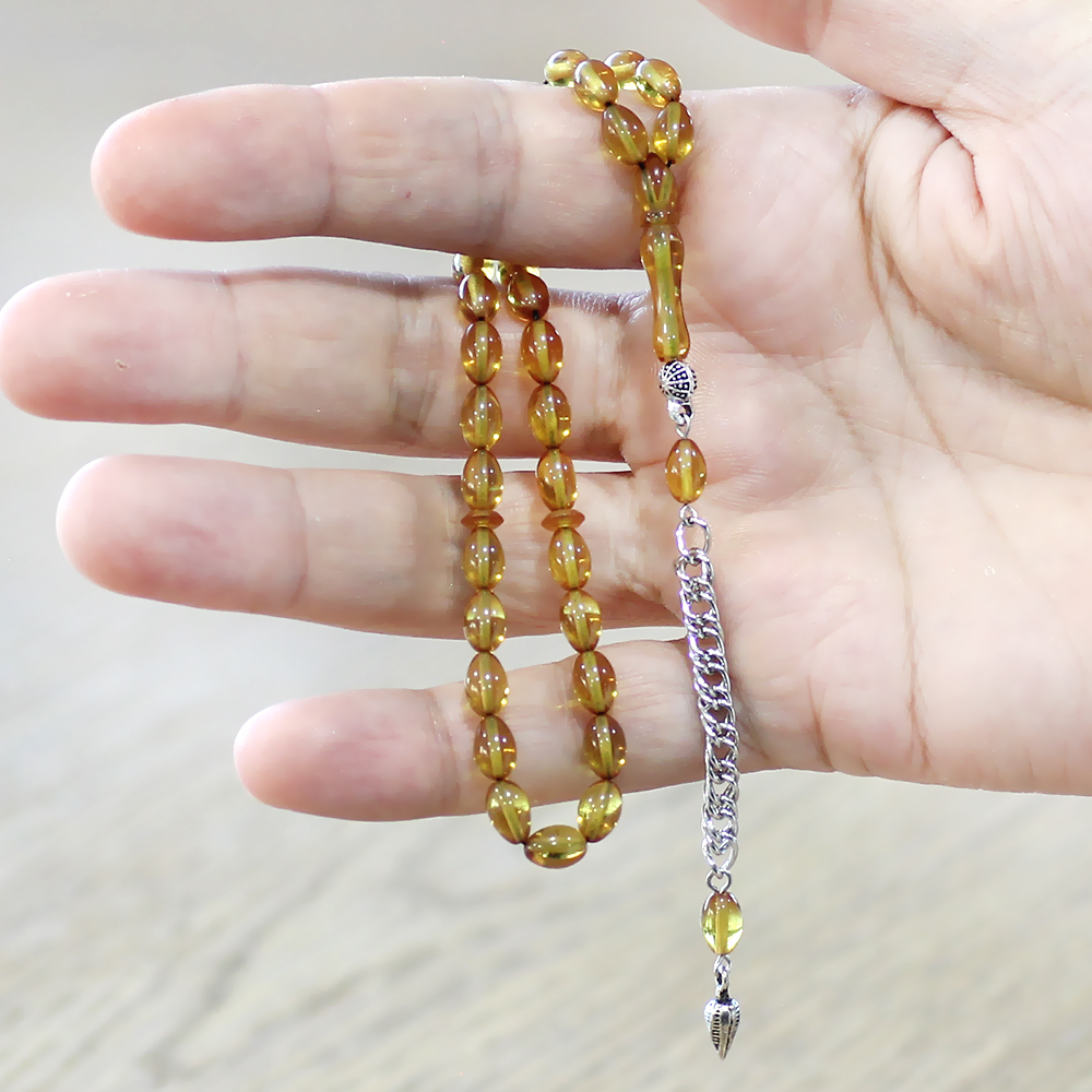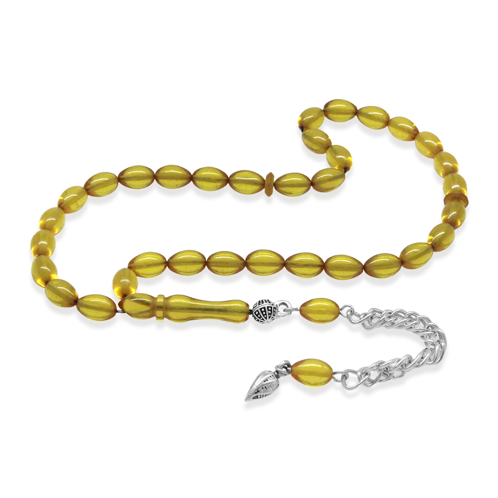 Ateş Kehribar Tesbih - Kararmaz Metal Püsküllü - Mini Boy - Sarı - Arpa Kesim