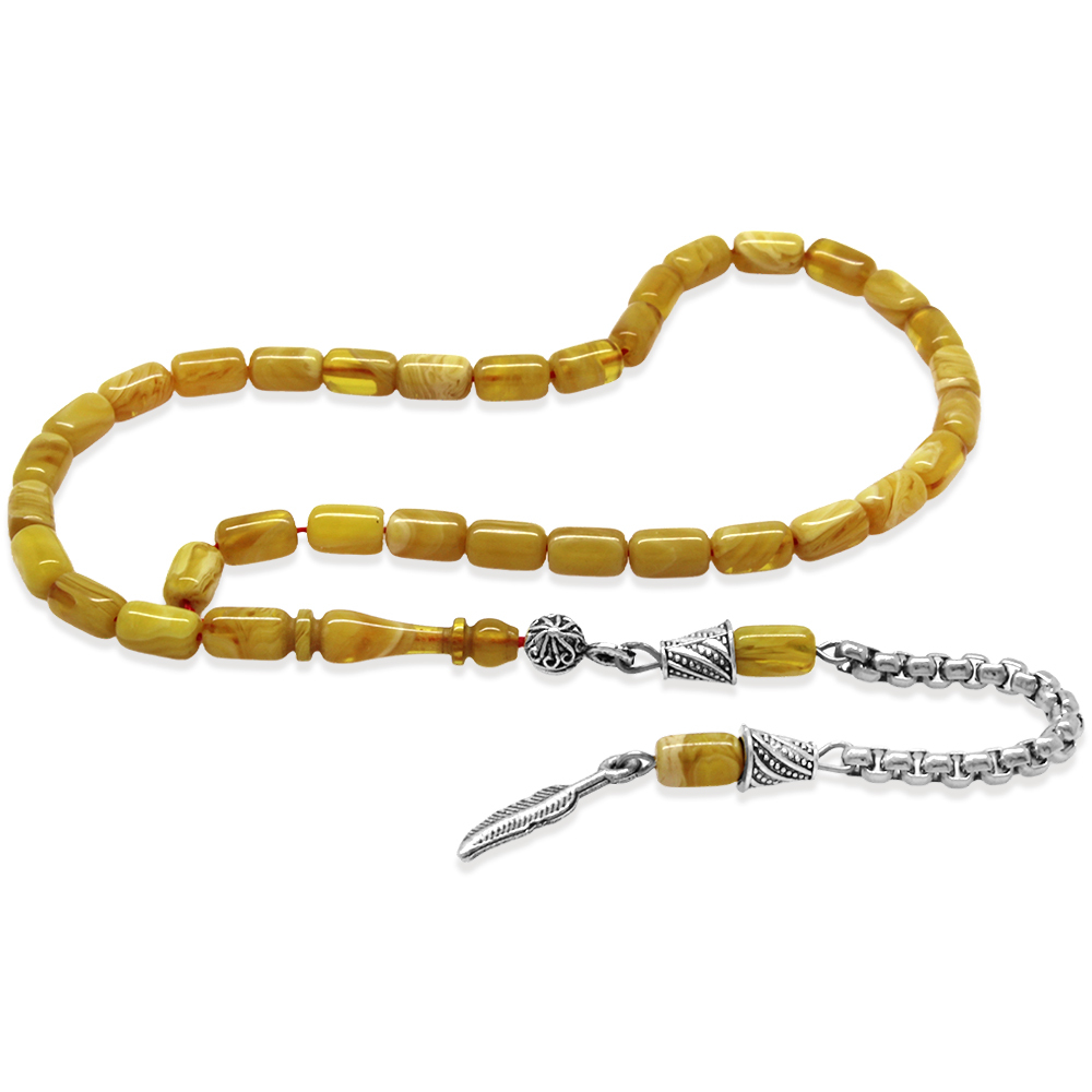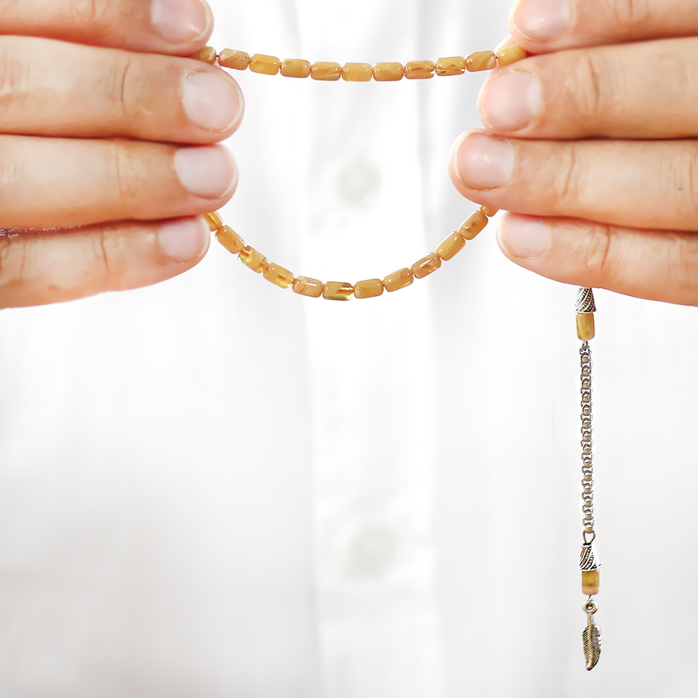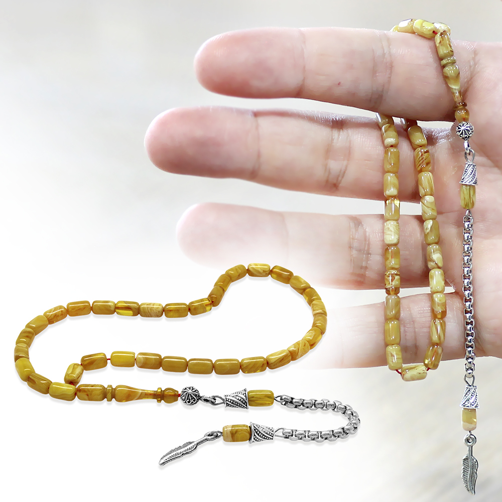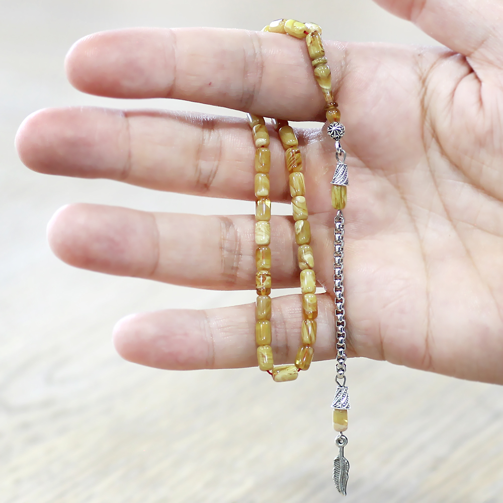 Ateş Kehribar Tesbih - Kararmaz Metal Püsküllü - Bilek Boy - Sarı Beyaz Renk - Kapsül Kesim
