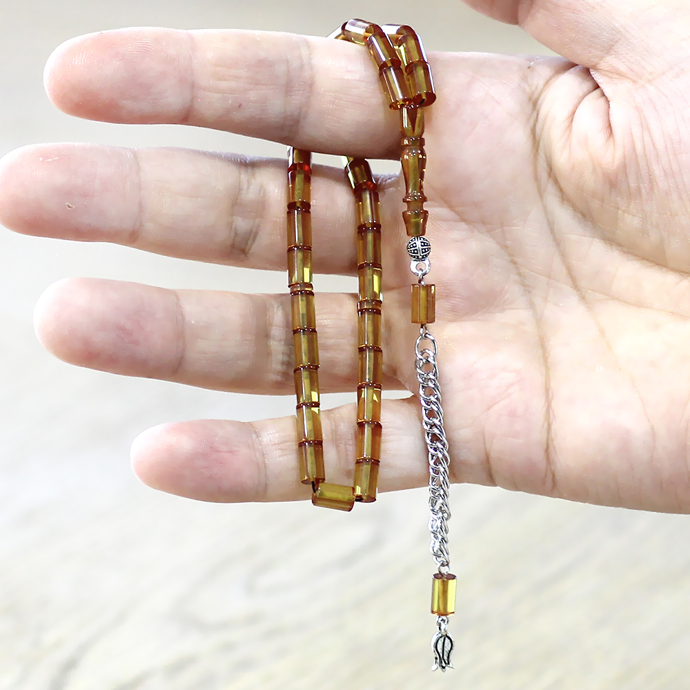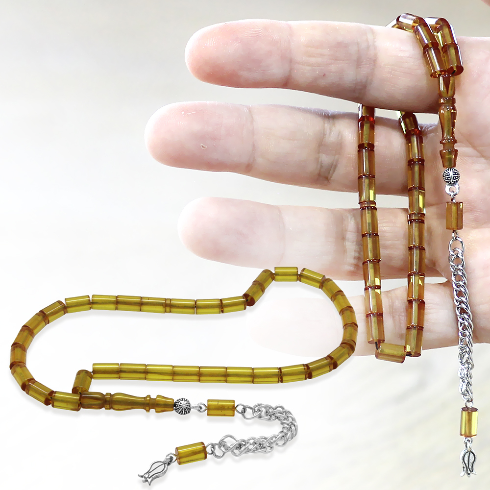 Ateş Kehribar Tesbih - Kararmaz Metal Püsküllü - Mini Boy - Sarı - Kesme Kesim