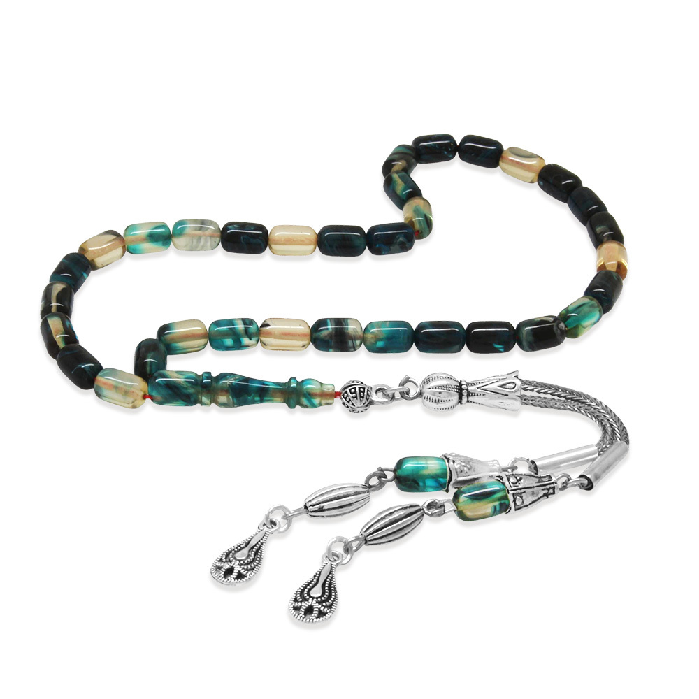 Ateş Kehribar Tesbih - Kararmaz Metal Damla Püsküllü - Mavi Beyaz Renk - Mini Boy - Kapsül Kesim