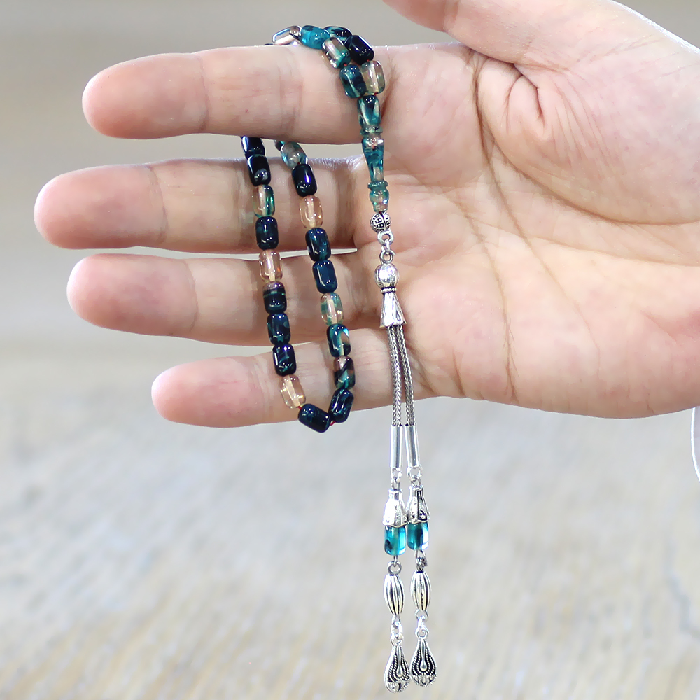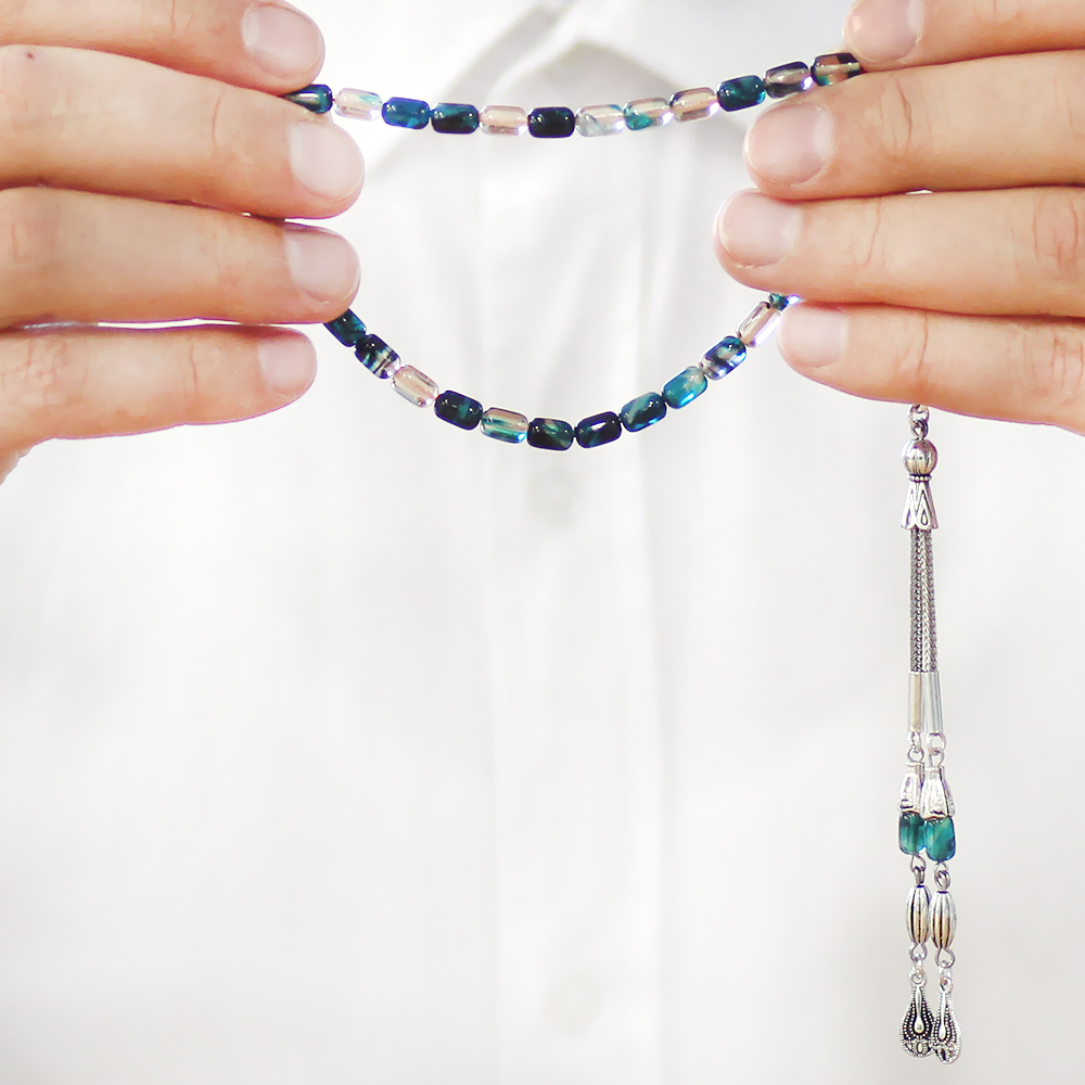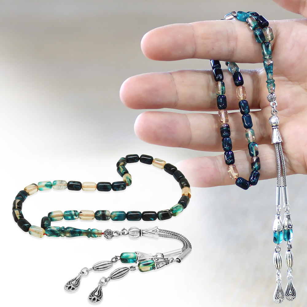 Ateş Kehribar Tesbih - Kararmaz Metal Damla Püsküllü - Mavi Beyaz Renk - Mini Boy - Kapsül Kesim - 1