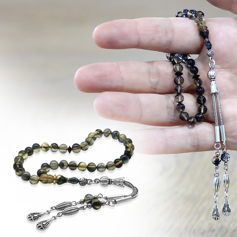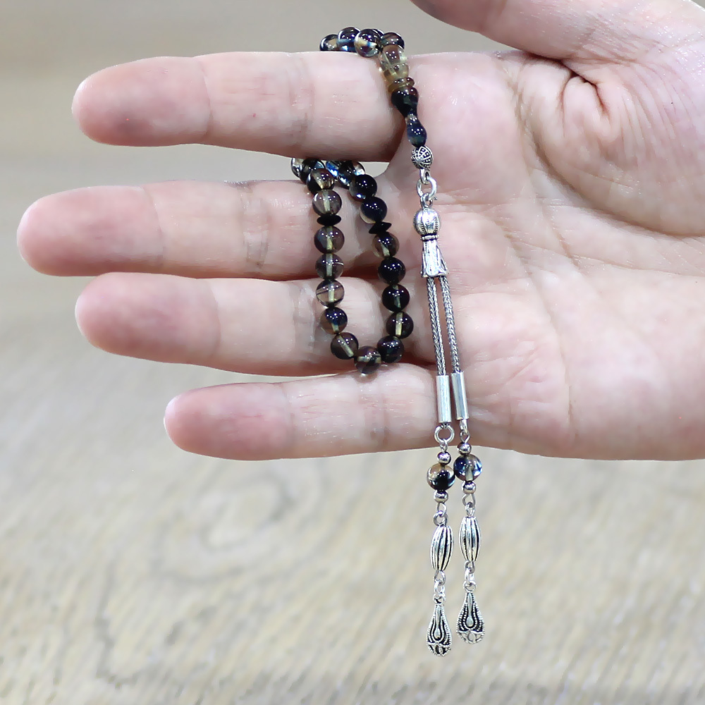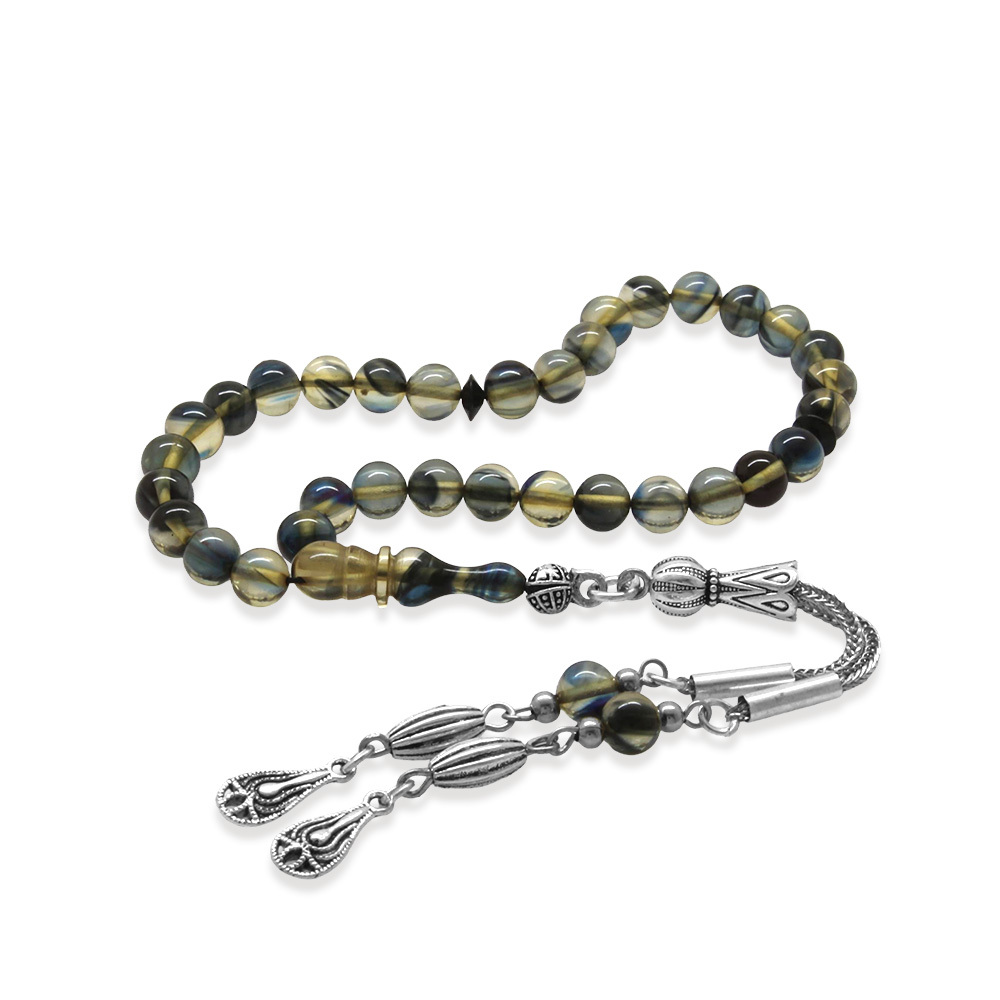 Ateş Kehribar Tesbih - Kararmaz Metal Damla Püsküllü - Bilek Boy - Mavi Beyaz Renk - Küre Kesim