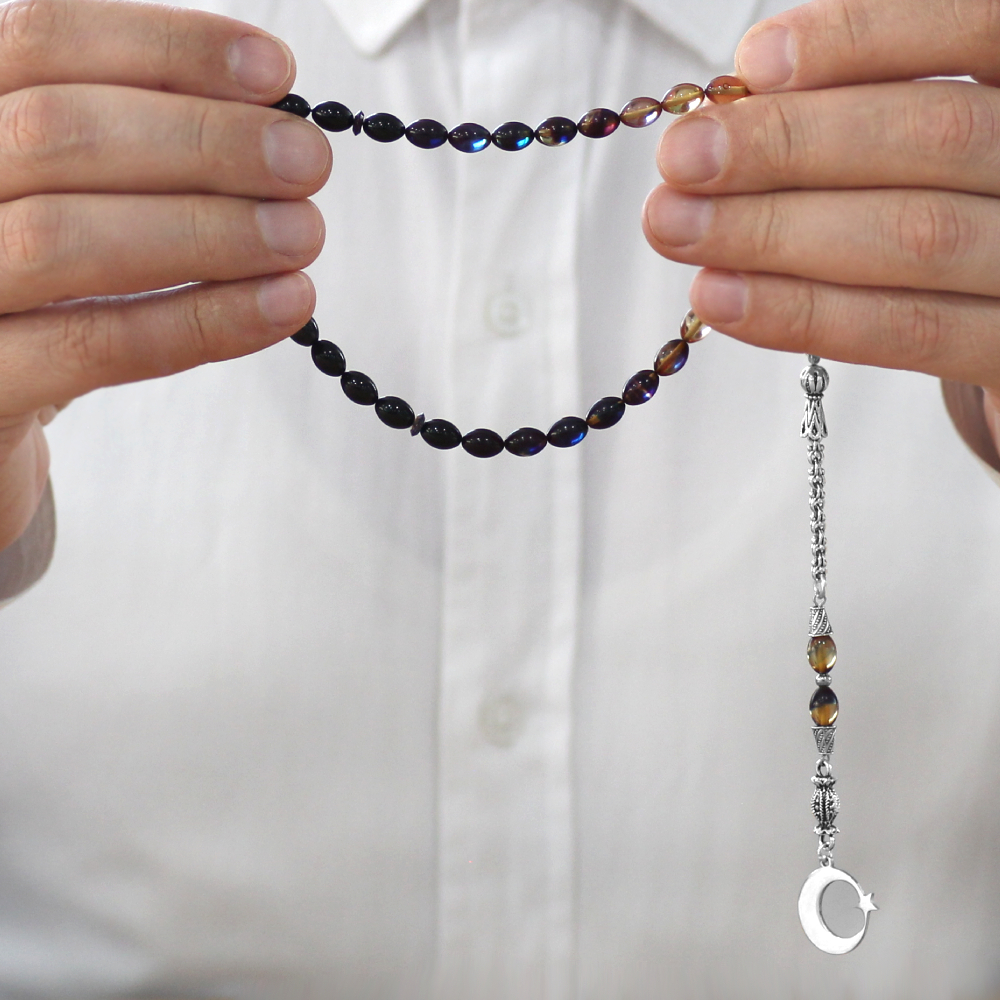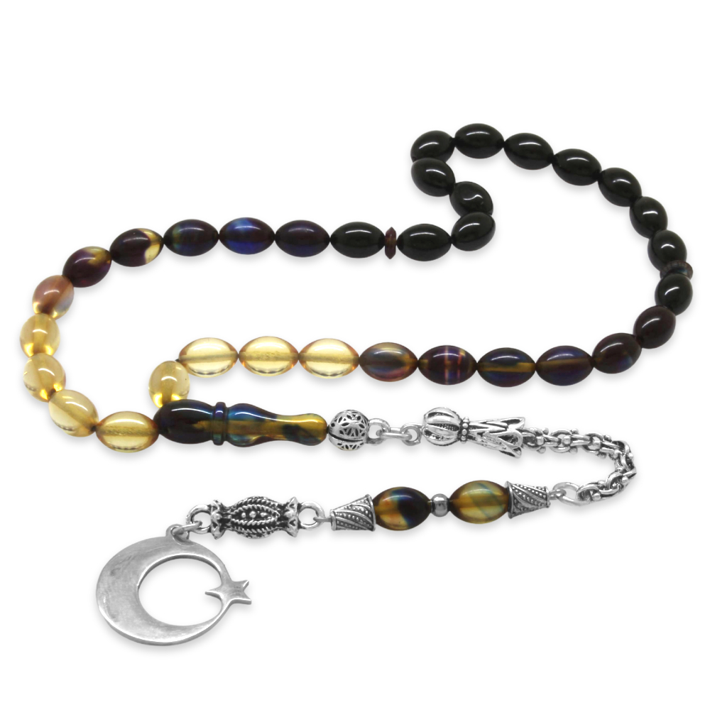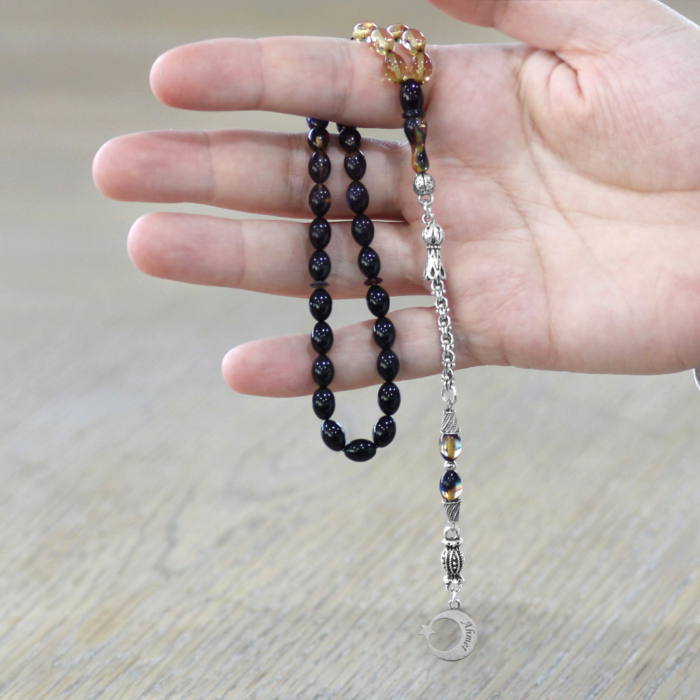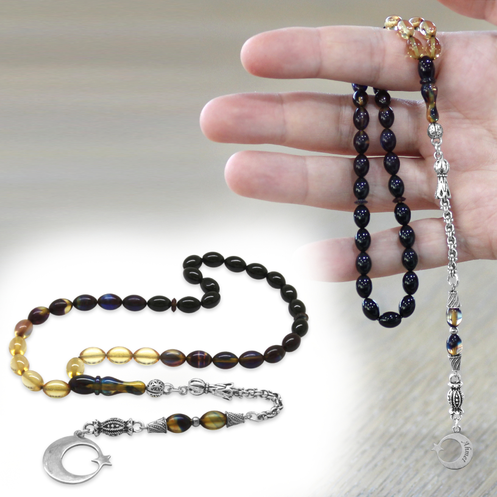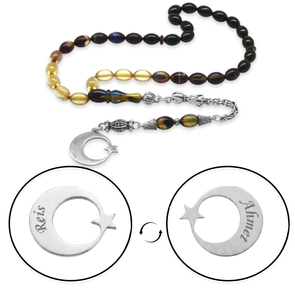 Ateş Kehribar Tesbih - Metal Püsküllü - Arpa Kesim - Ayyıldız Uçlu İsme Özel Yazılı - Bonibon Renk