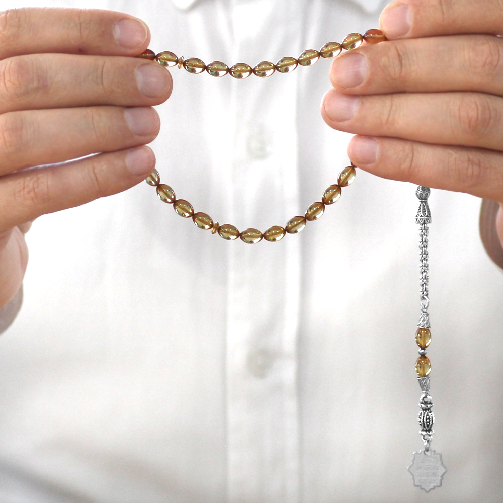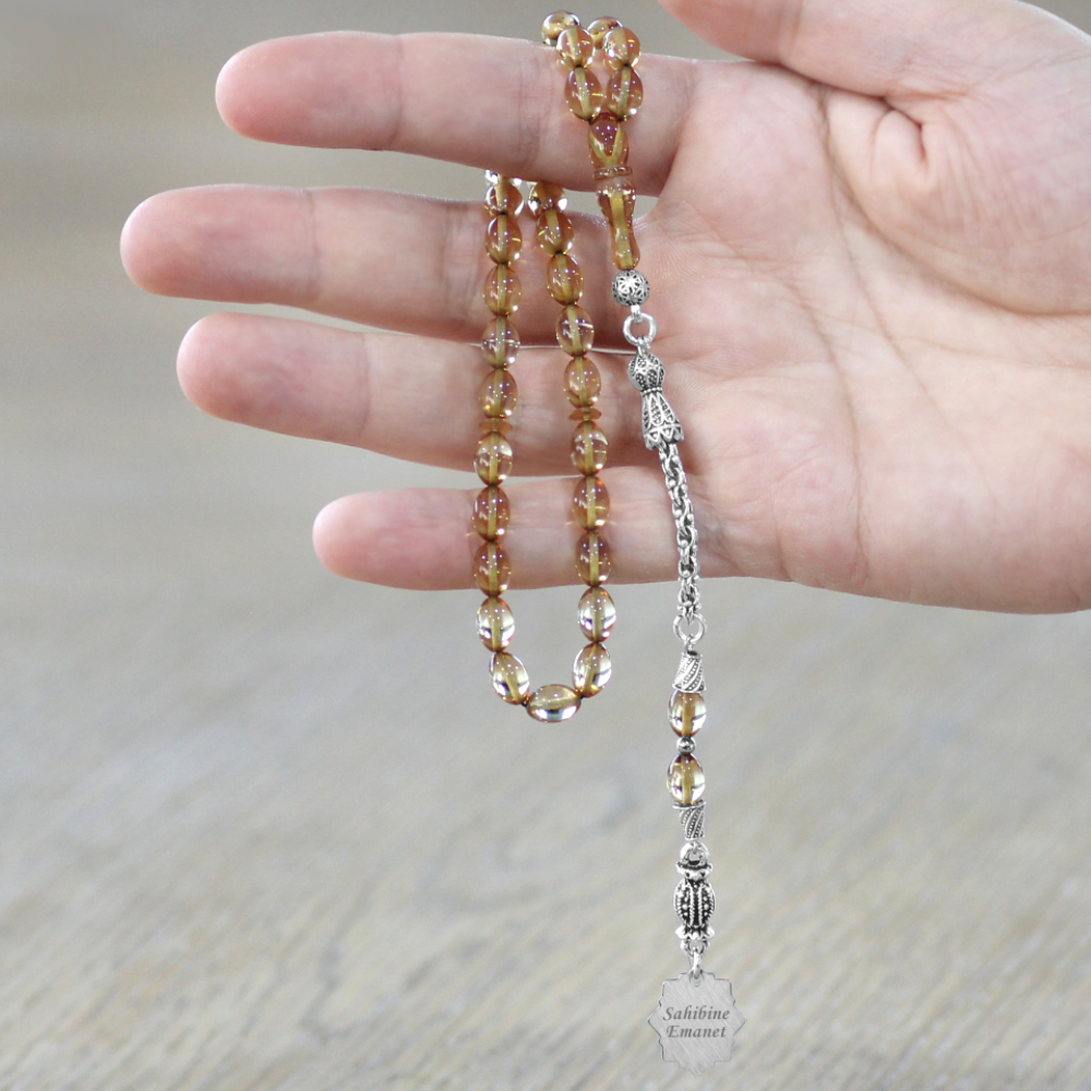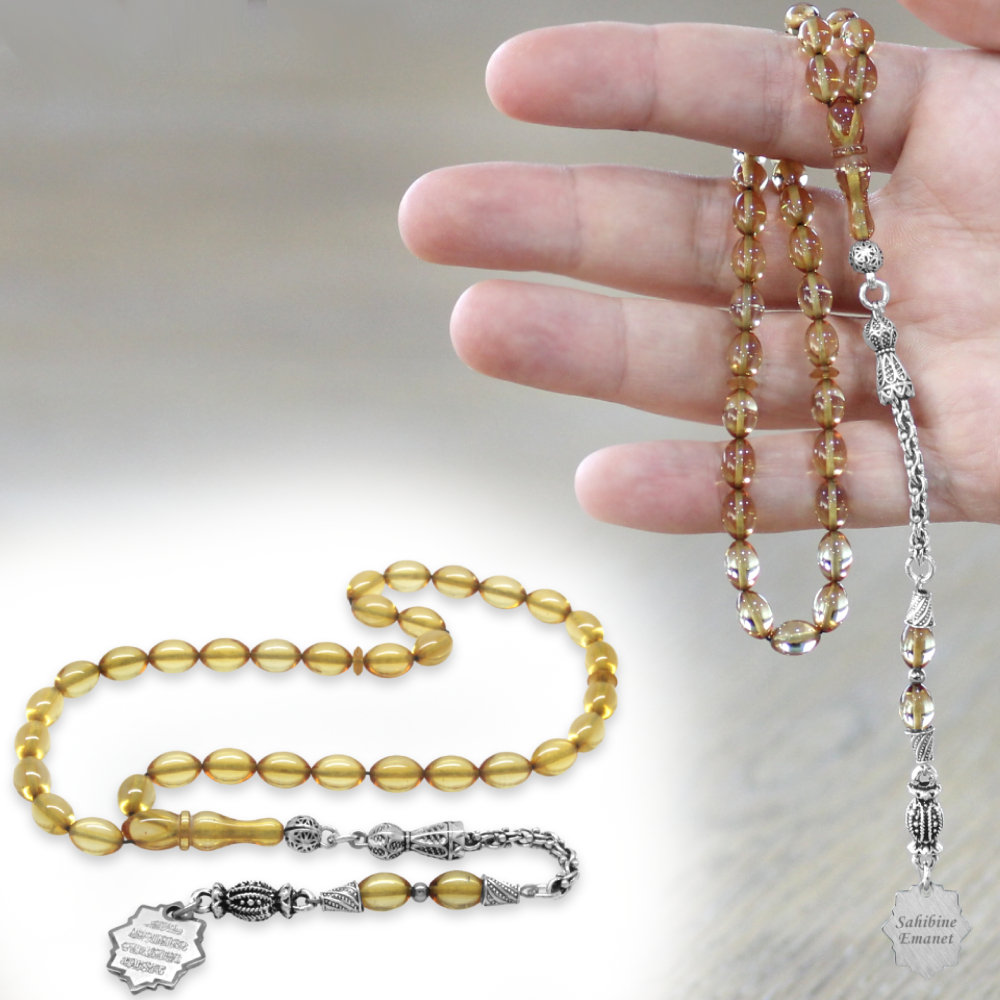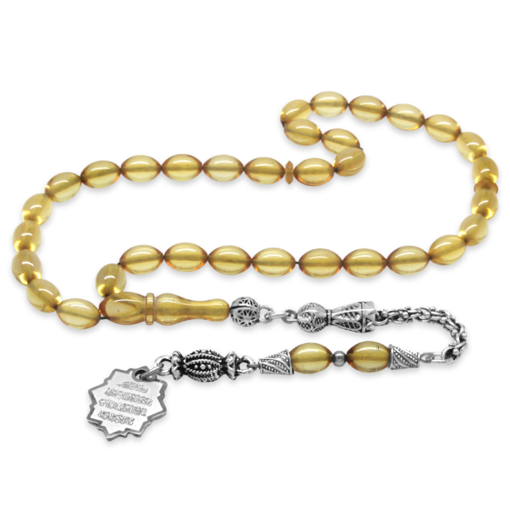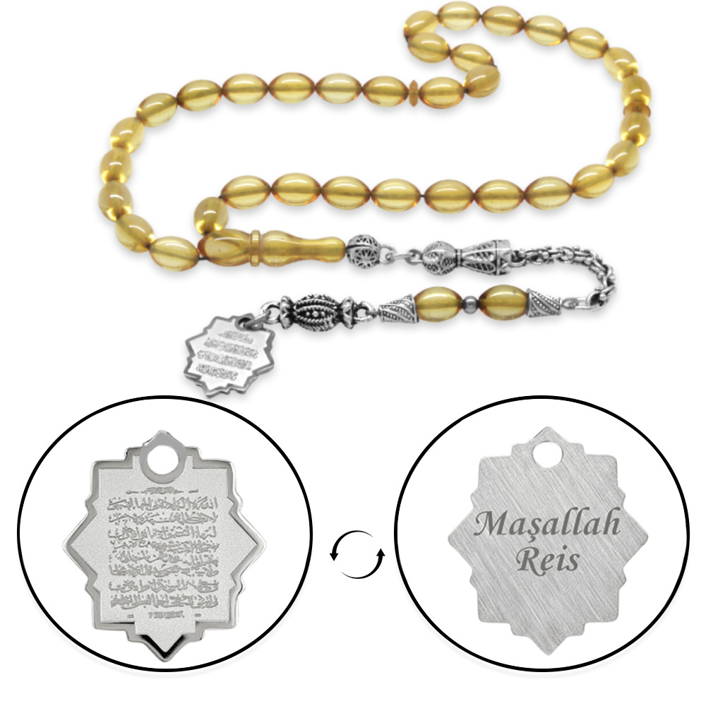 Ateş Kehribar Tesbih - Metal Püsküllü - Şeffaf Renk - Nazar Ayeti Uçlu İsme Özel Yazılı - Arpa Kesim
