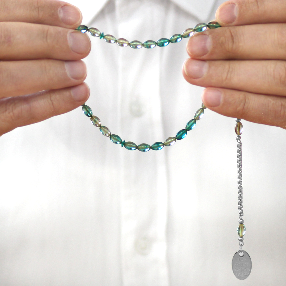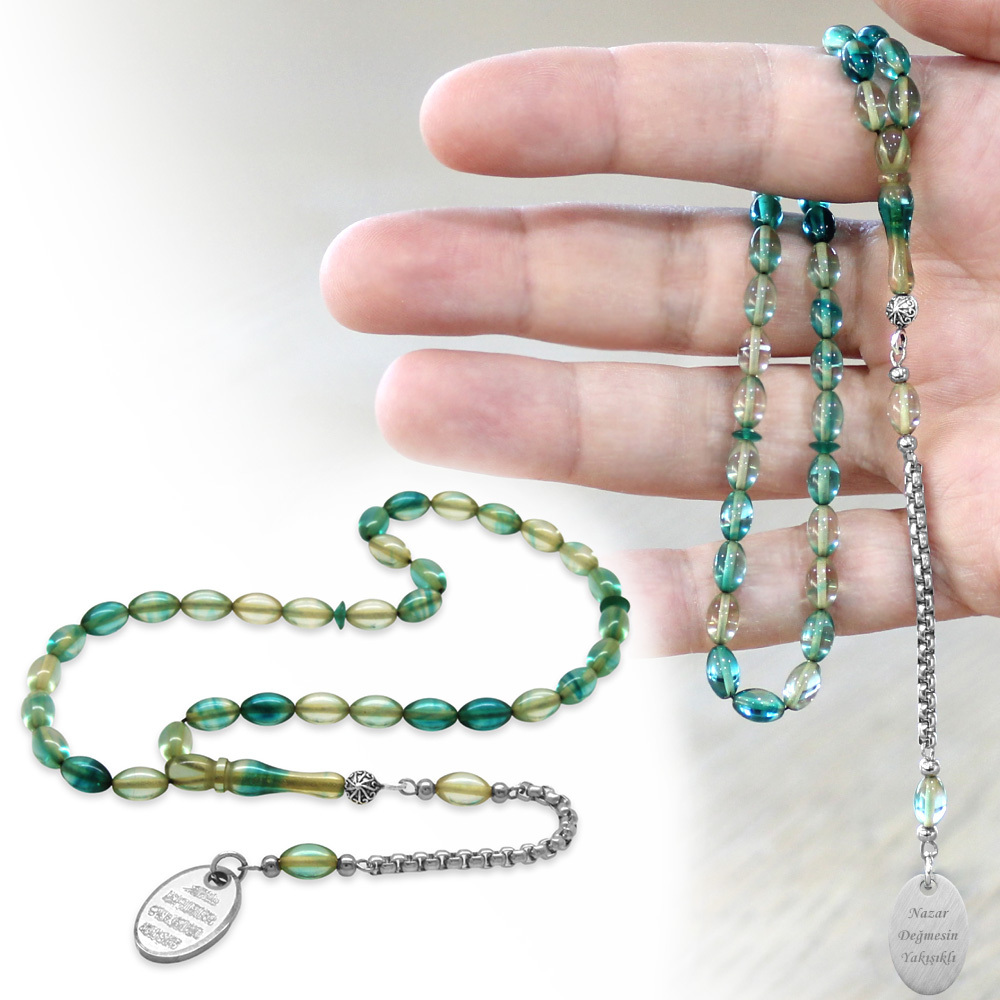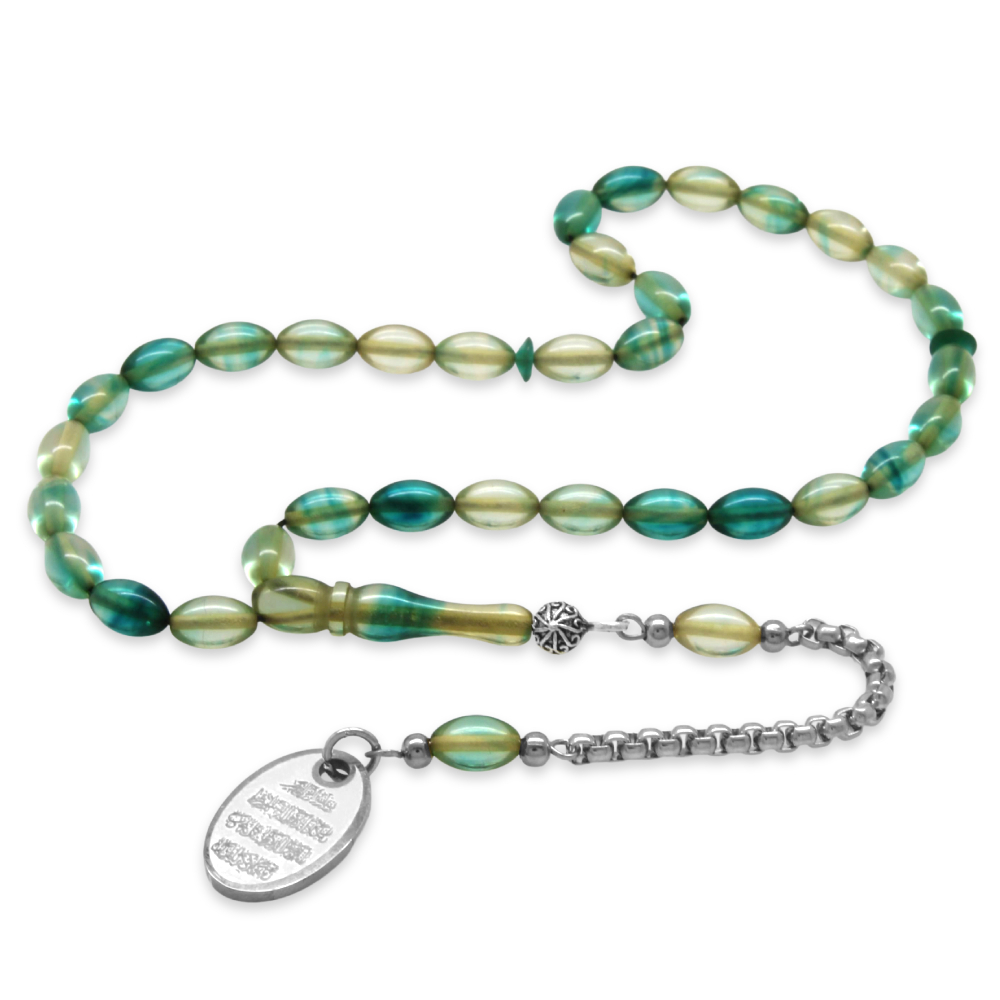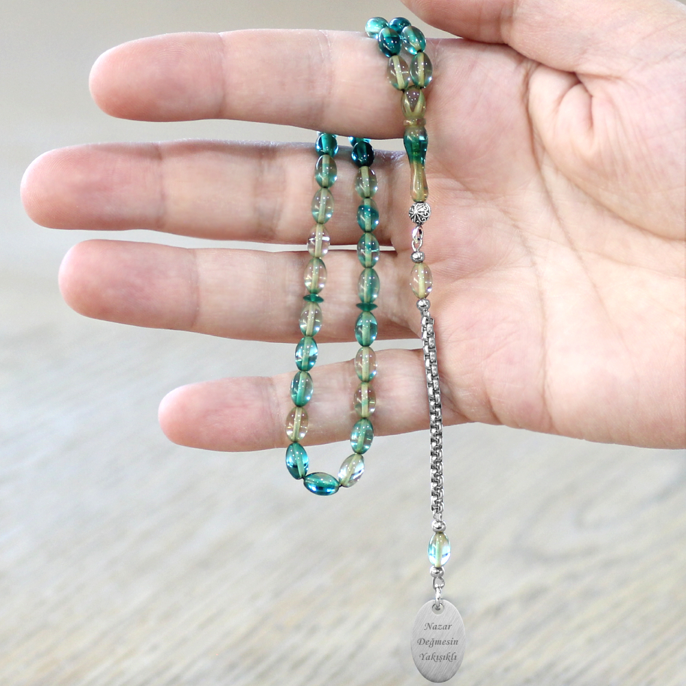 Ateş Kehribar Tesbih - Metal Püsküllü - Su Yeşili Turkuaz Renk - Nazar Ayeti Uçlu İsme Özel Yazılı