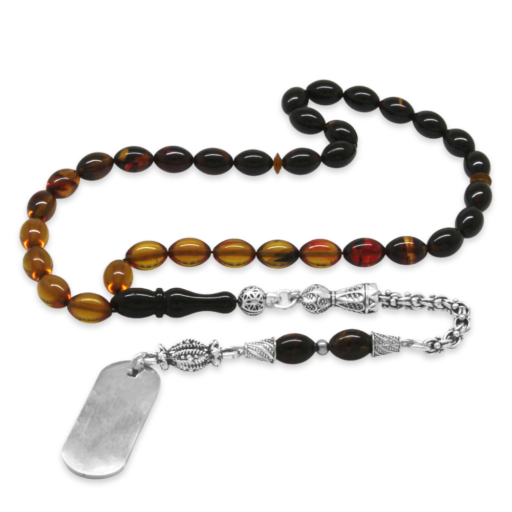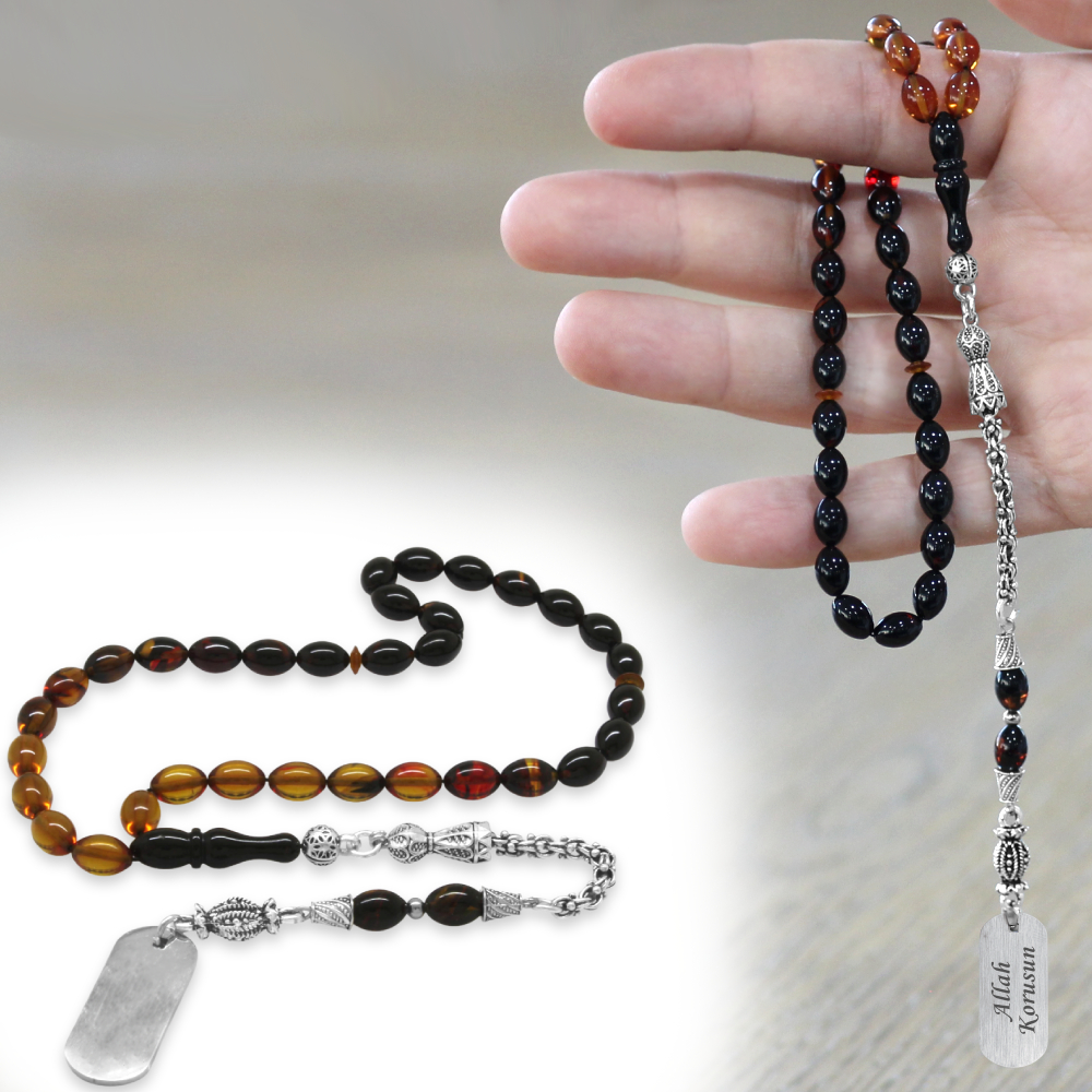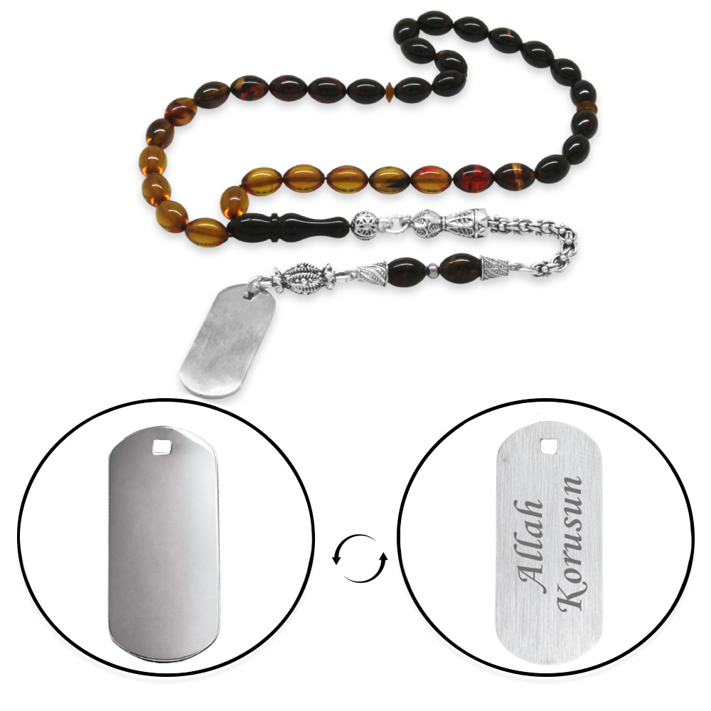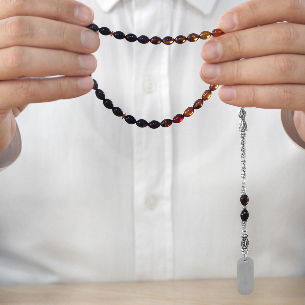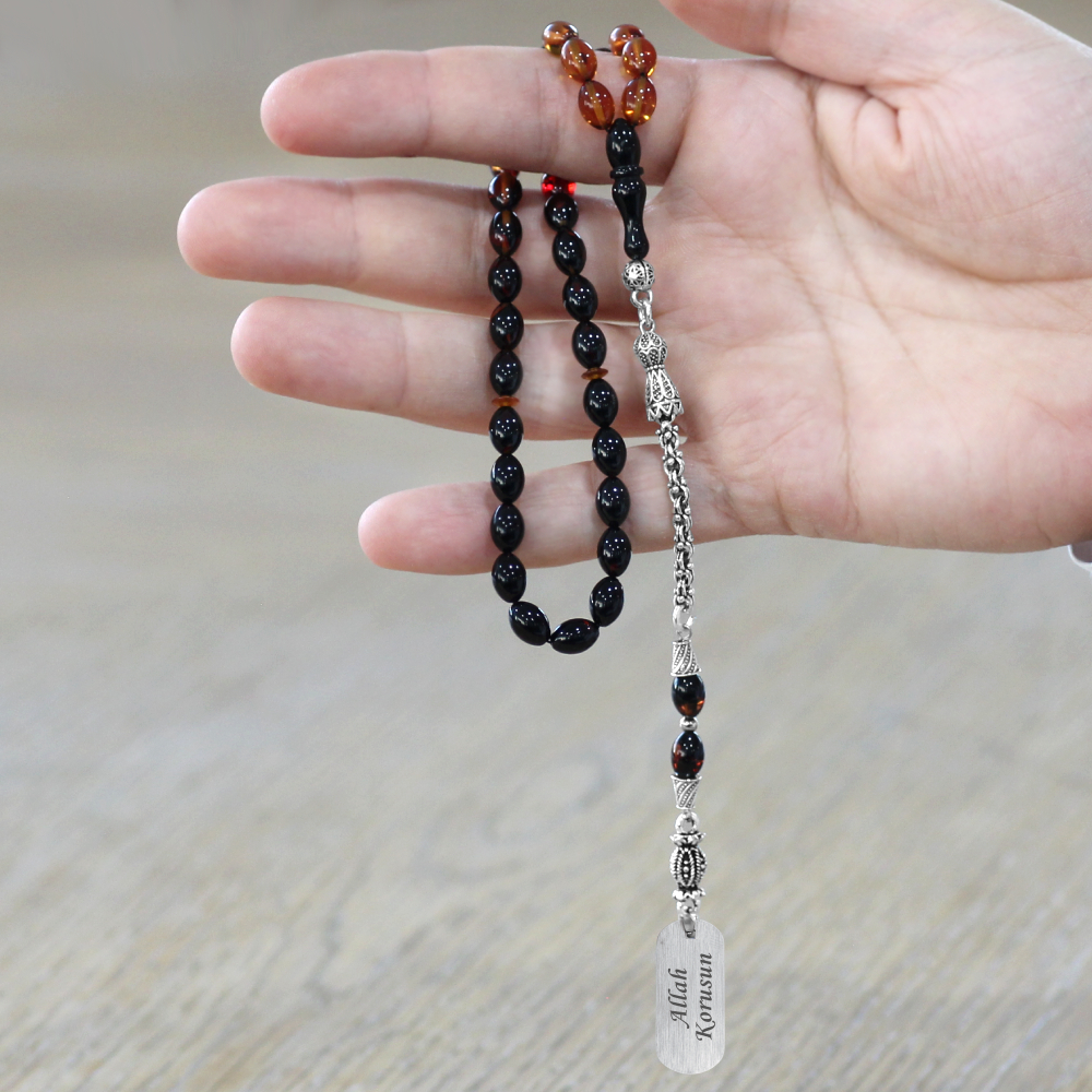 Ateş Kehribar Tesbih - Metal Püsküllü - Süzme Bala Siyah Renk - İsme Özel Yazılı - Arpa Kesim