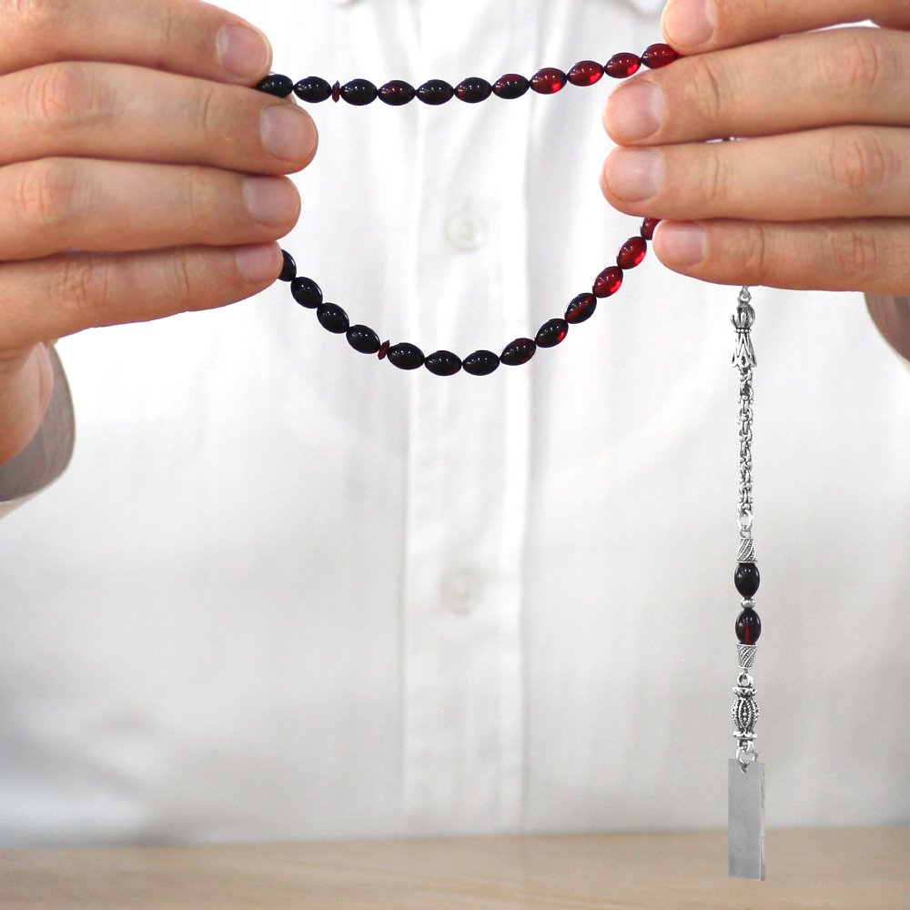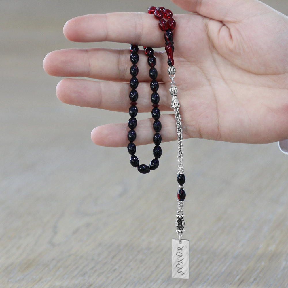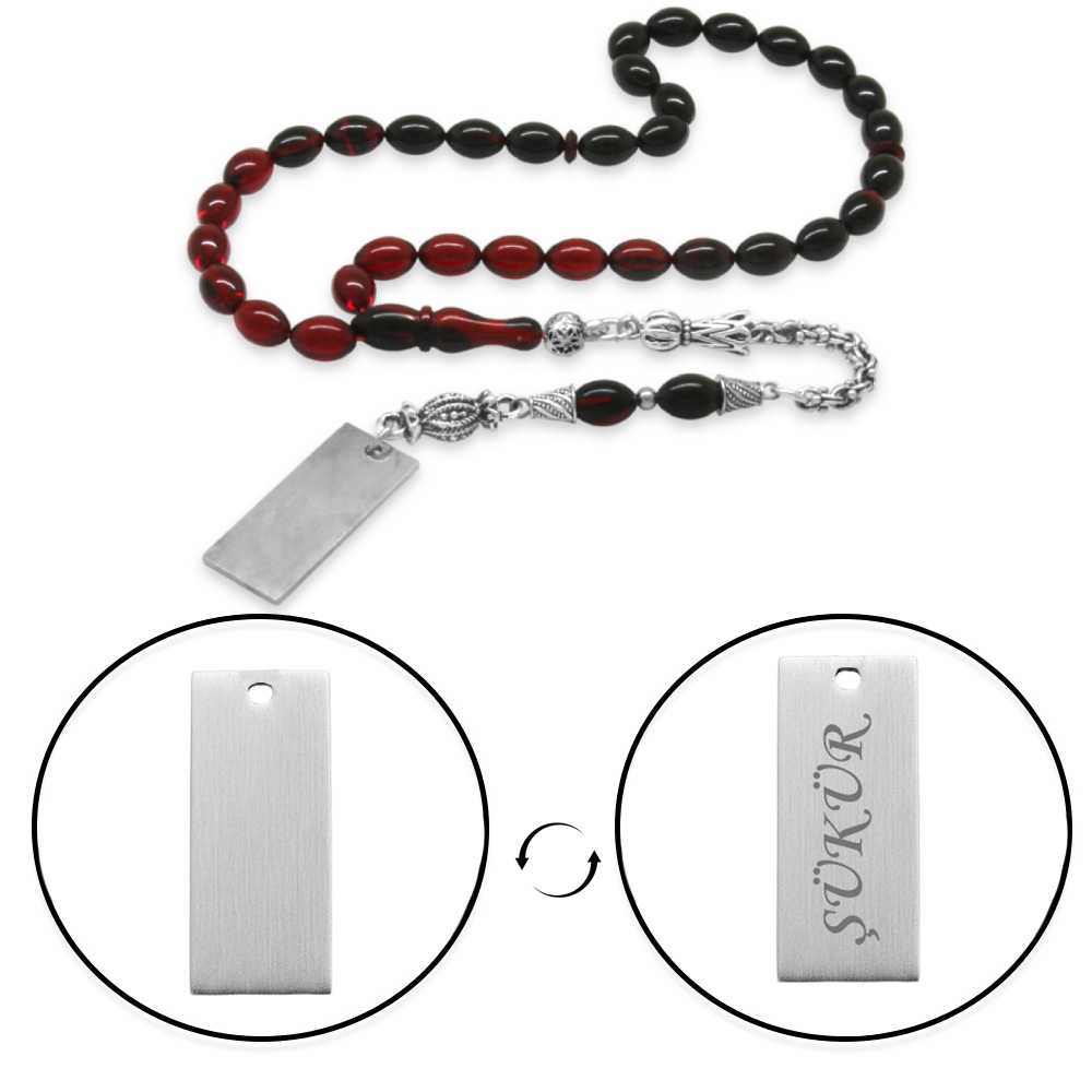 Ateş Kehribar Tesbih - Metal Püsküllü - Süzme Kırmızı Siyah Renk - İsme Özel Yazılı - Arpa Kesim