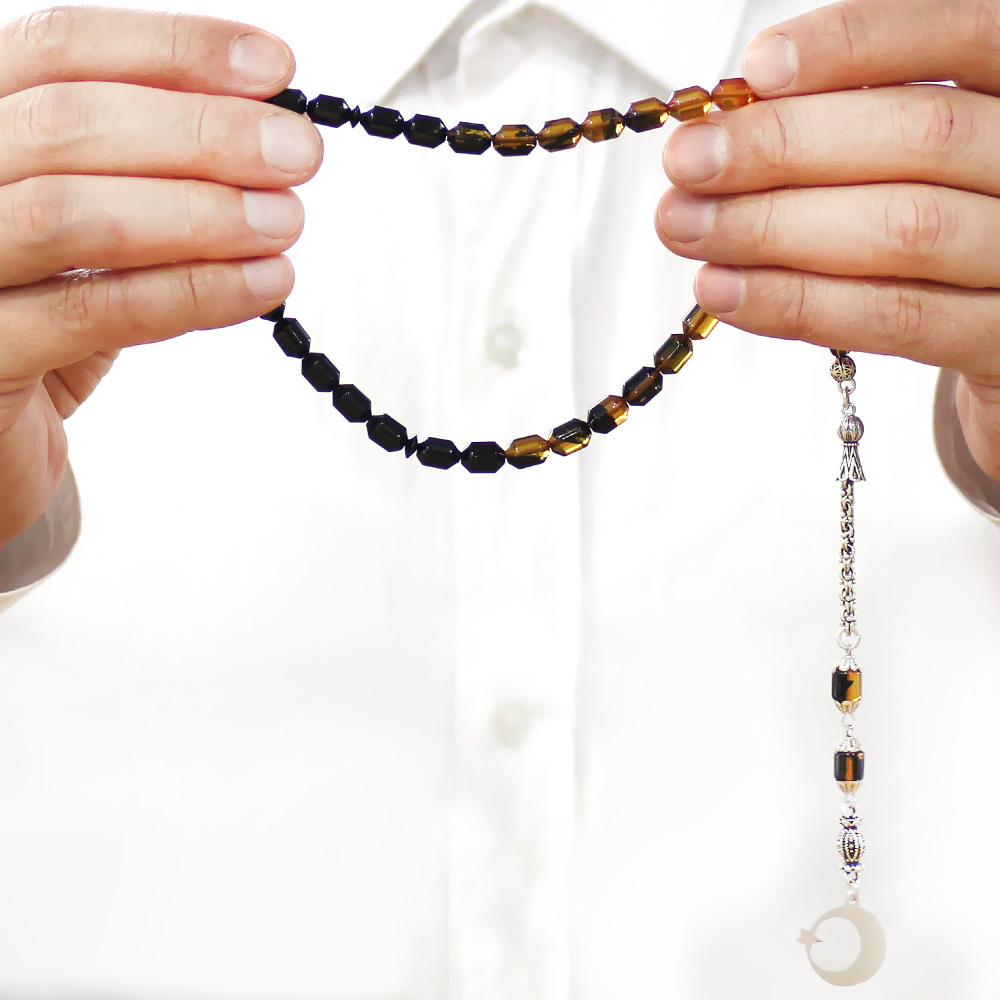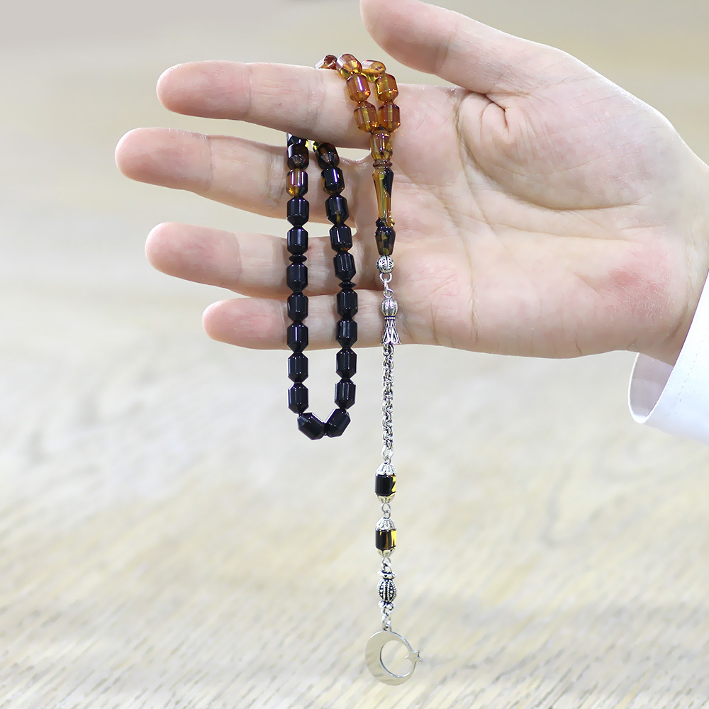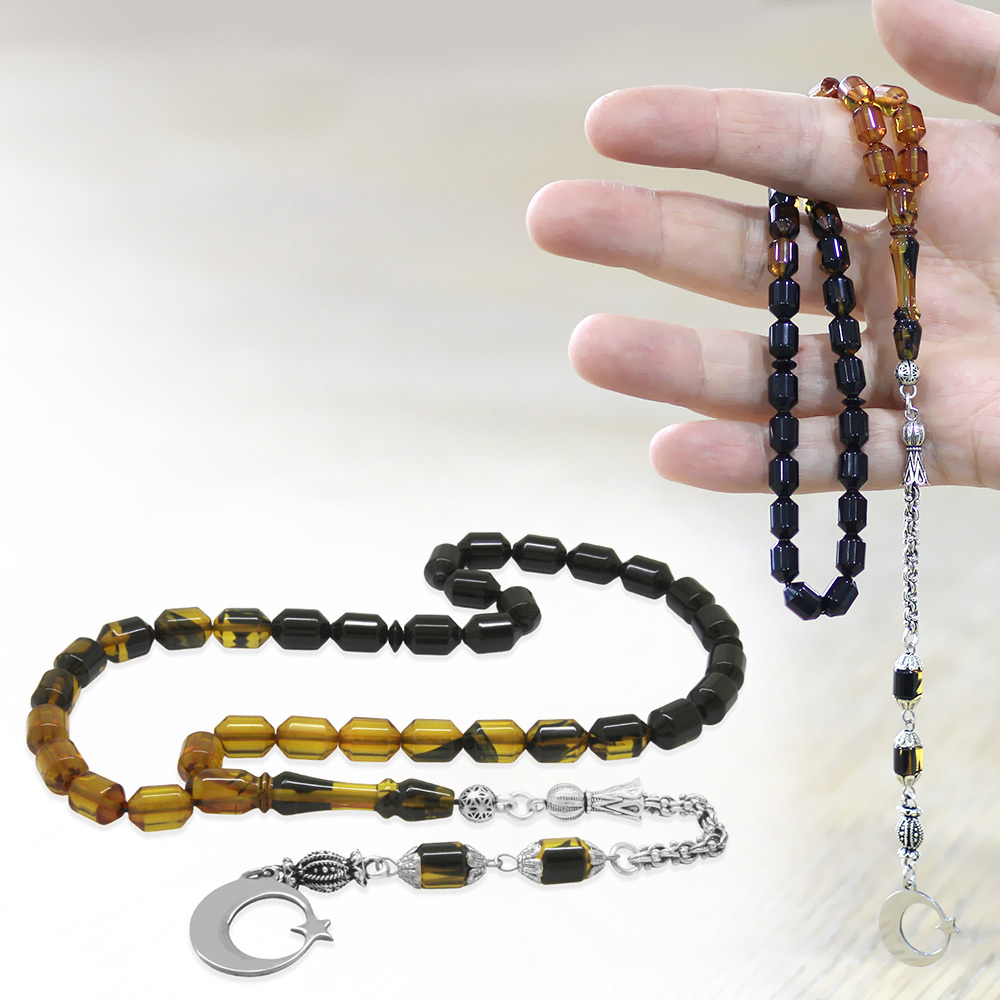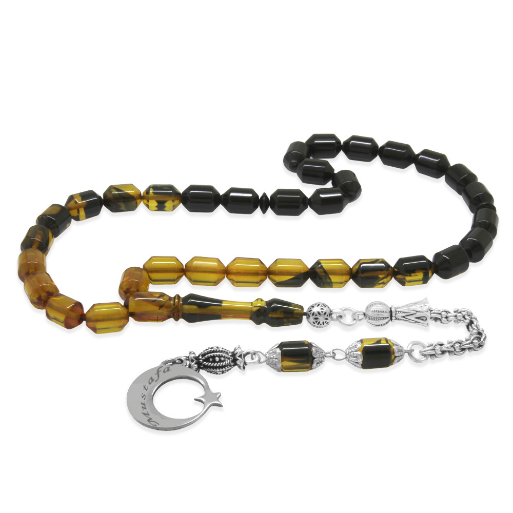 Ateş Kehribar Tesbih - Metal Püsküllü - Süzme Sarı Siyah - İsme Özel Yazılı - Kapsül Kesim
