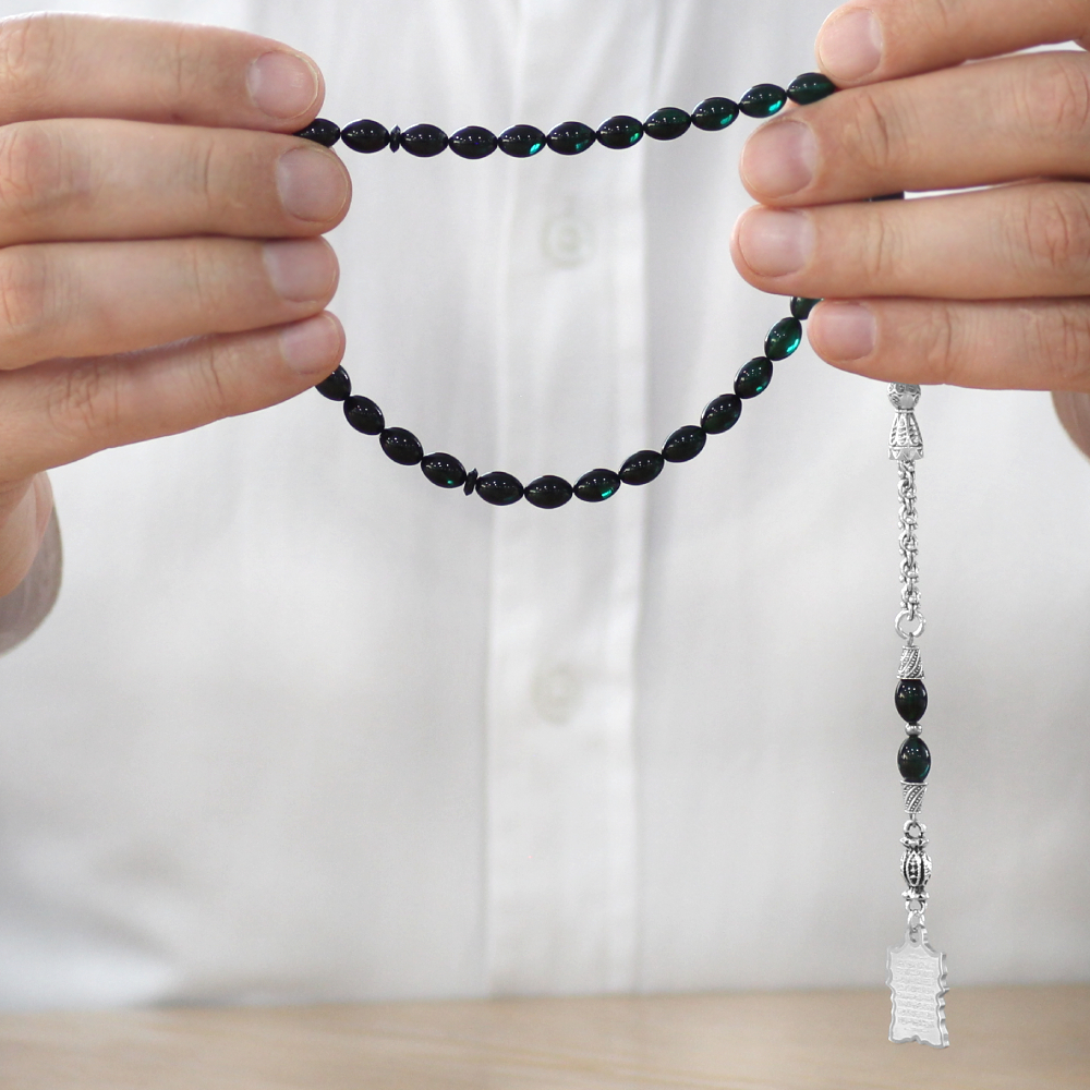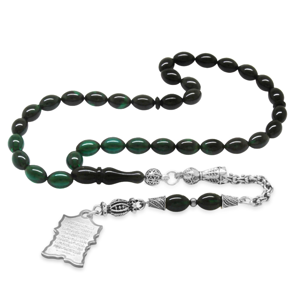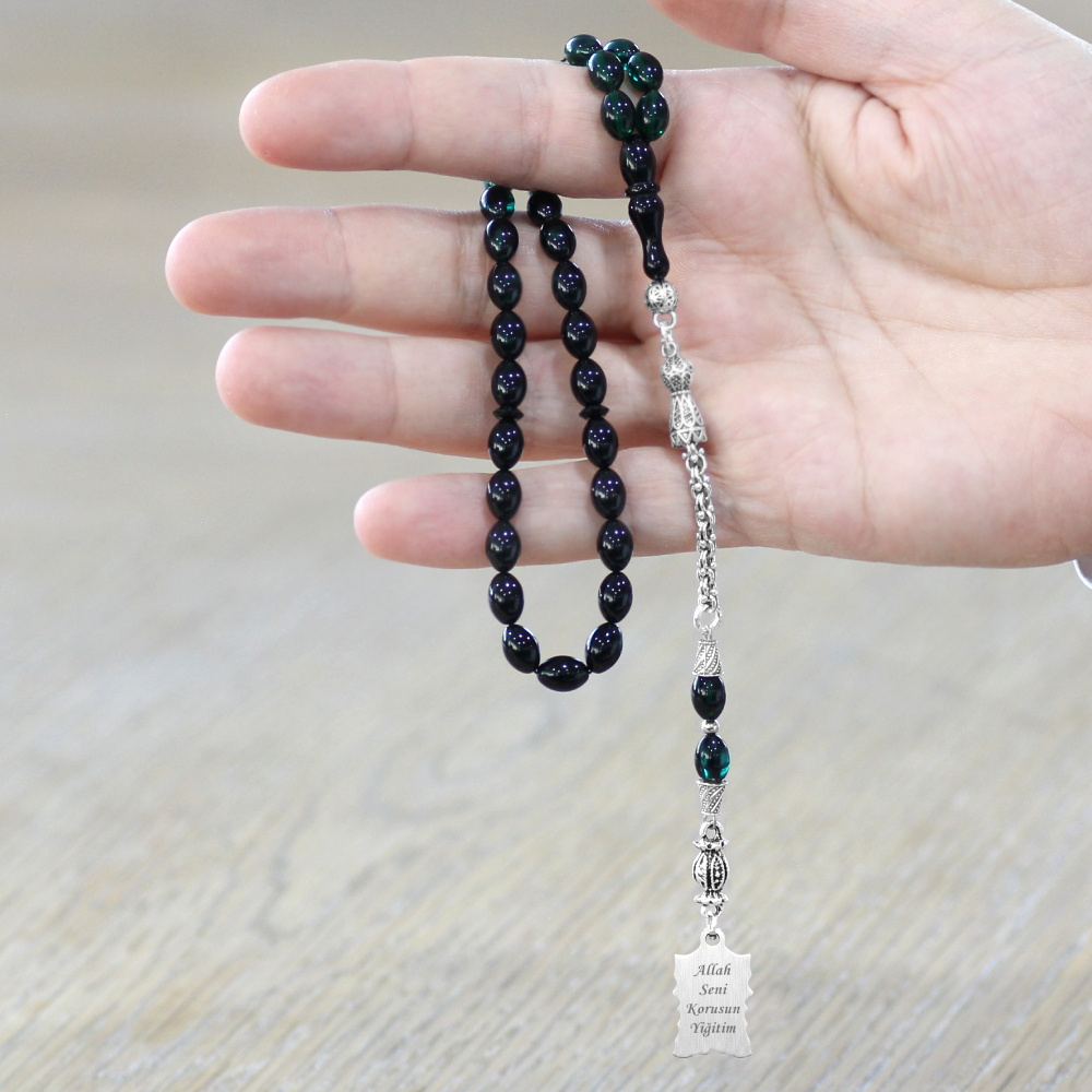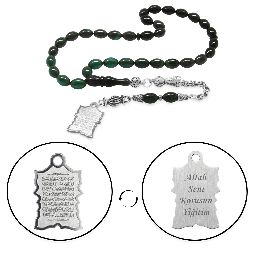 Ateş Kehribar Tesbih - Metal Püsküllü - Süzme Turkuaz Siyah - Ayetel Kürsi Uçlu İsme Özel Yazılı