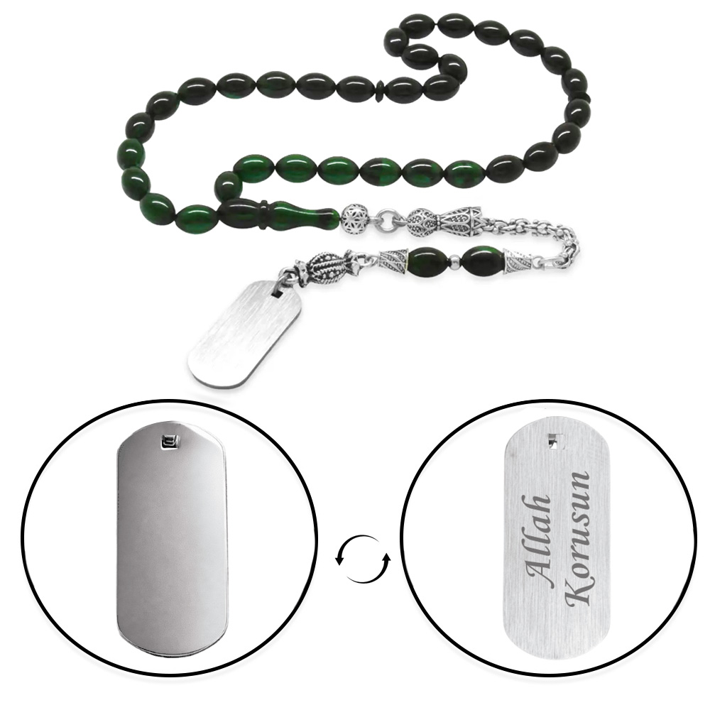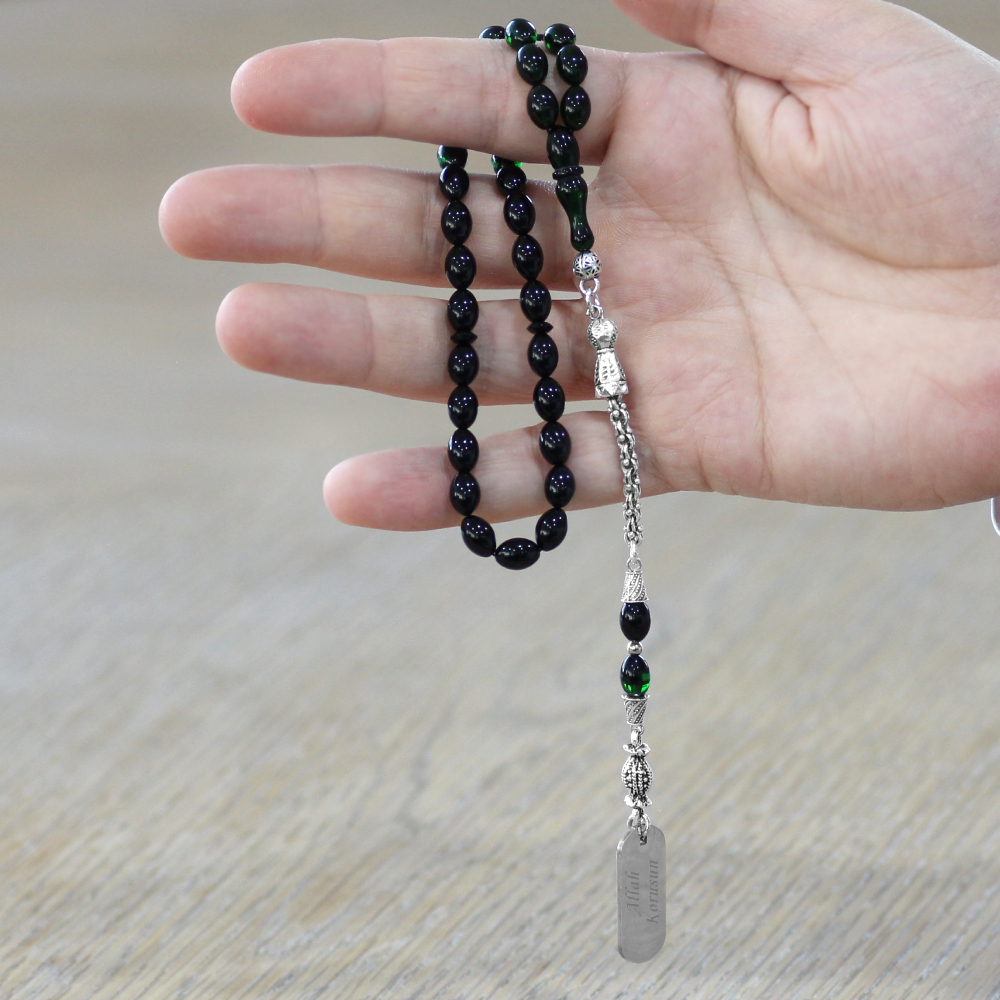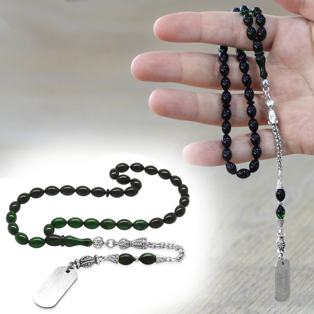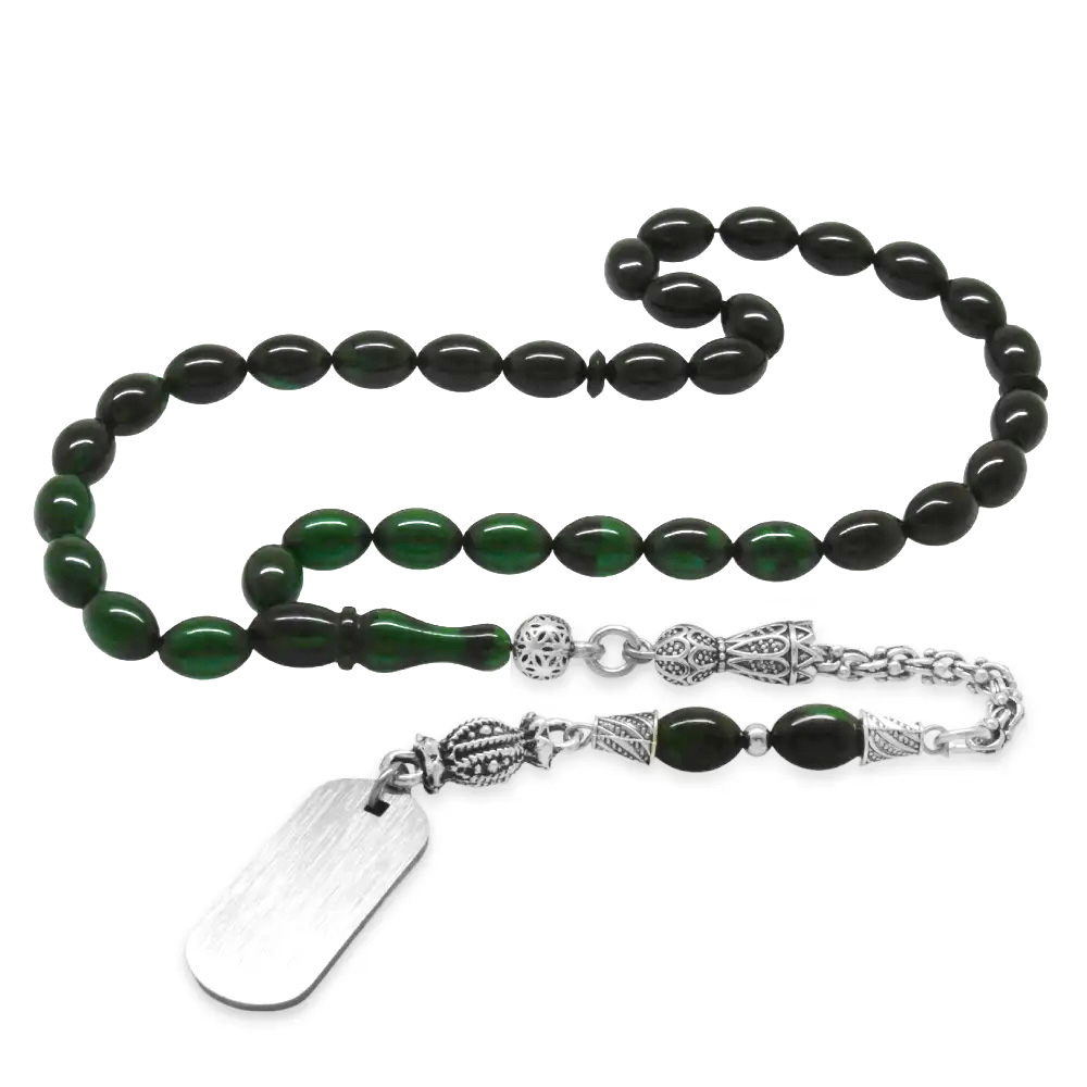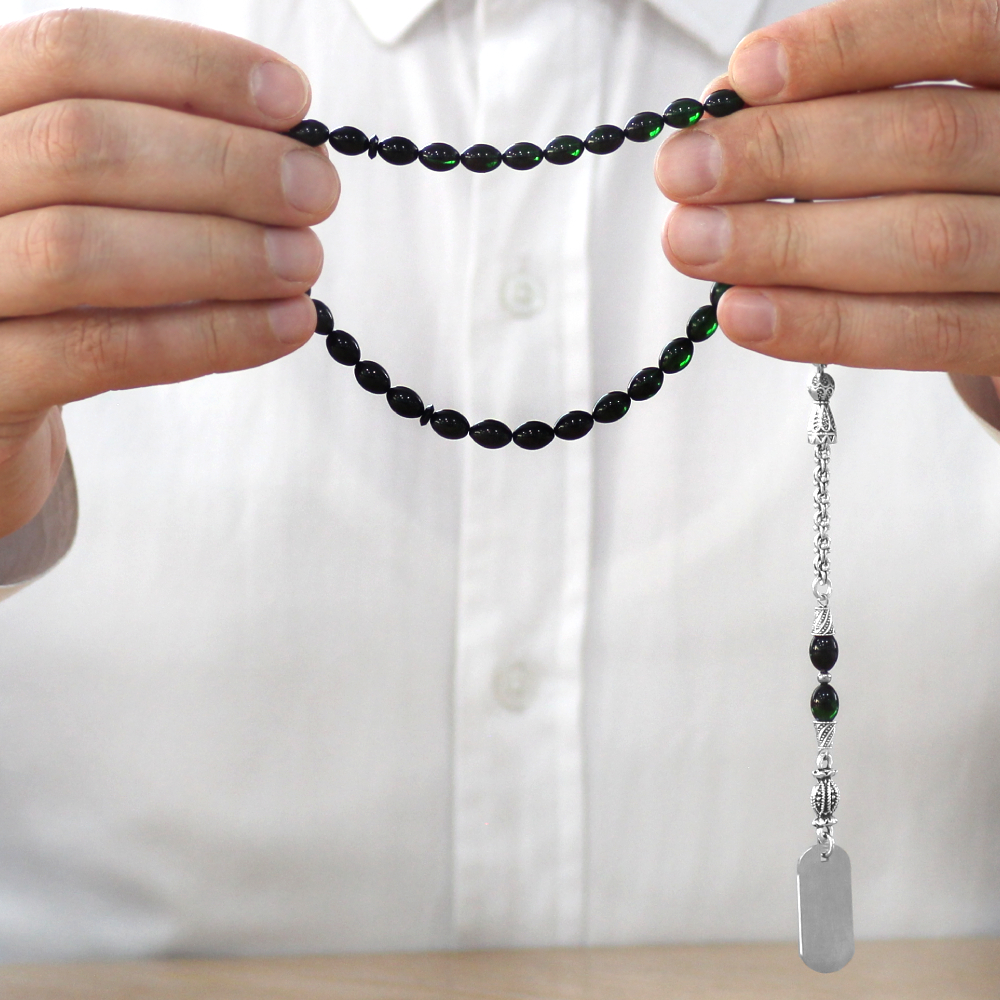Ateş Kehribar Tesbih - Metal Püsküllü - Süzme Yeşil Siyah Renk - İsme Özel Yazılı - Arpa Kesim