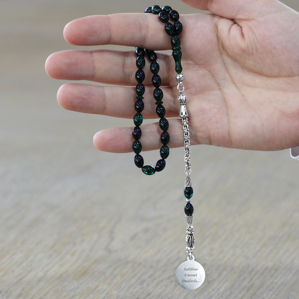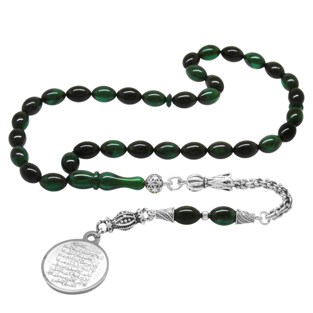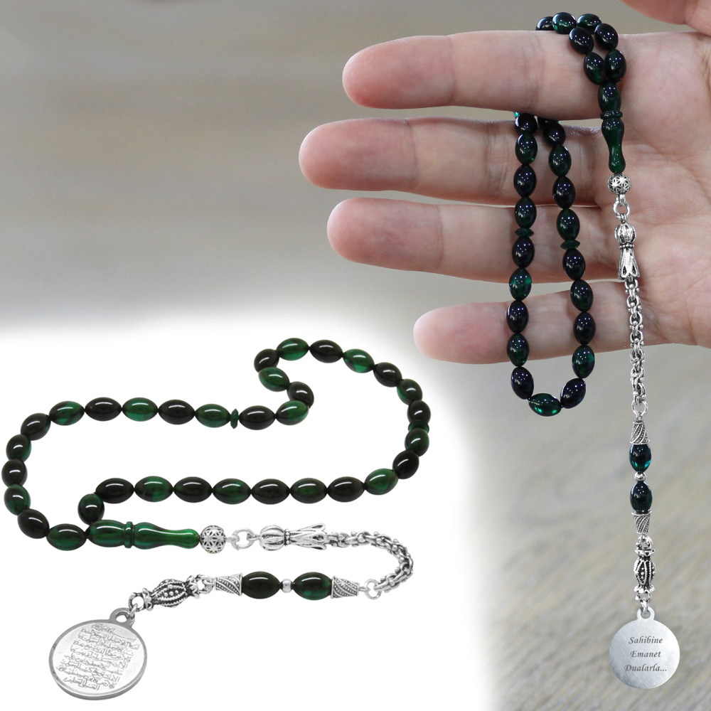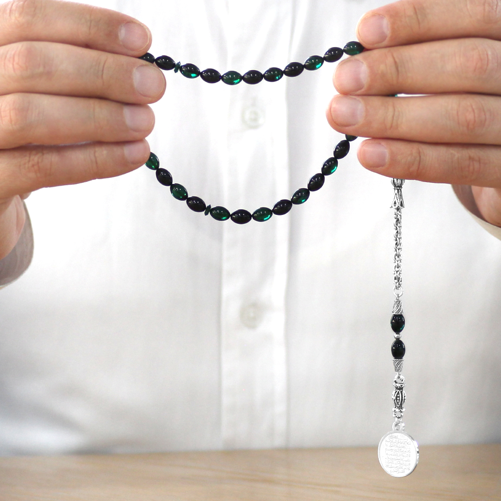 Ateş Kehribar Tesbih - Metal Püsküllü - Turkuaz Siyah Renk - Ayetel Kürsi Uçlu İsme Özel Yazılı