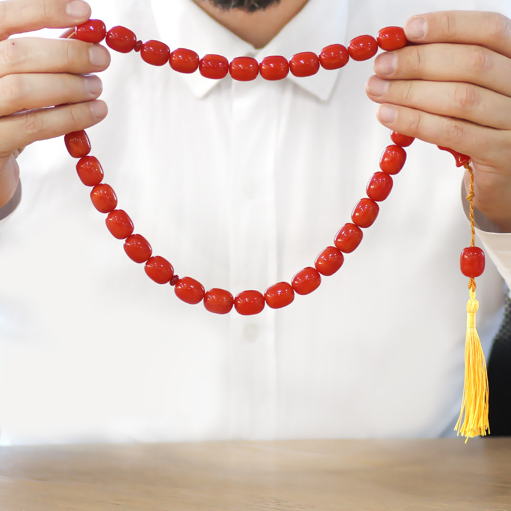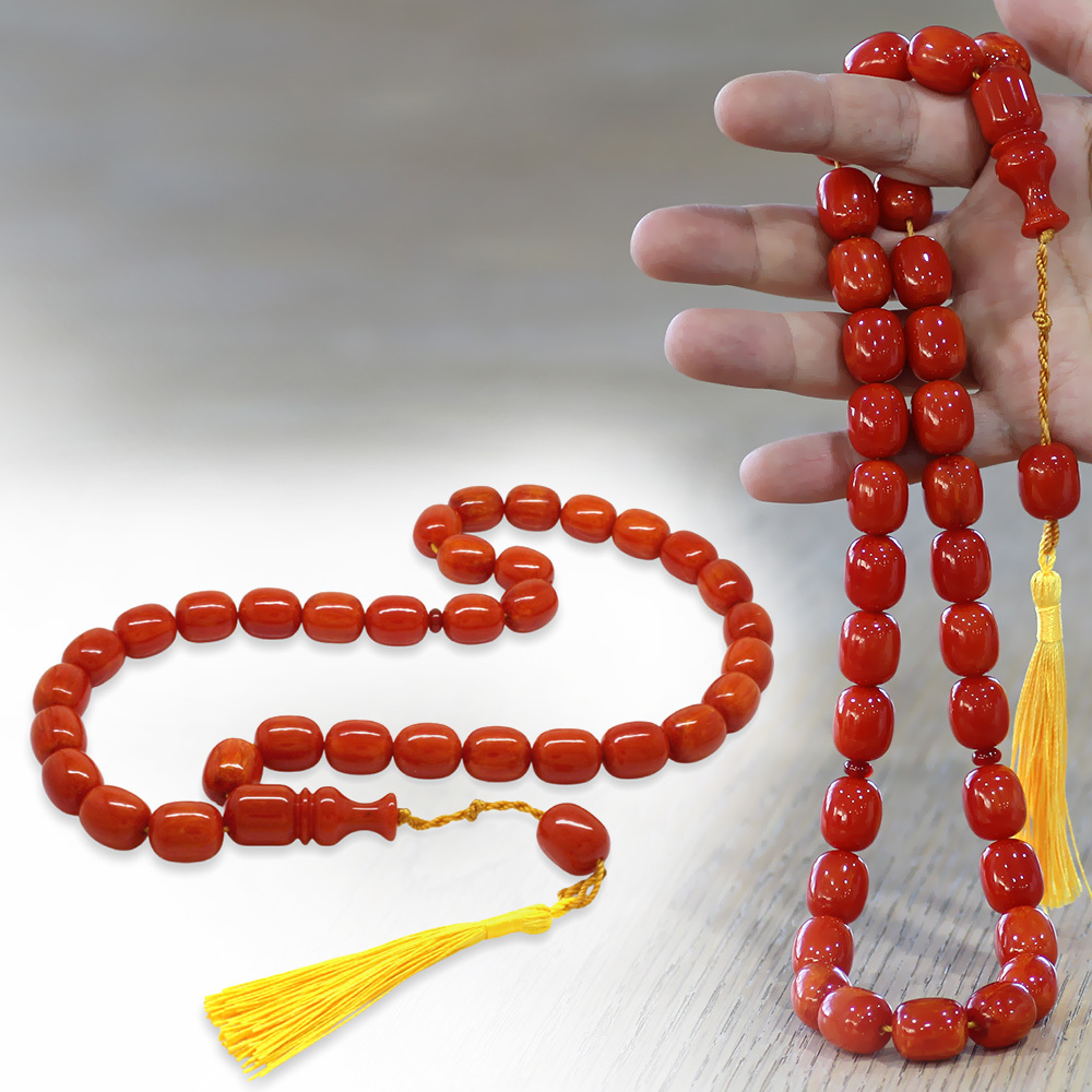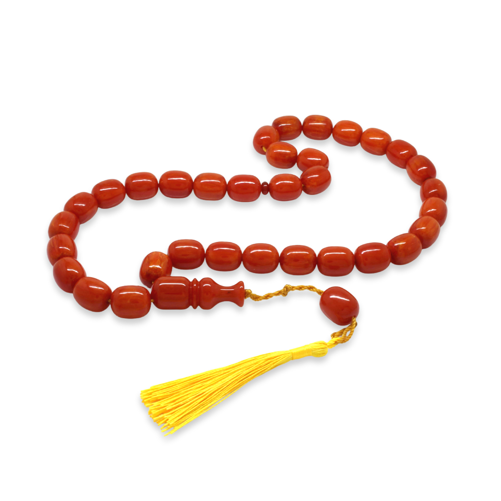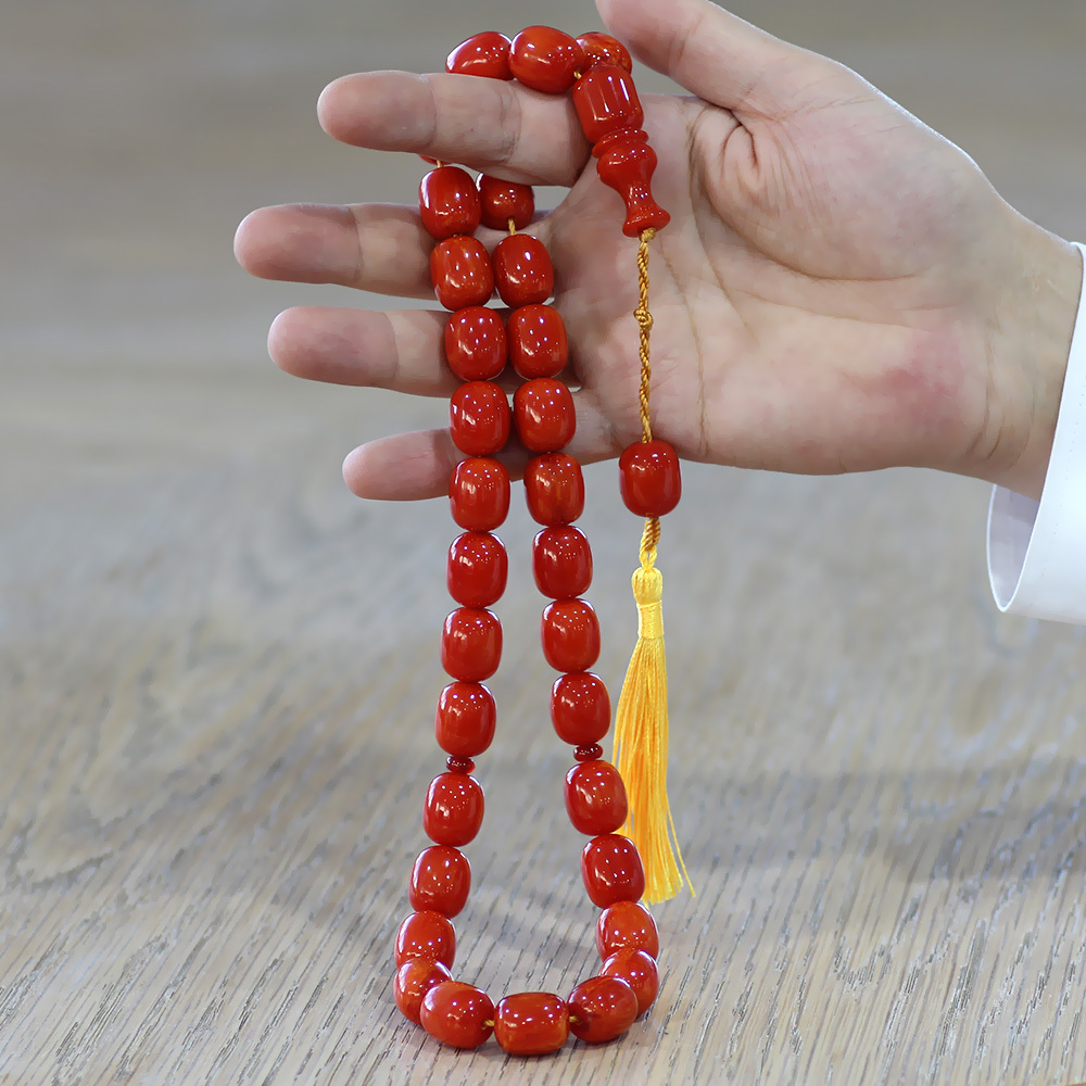 Ateş Kehribar Tesbih - Osmanlı Saray Püsküllü - Mega Boy - Açık Kırmızı Renk - Kapsül Kesim