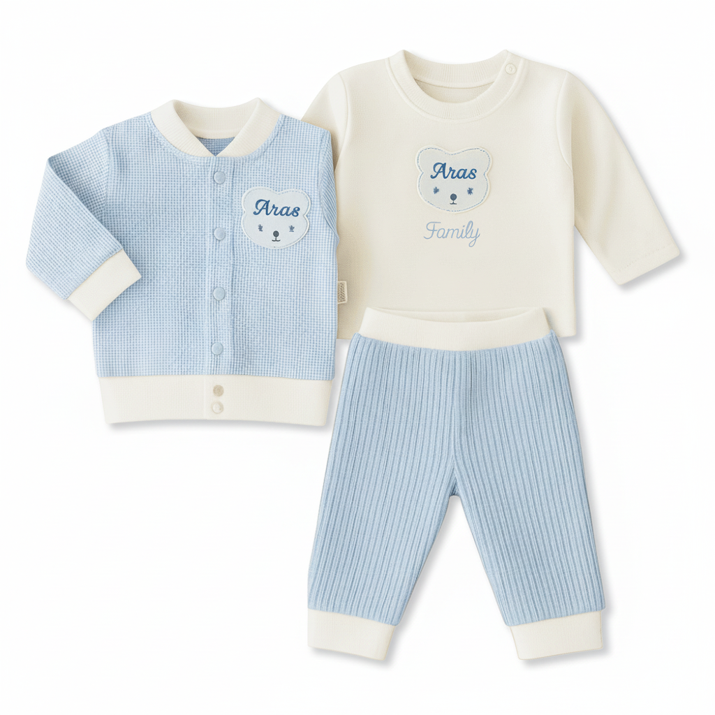 Ayıcık desenli, isme özel nakışlı mavi-beyaz 3’lü set; 3-6 aylık bebekler için ideal bir kullanım sunar. Alt, üst ve hırkadan oluşan bu takım, %100 pamuk penye kumaşıyla hem yumuşak hem de nefes alabilen bir yapıdadır. Sevimli tasarımı ve kişiselleştirilebilir yapısıyla bu set, hem günlük kullanım hem de özel günlerde şık bir bebek hediyesi olarak tercih edilebilir. Bebeğinizin konforunu ve tarzını bir arada sunar.