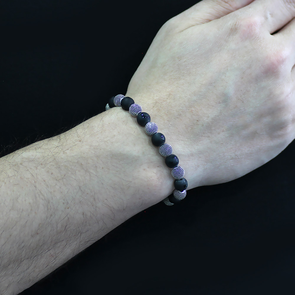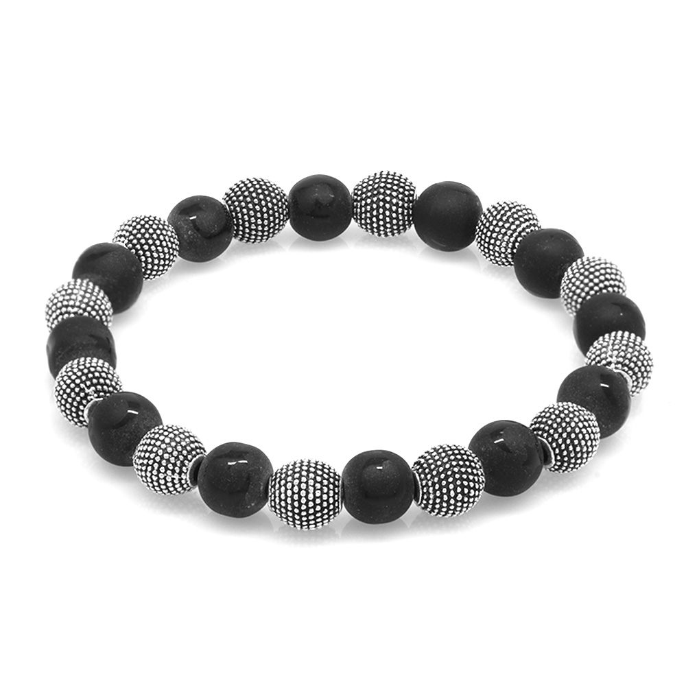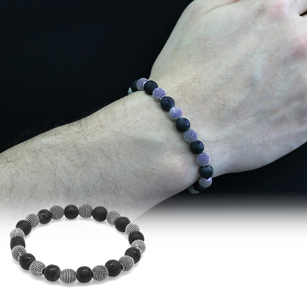 Oniks Doğaltaş Bileklik - Ayyıldız Desenli - Metal Kombinli - Küre Kesim