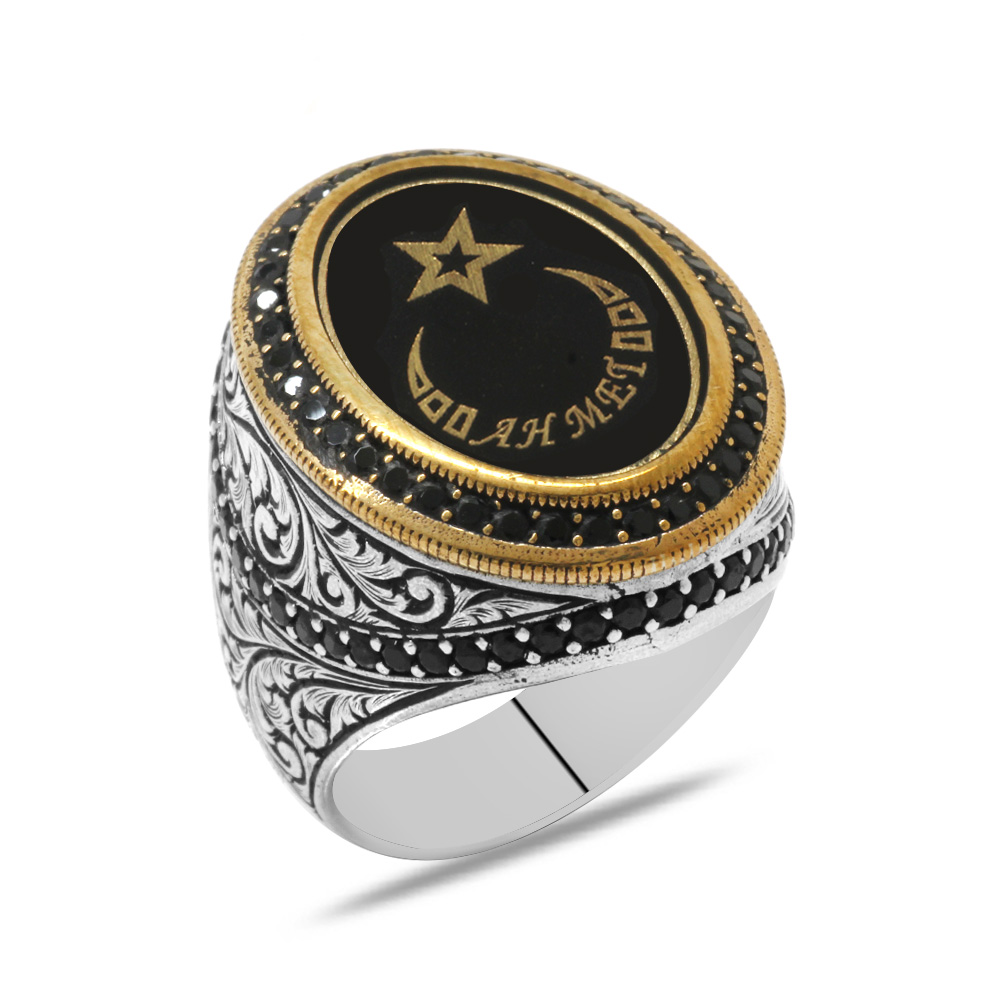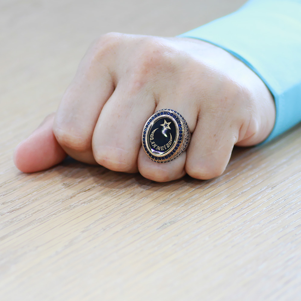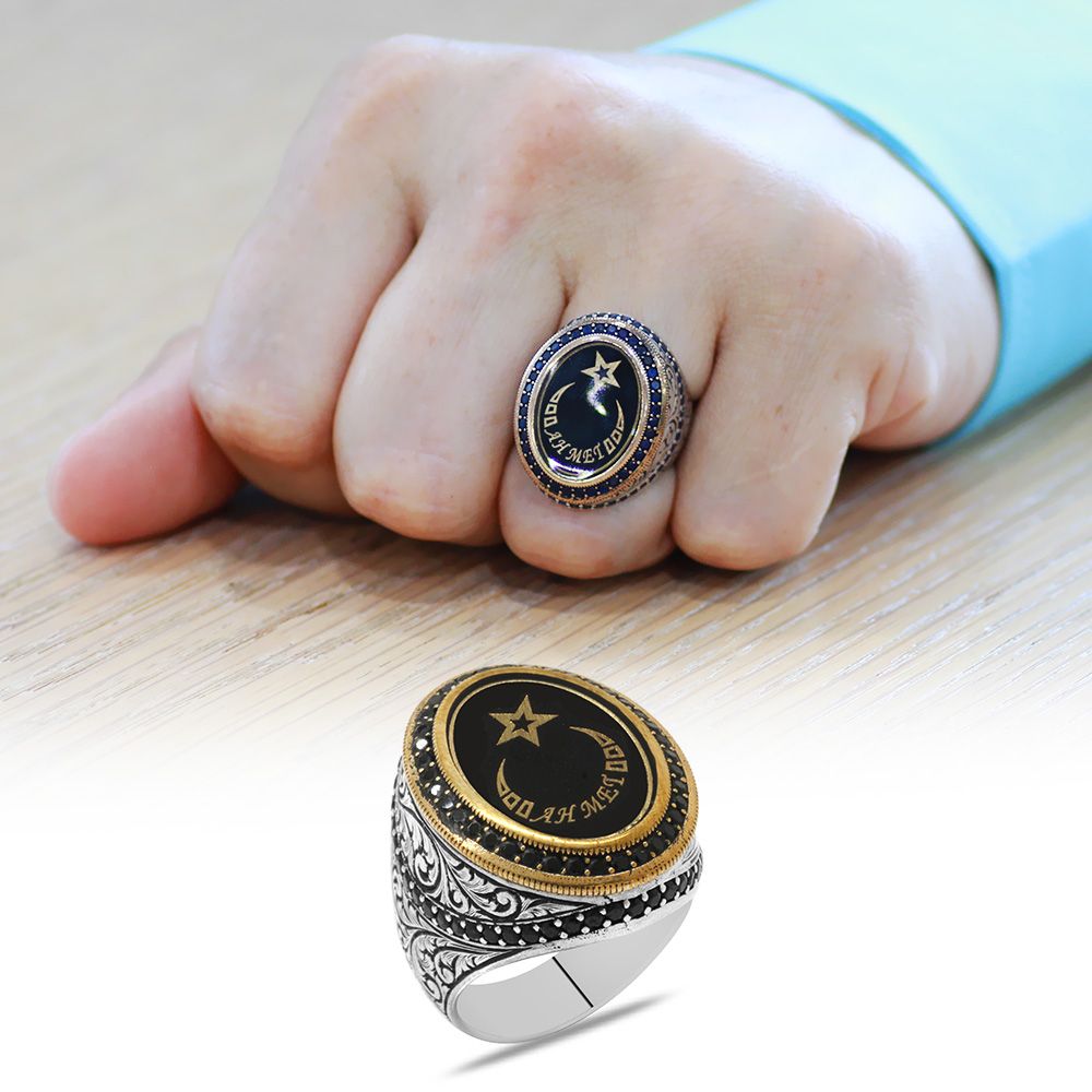 Ayyıldız Tasarım İsme Özel Yazılı Mineli 925 Ayar Gümüş Erkek Yüzük