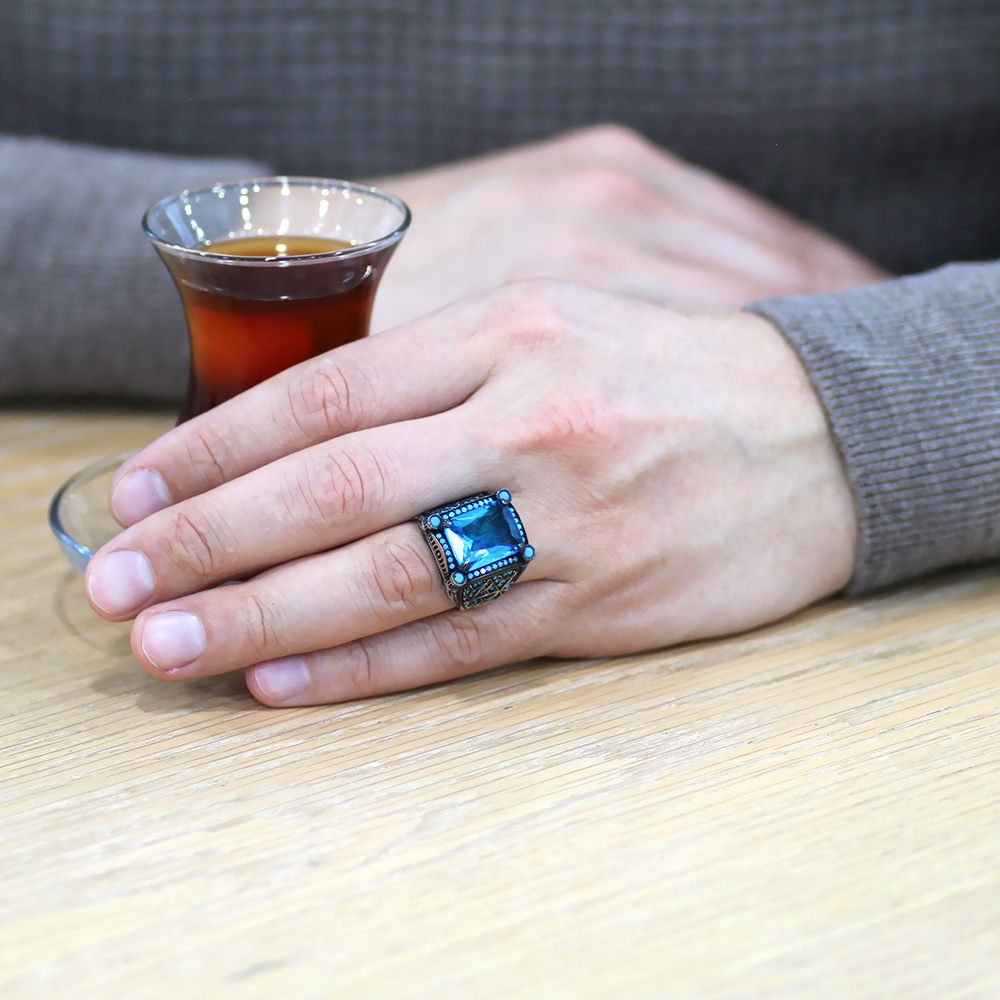 Baget Kesim Aqua Zirkon Taşlı Geometrik Tasarım 925 Ayar Gümüş Erkek Yüzük