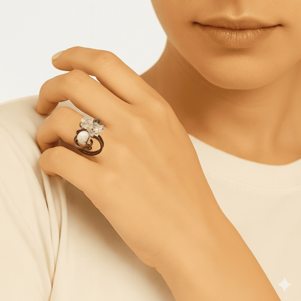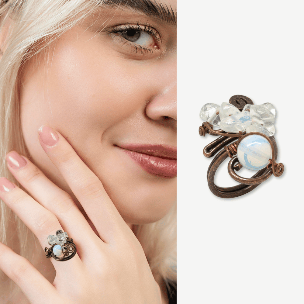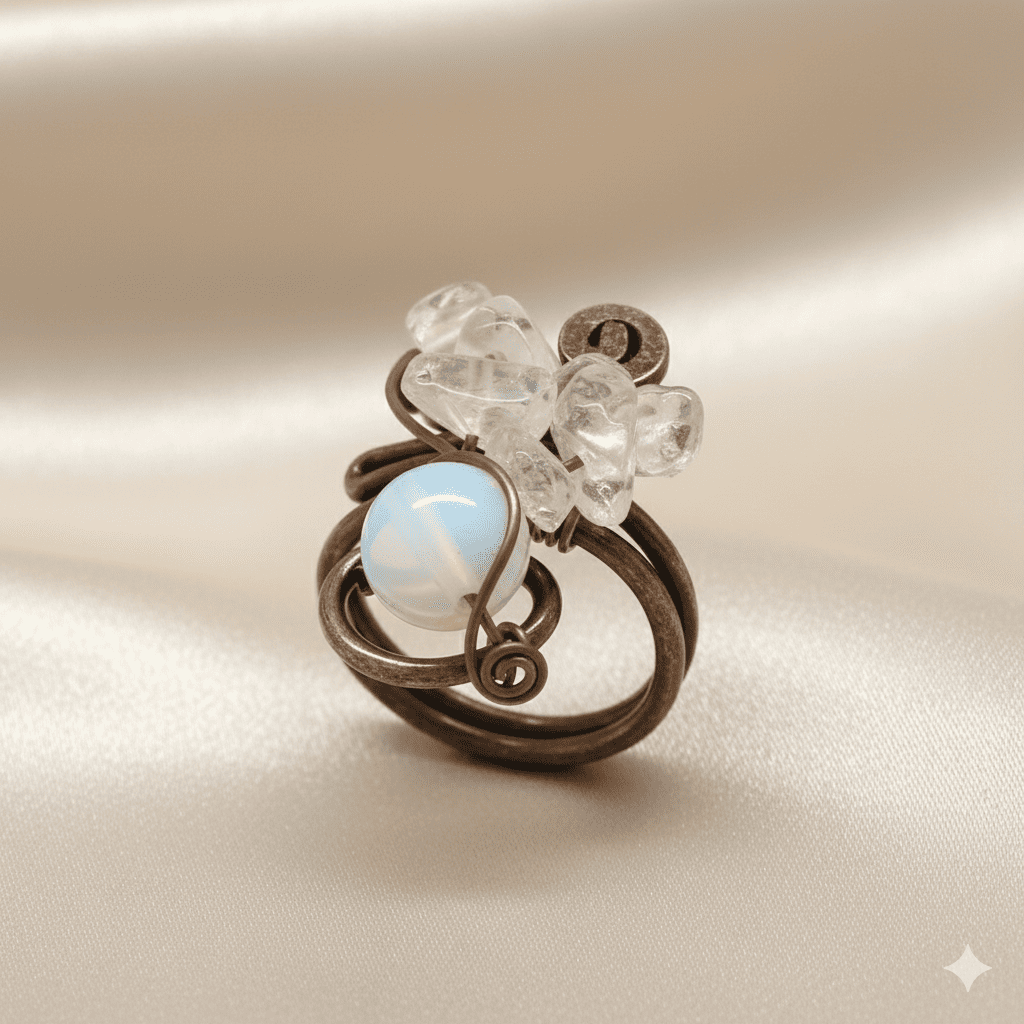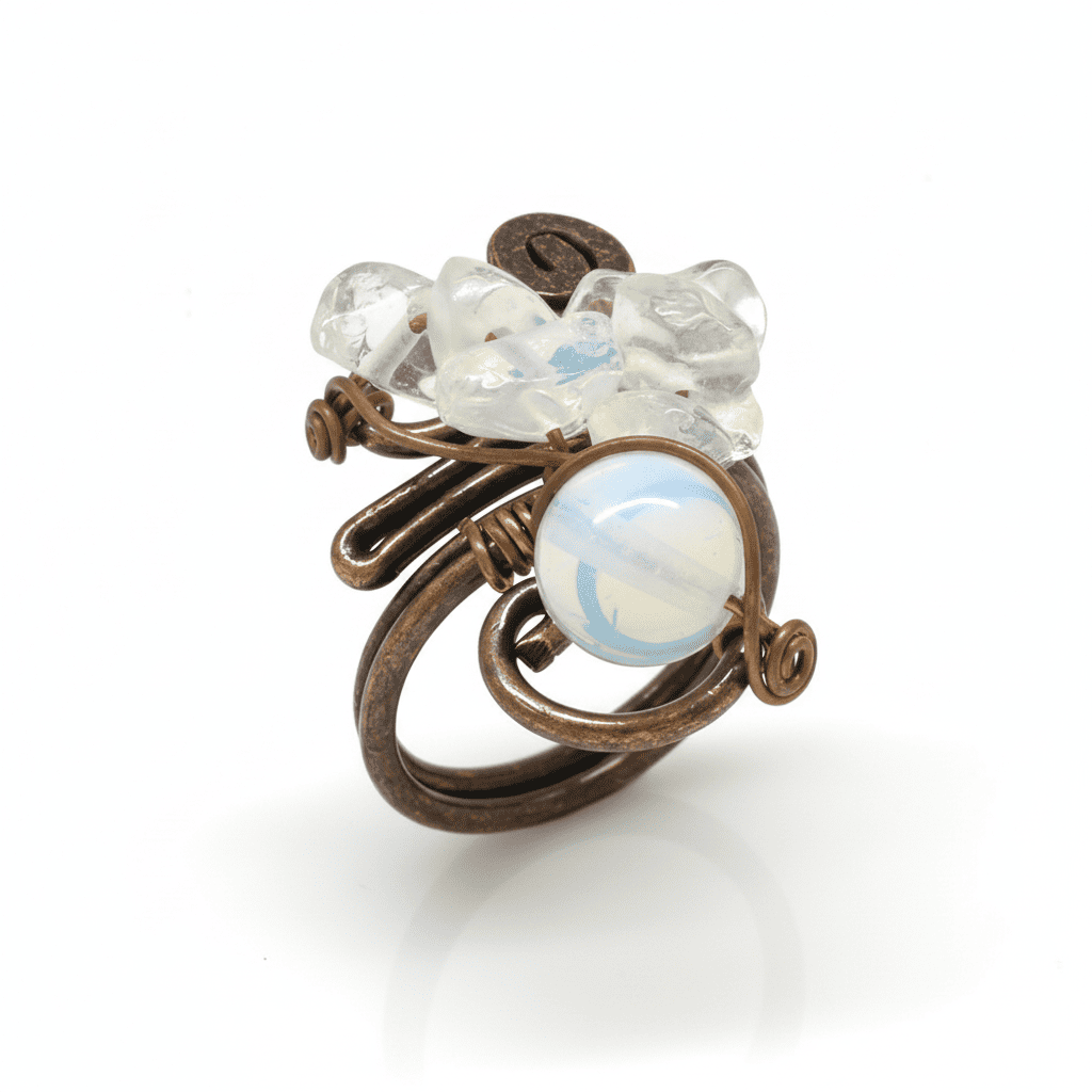 Bakır Bronz Alaşım Kadın Yüzük - Amorf Beyaz Kuvars Doğaltaşlı - Retro Tasarım - Ayarlanabilir Ölçü
