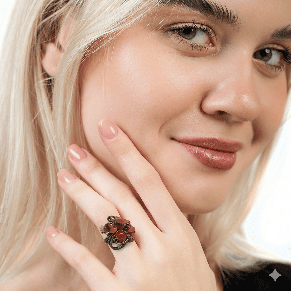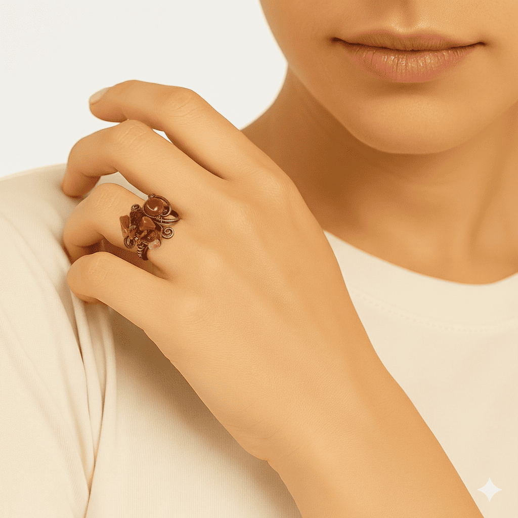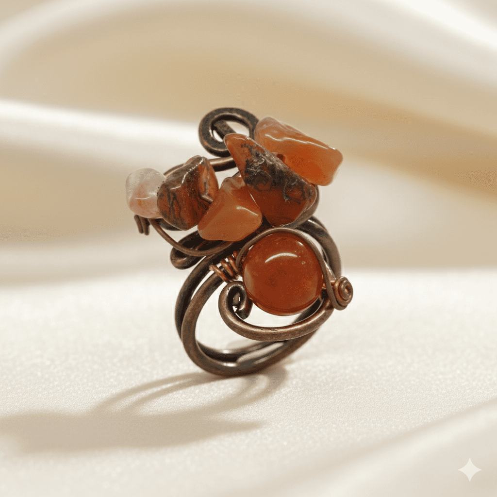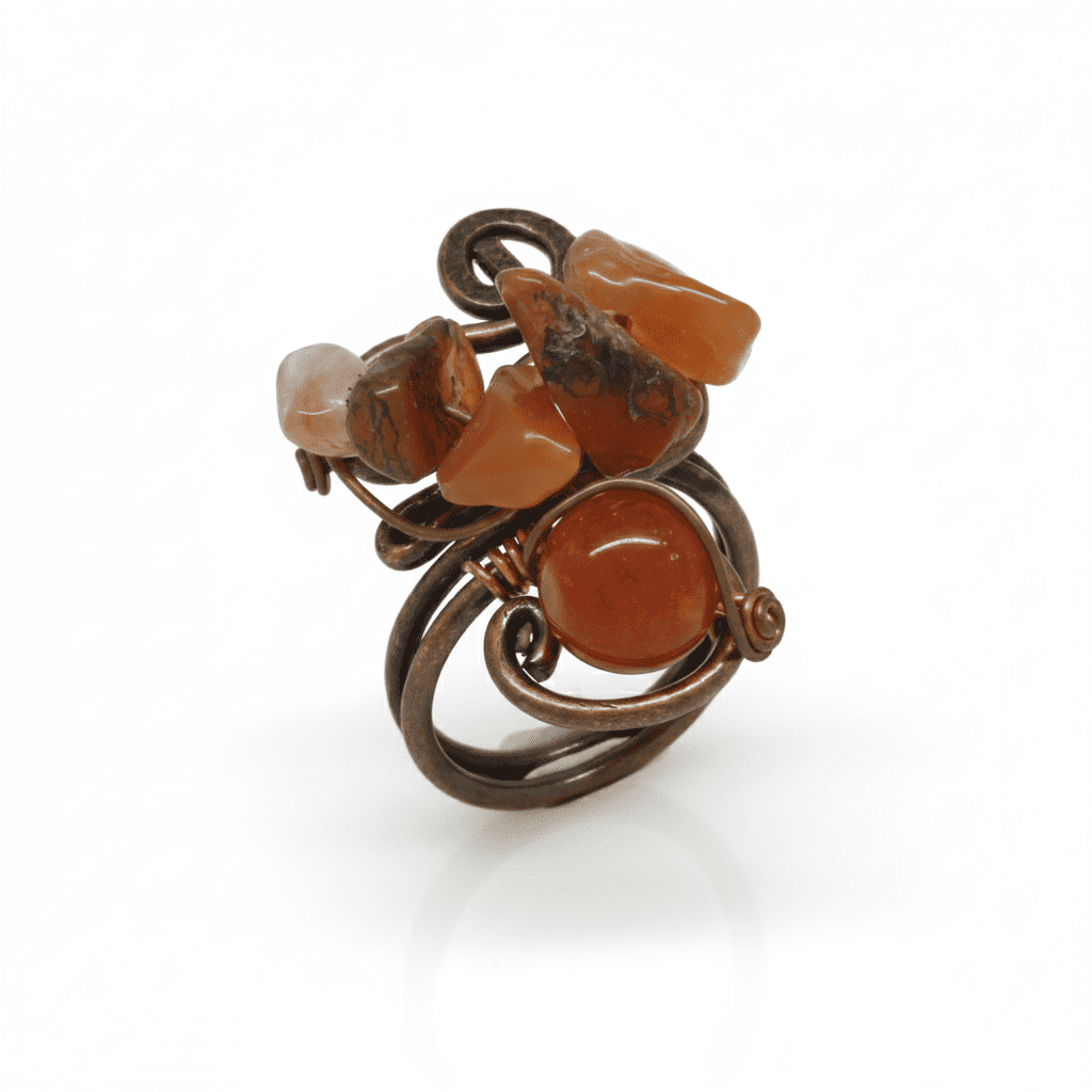 Bakır Bronz Alaşım Kadın Yüzük - Amorf Kırmızı Akik Doğaltaşlı - Retro Tasarım - Ayarlanabilir Ölçü