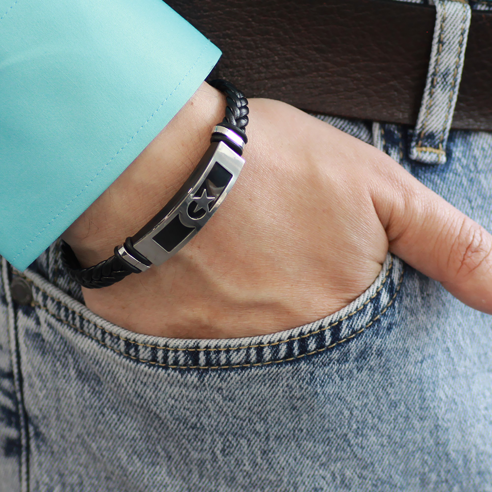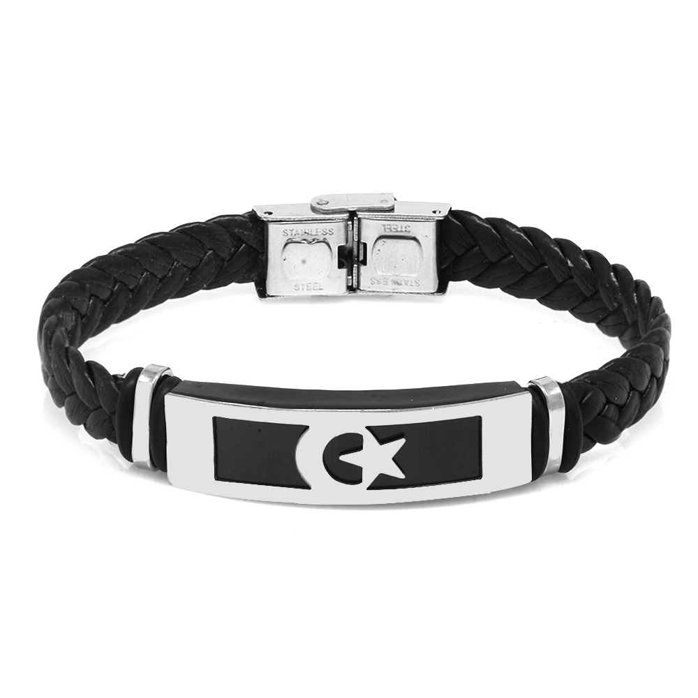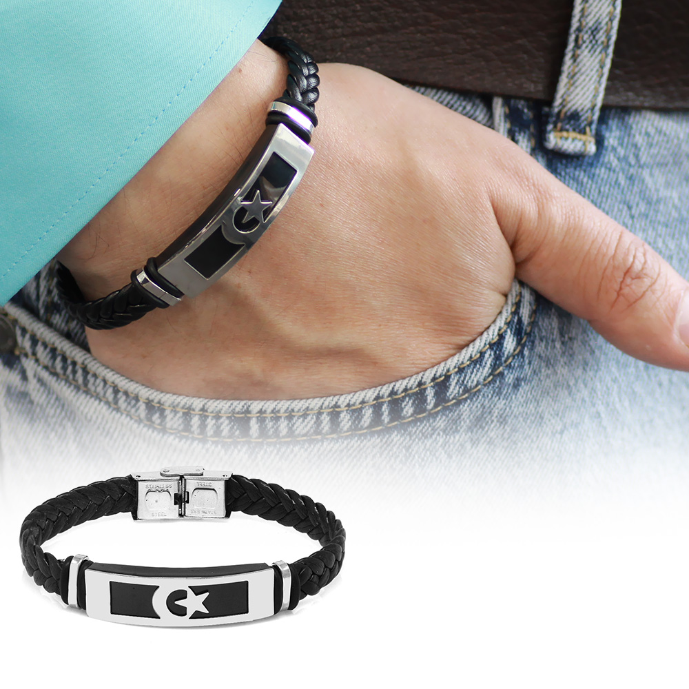 Balık Sırtı Tasarım Ayyıldız Temalı Çelik Deri Kombinli Erkek Bileklik - 1
