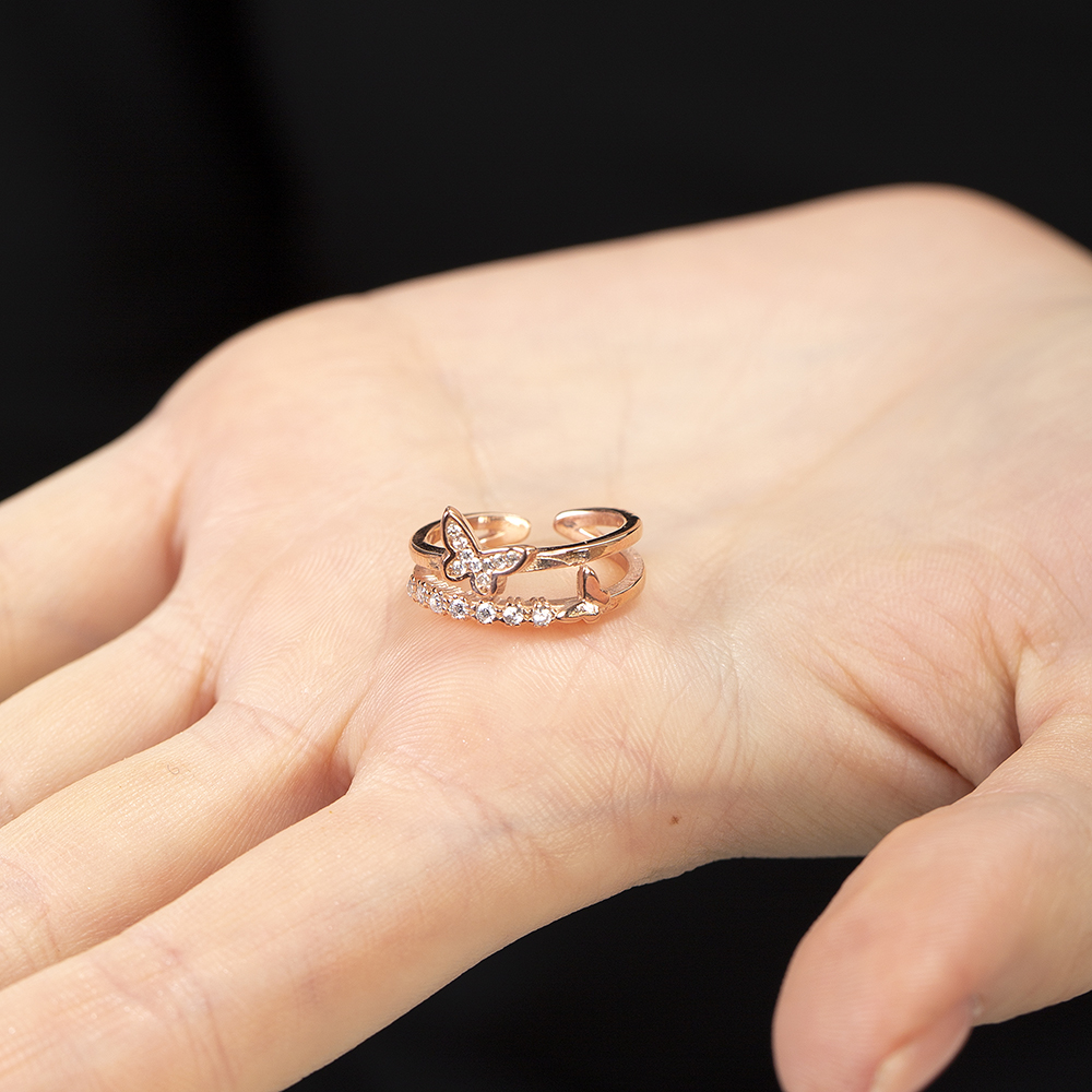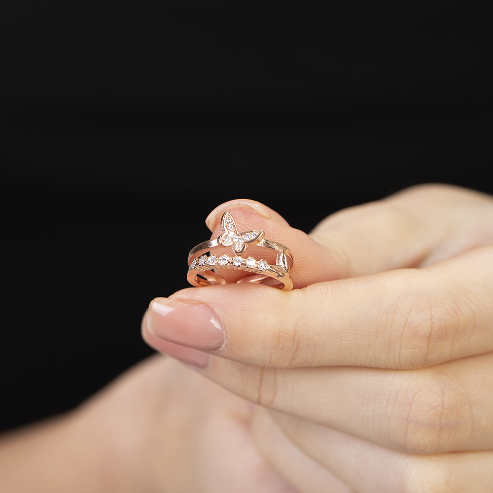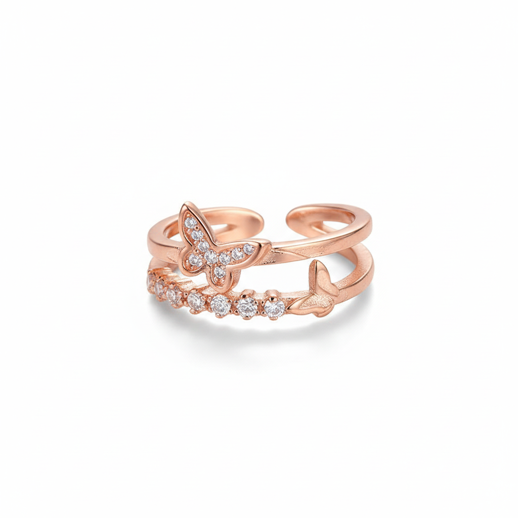 Beyaz Zirkon Taşlı Kelebek Detaylı Rose Renk Ayarlanabilir Ölçü 925 Ayar Gümüş Kadın Yüzük