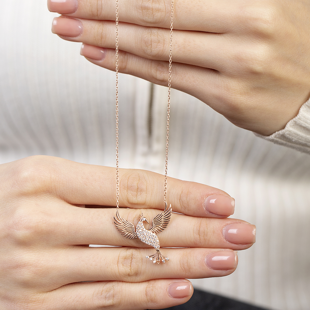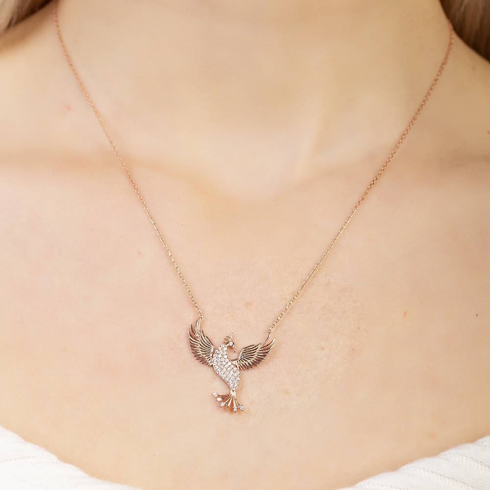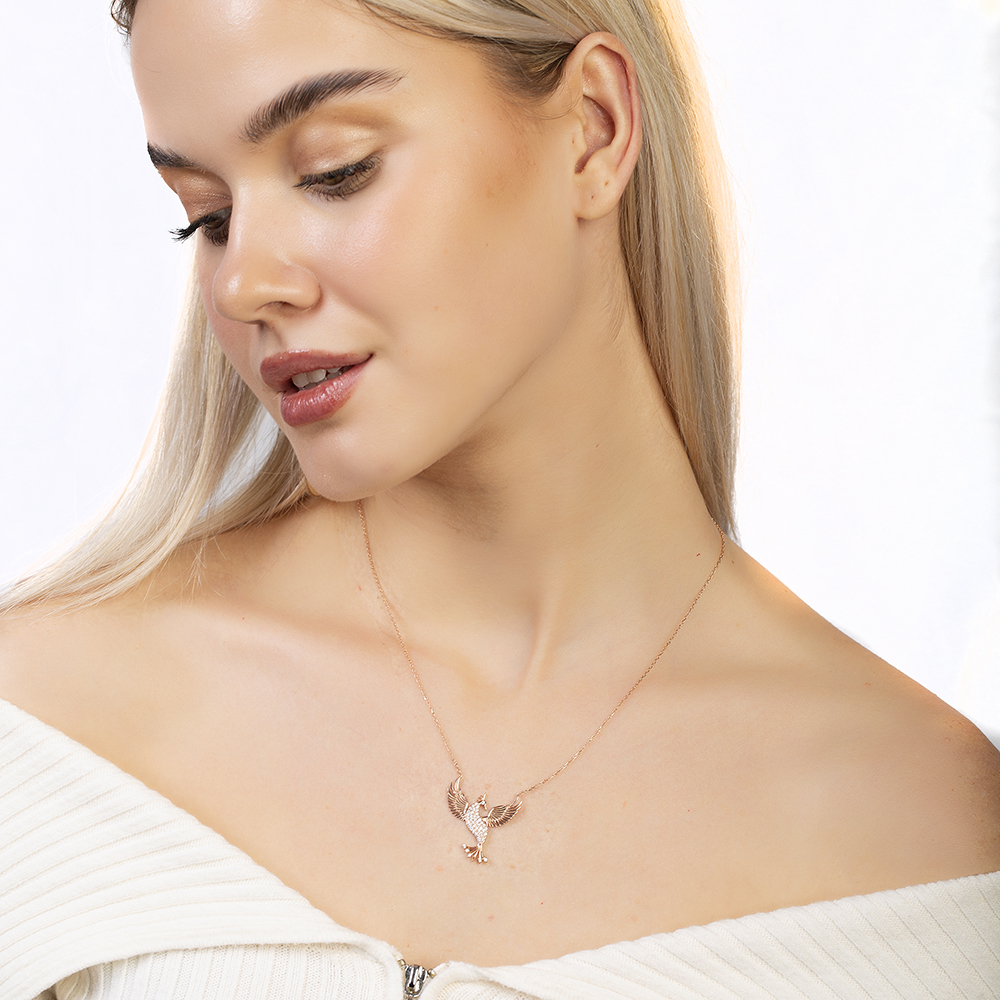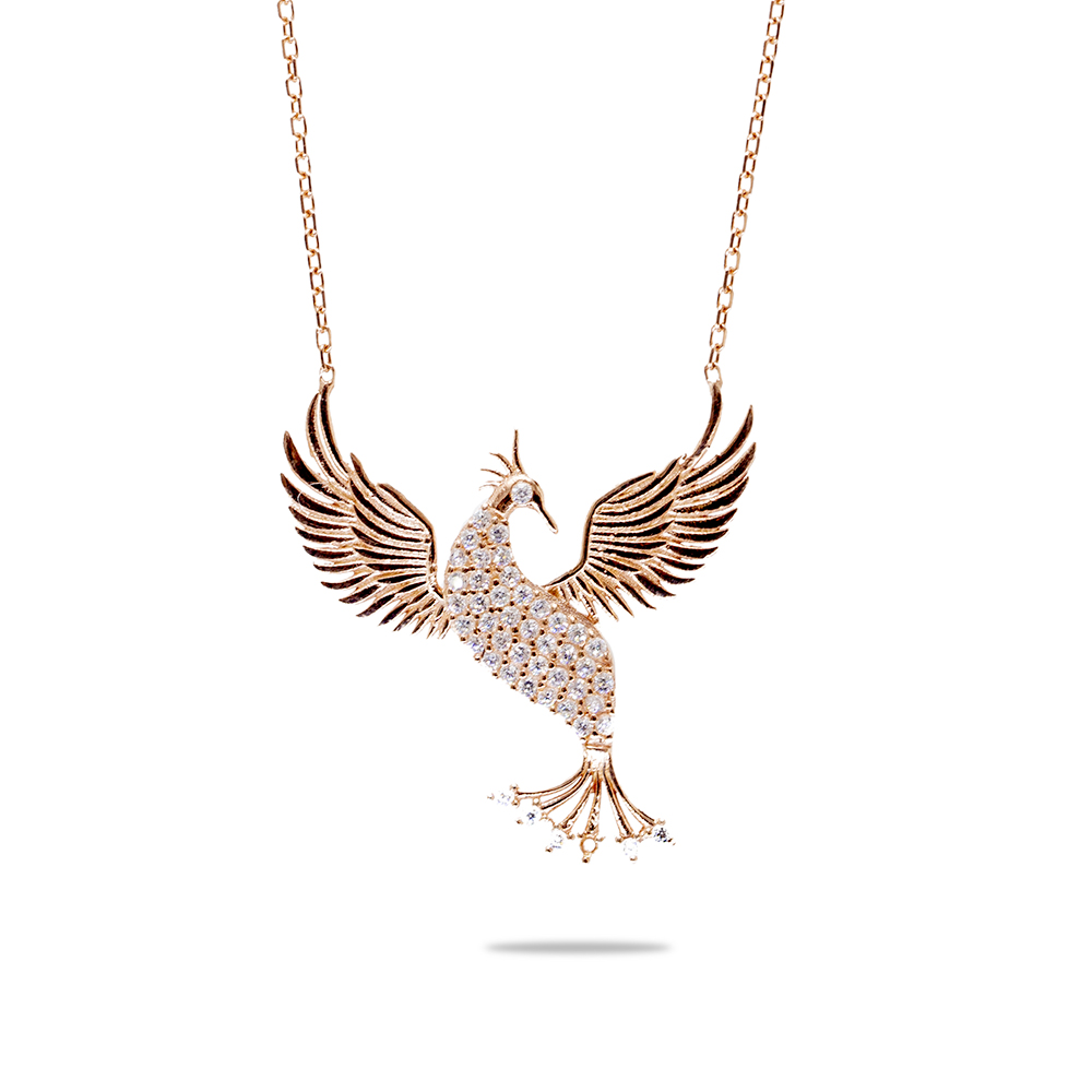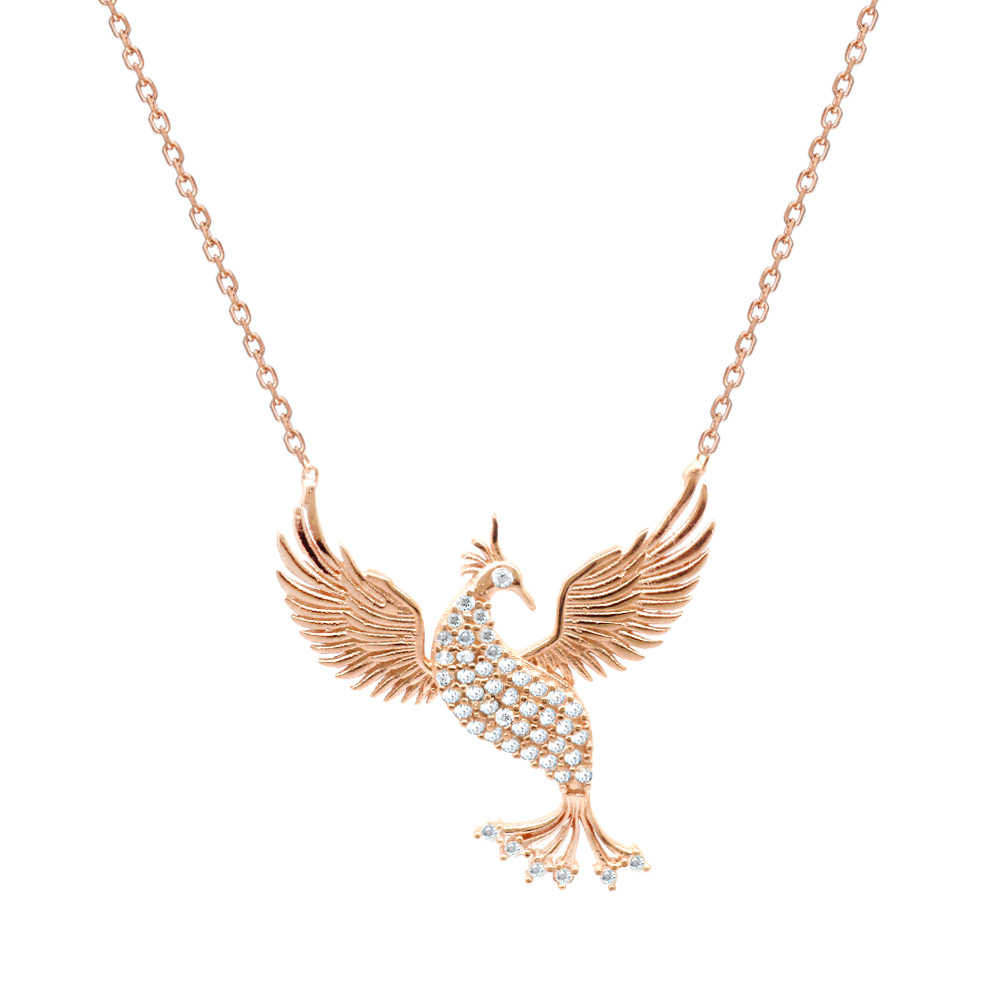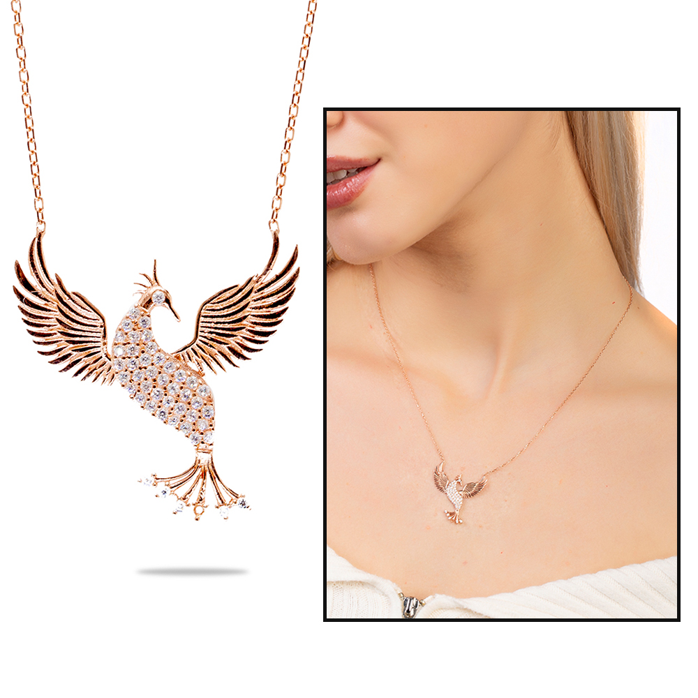 Beyaz Zirkon Taşlı Anka Kuşu Tasarım Rose Renk 925 Ayar Gümüş Kadın Kolye