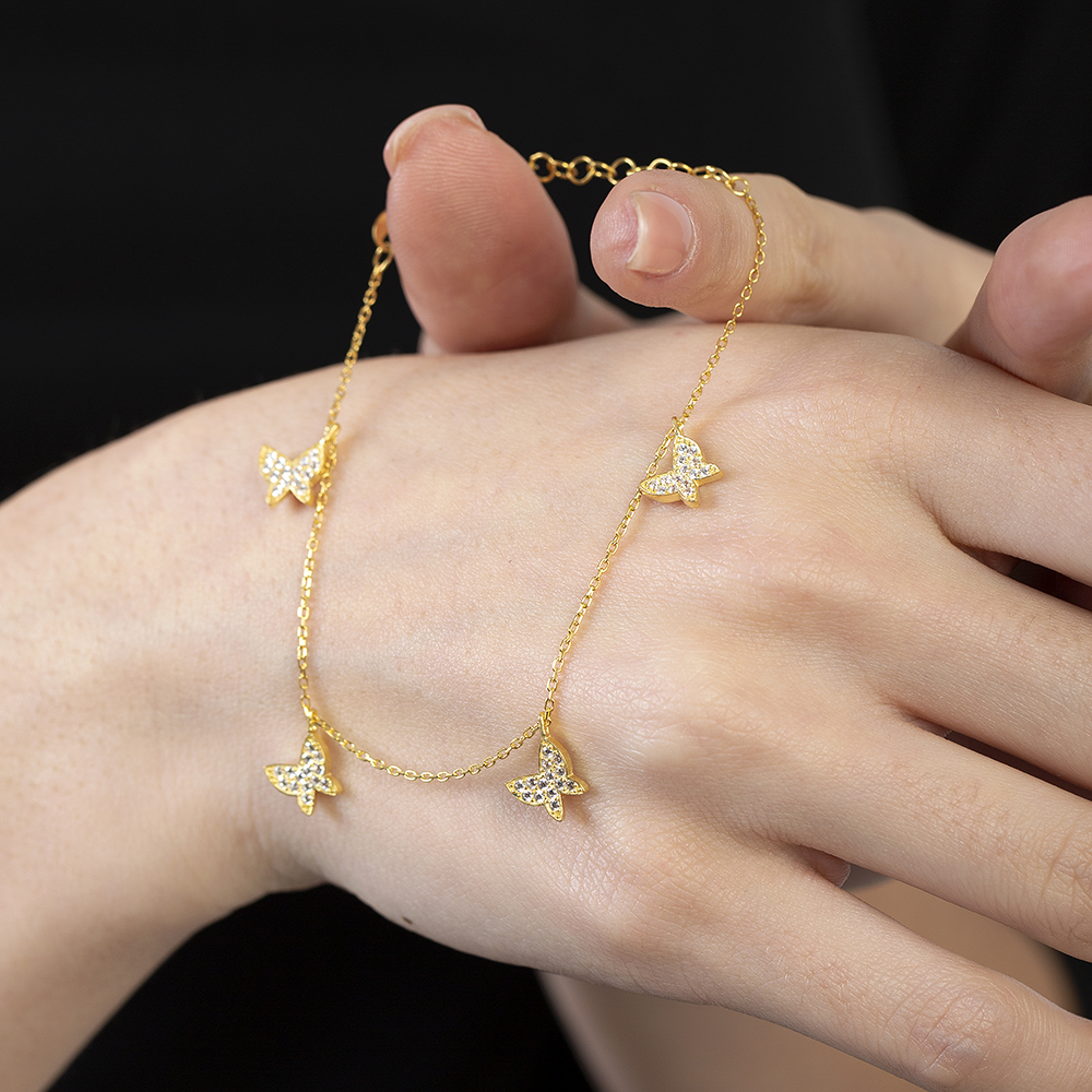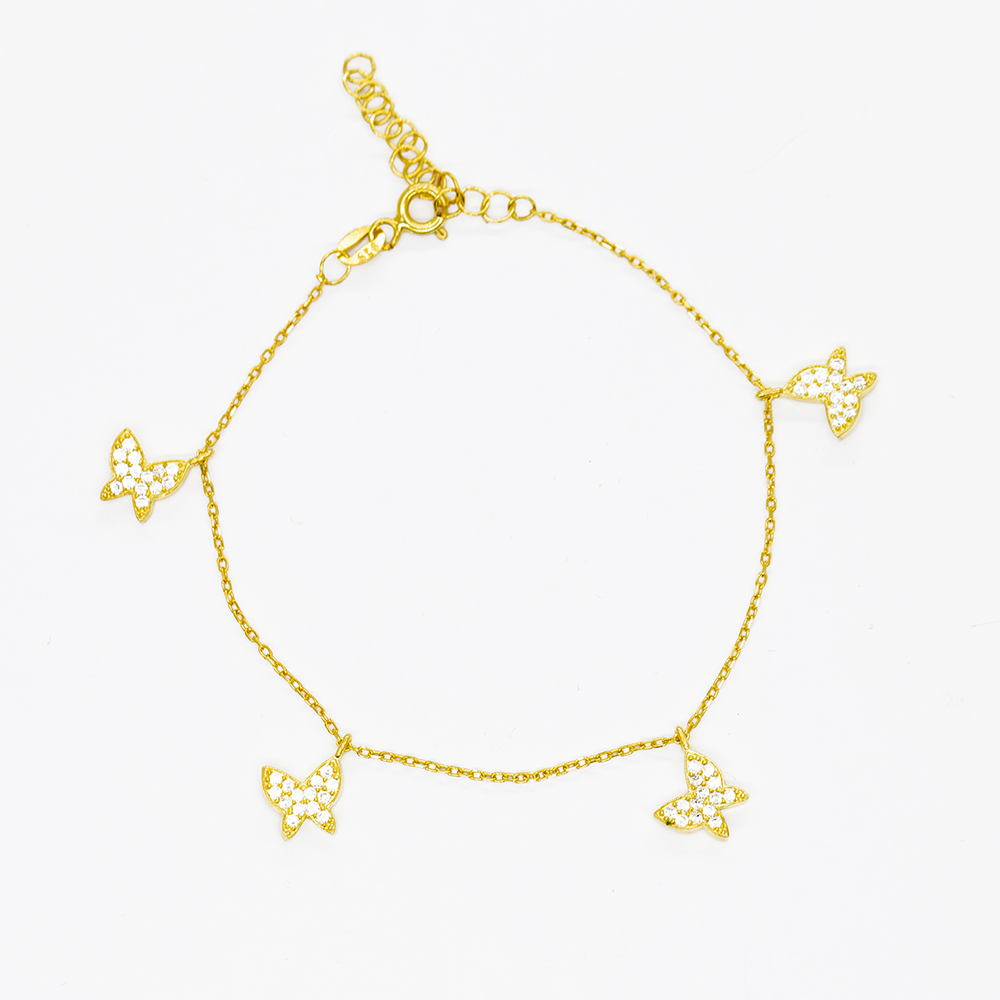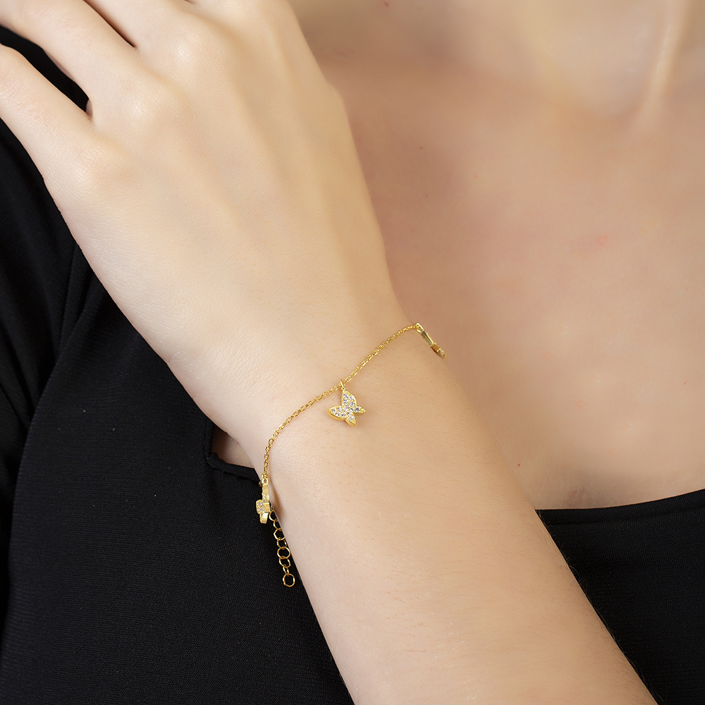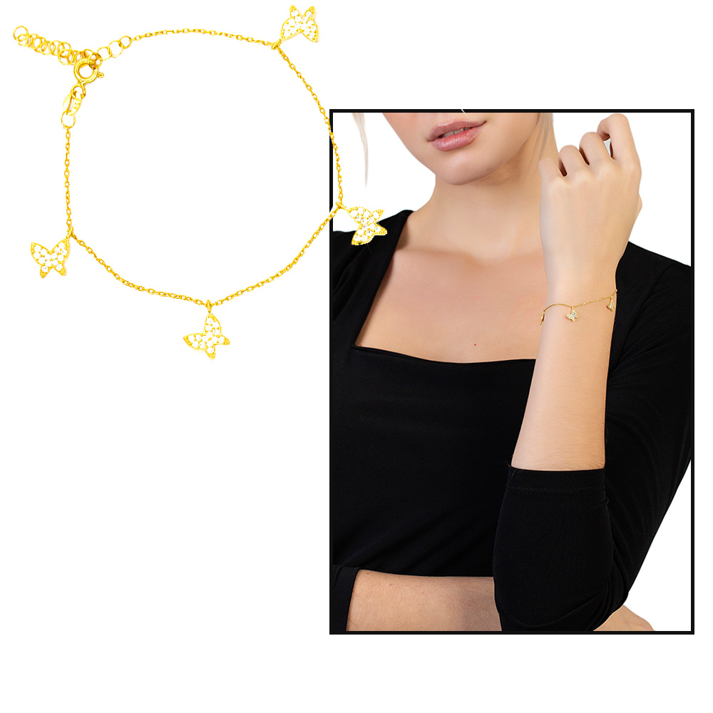 Beyaz Zirkon Taşlı Altın Renk Kelebek Tasarım 925 Ayar Gümüş Kadın Bileklik
