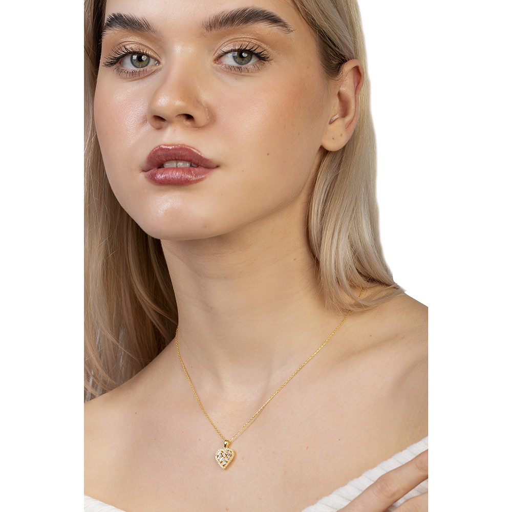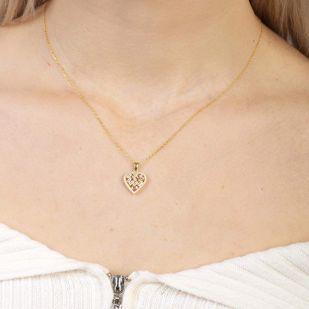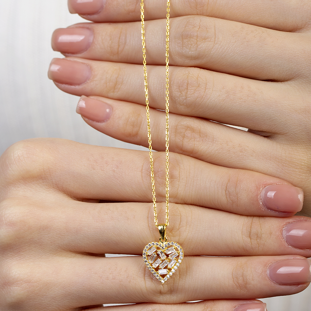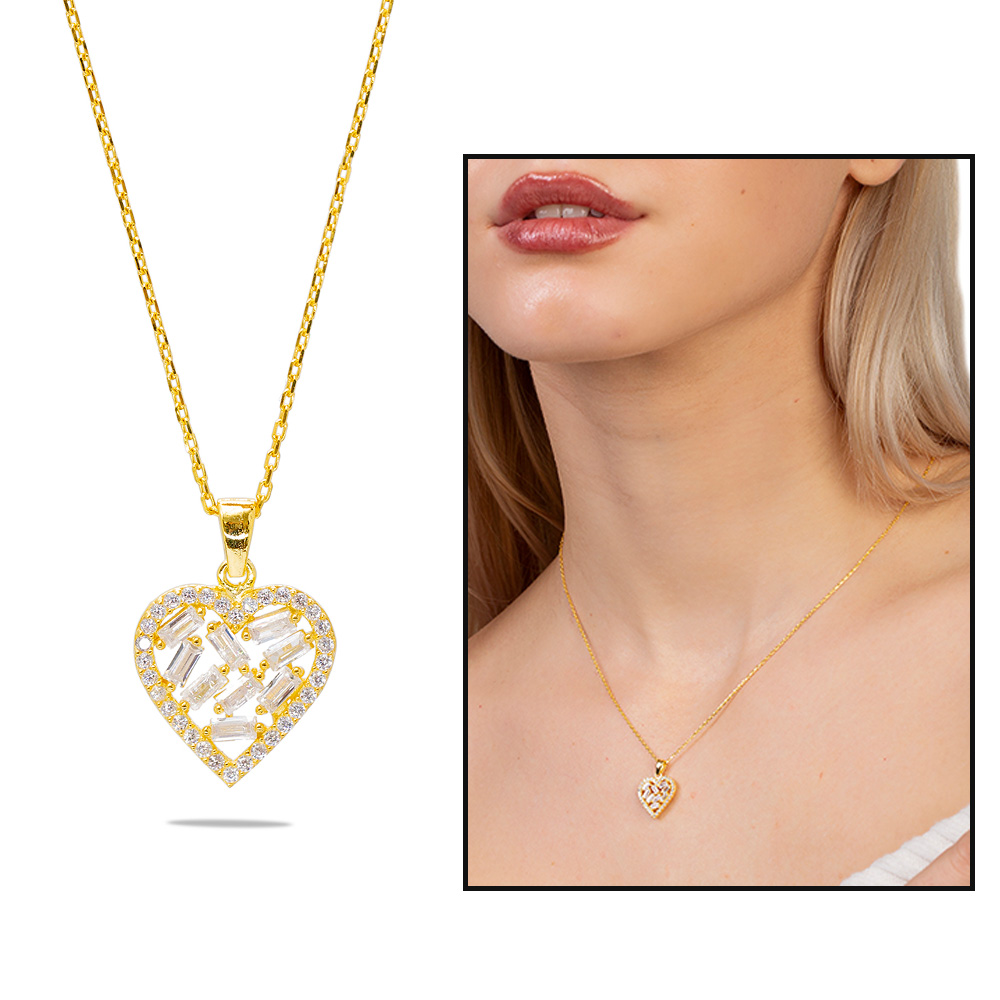 Beyaz Zirkon Taşlı Kalp Tasarım Altın Renk 925 Ayar Gümüş Kadın Kolye