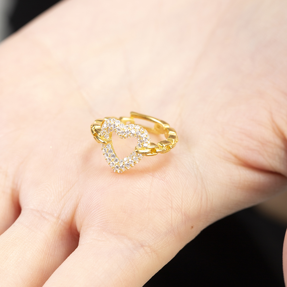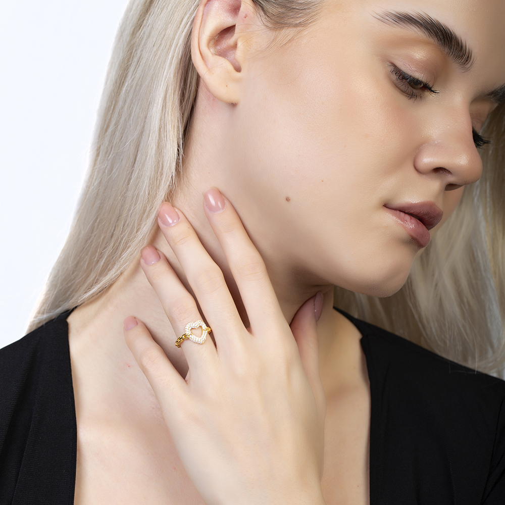Beyaz Zirkon Taşlı Kalp Tasarım Altın Renk Ayarlanabilir Ölçü 925 Ayar Gümüş Kadın Yüzük