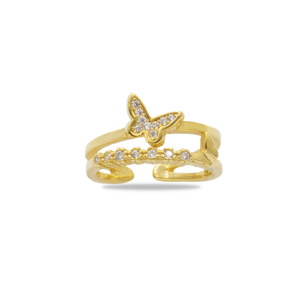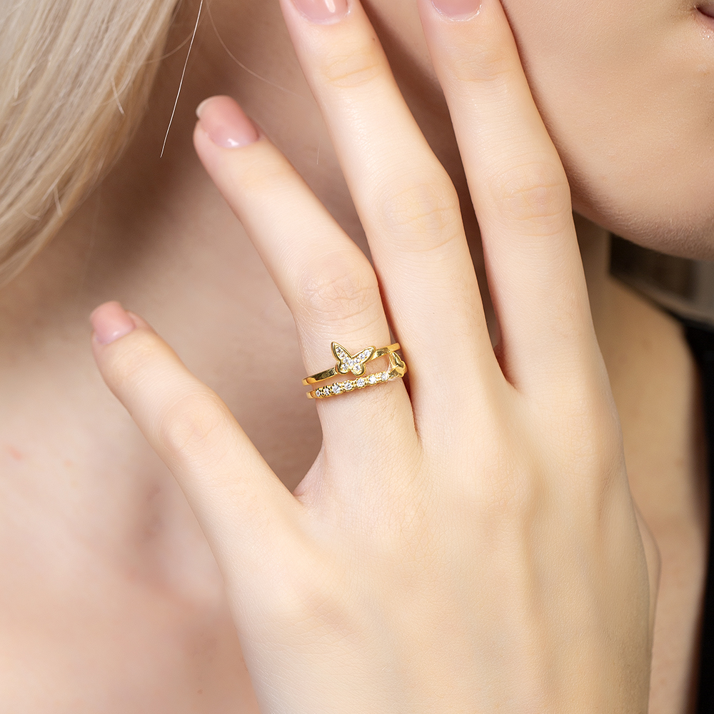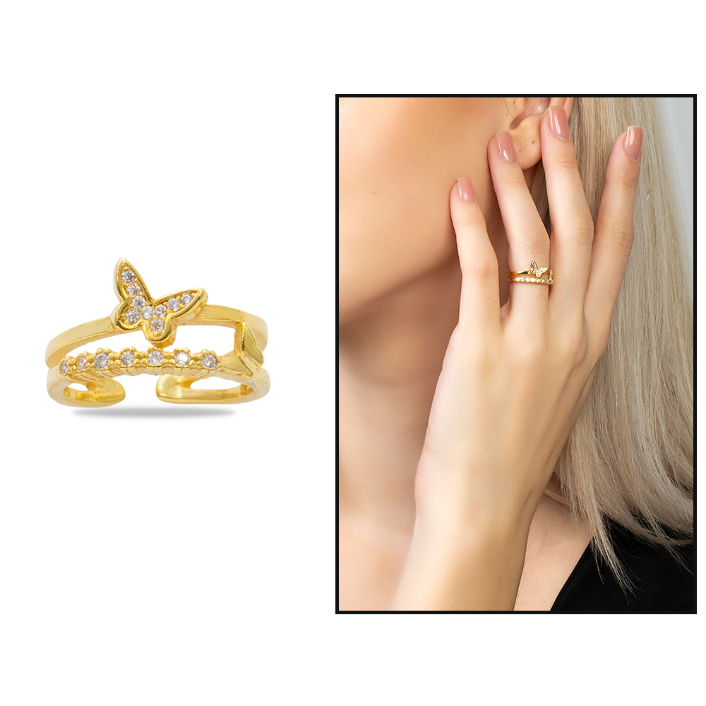 Beyaz Zirkon Taşlı Kelebek Detaylı Altın Renk Ayarlanabilir Ölçü 925 Ayar Gümüş Kadın Yüzük