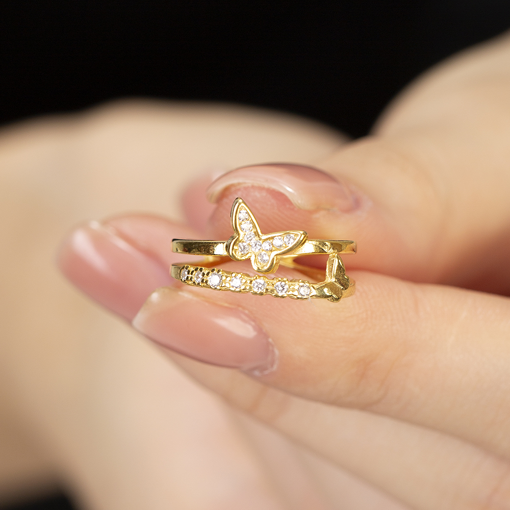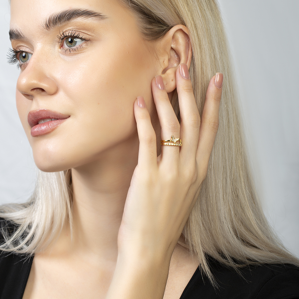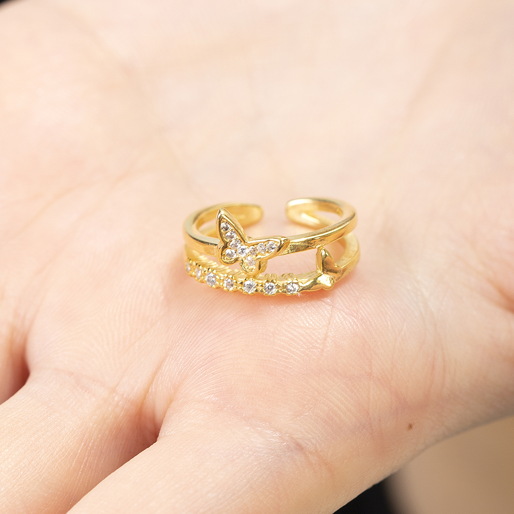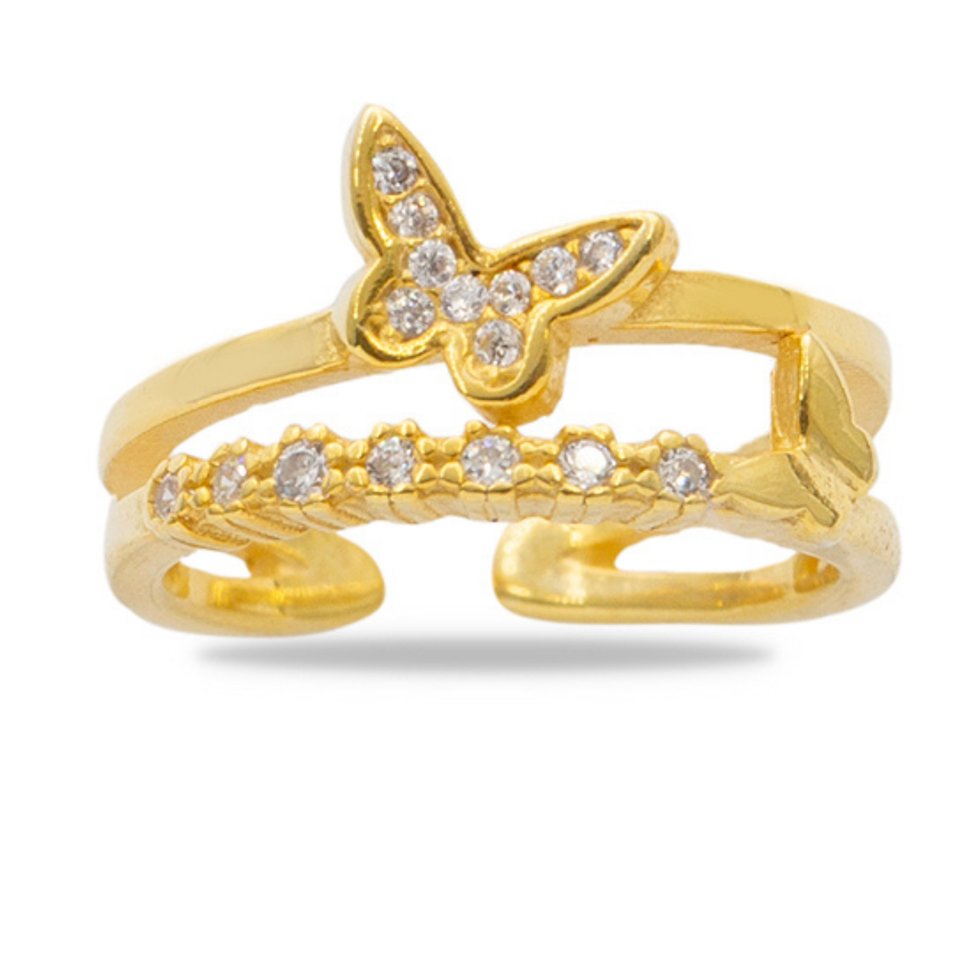 Beyaz Zirkon Taşlı Kelebek Detaylı Altın Renk Ayarlanabilir Ölçü 925 Ayar Gümüş Kadın Yüzük
