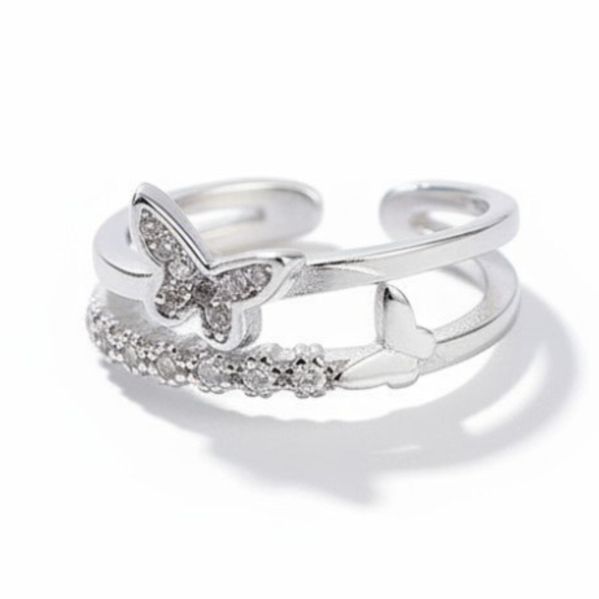 Beyaz Zirkon Taşlı Kelebek Detaylı Gümüş Renk Ayarlanabilir Ölçü 925 Ayar Gümüş Kadın Yüzük