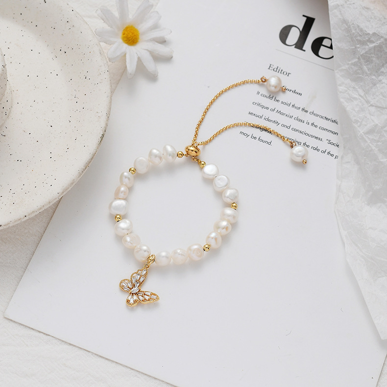 Beyaz Zirkon Taşlı Kelebek Tasarım Altın Renk Uzunluk Ayarlı Doğaltaş İnci Kadın Bileklik - 1