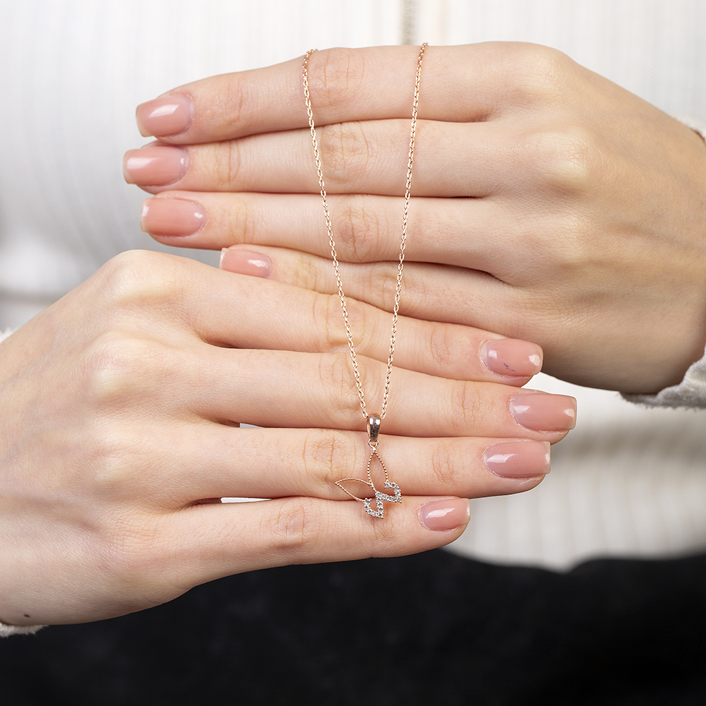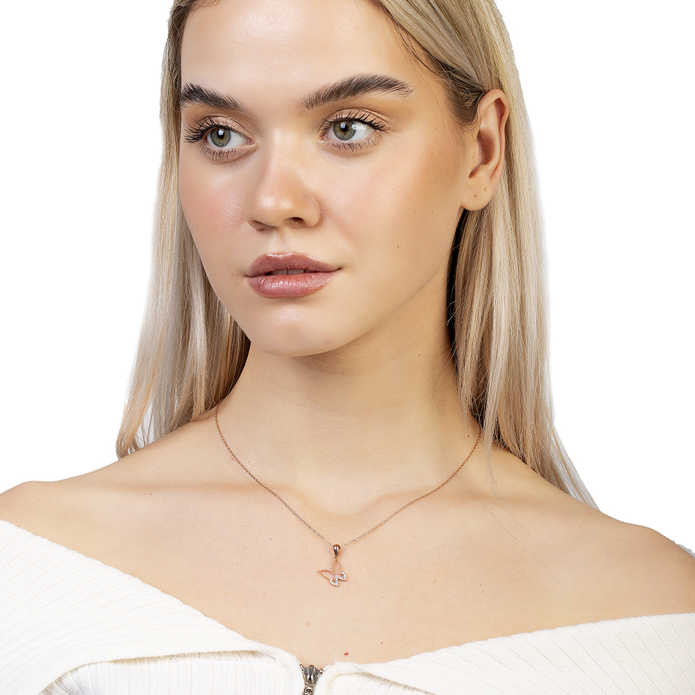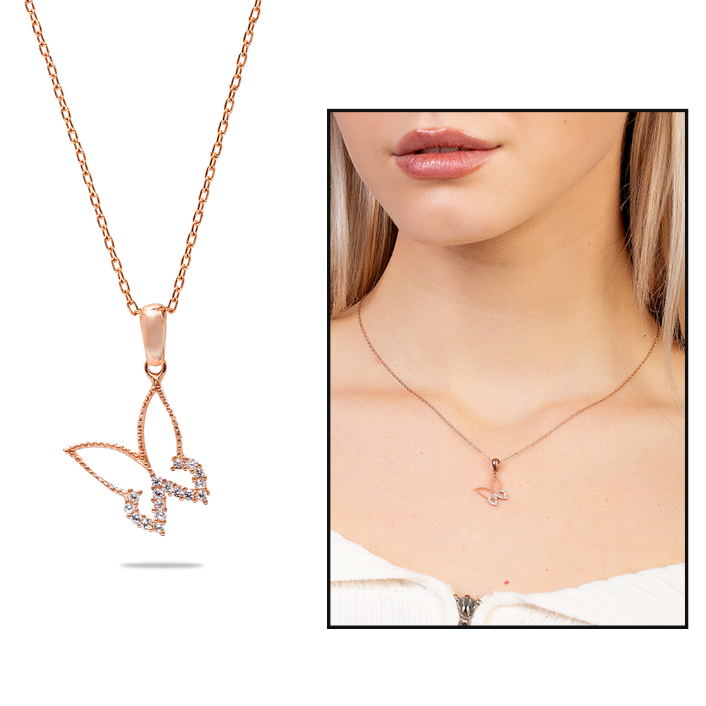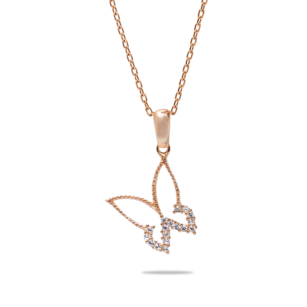 Beyaz Zirkon Taşlı Kelebek Tasarım Rose Renk 925 Ayar Gümüş Kadın Kolye