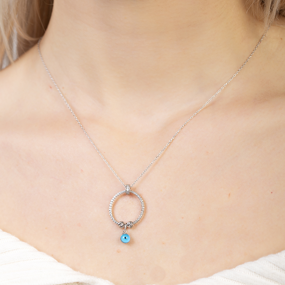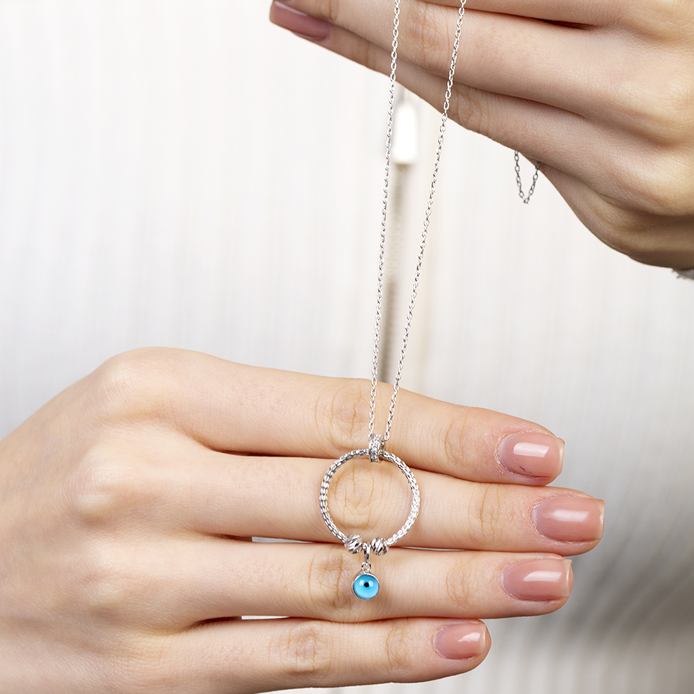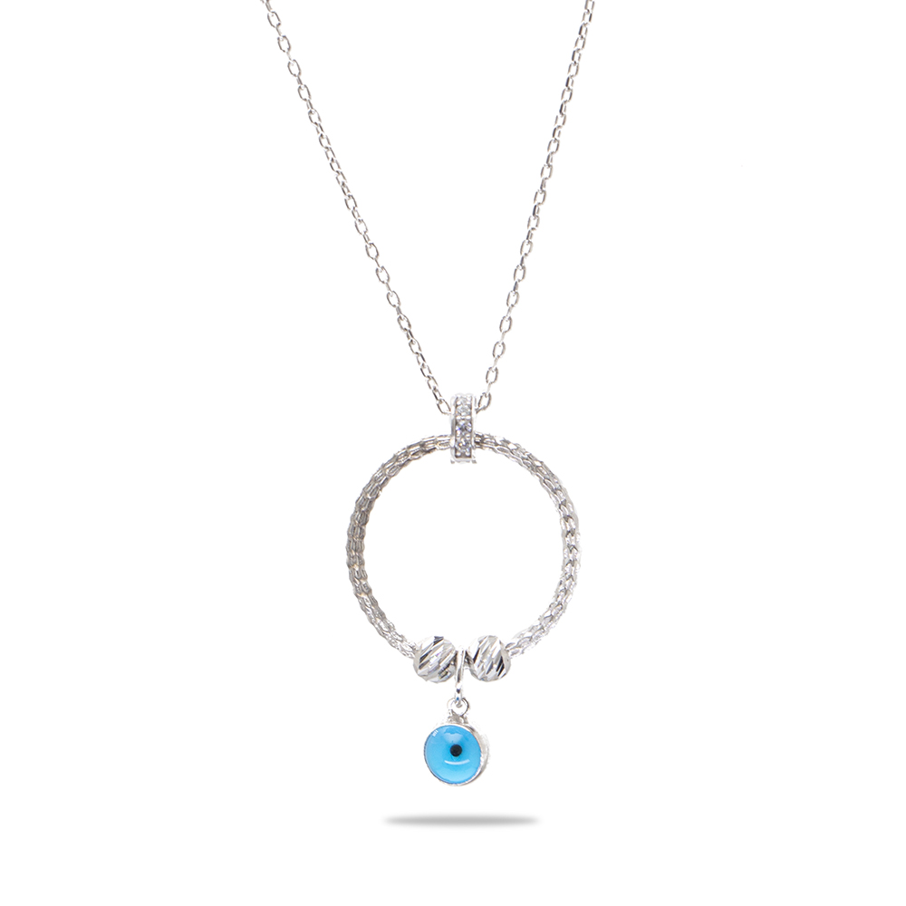 Beyaz Zirkon Taşlı Nazar Boncuğu Detaylı Dorika Top Süslemeli Gümüş Renk 925 Ayar Gümüş Kadın Kolye