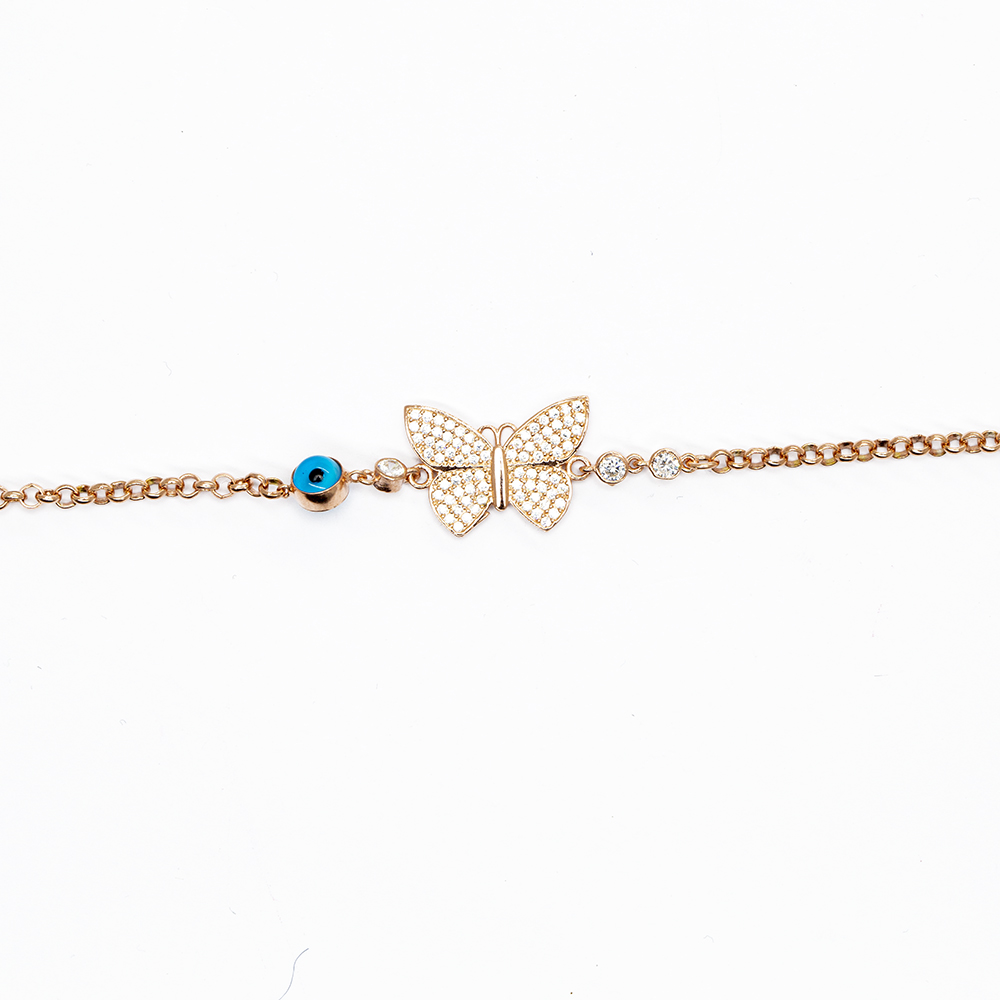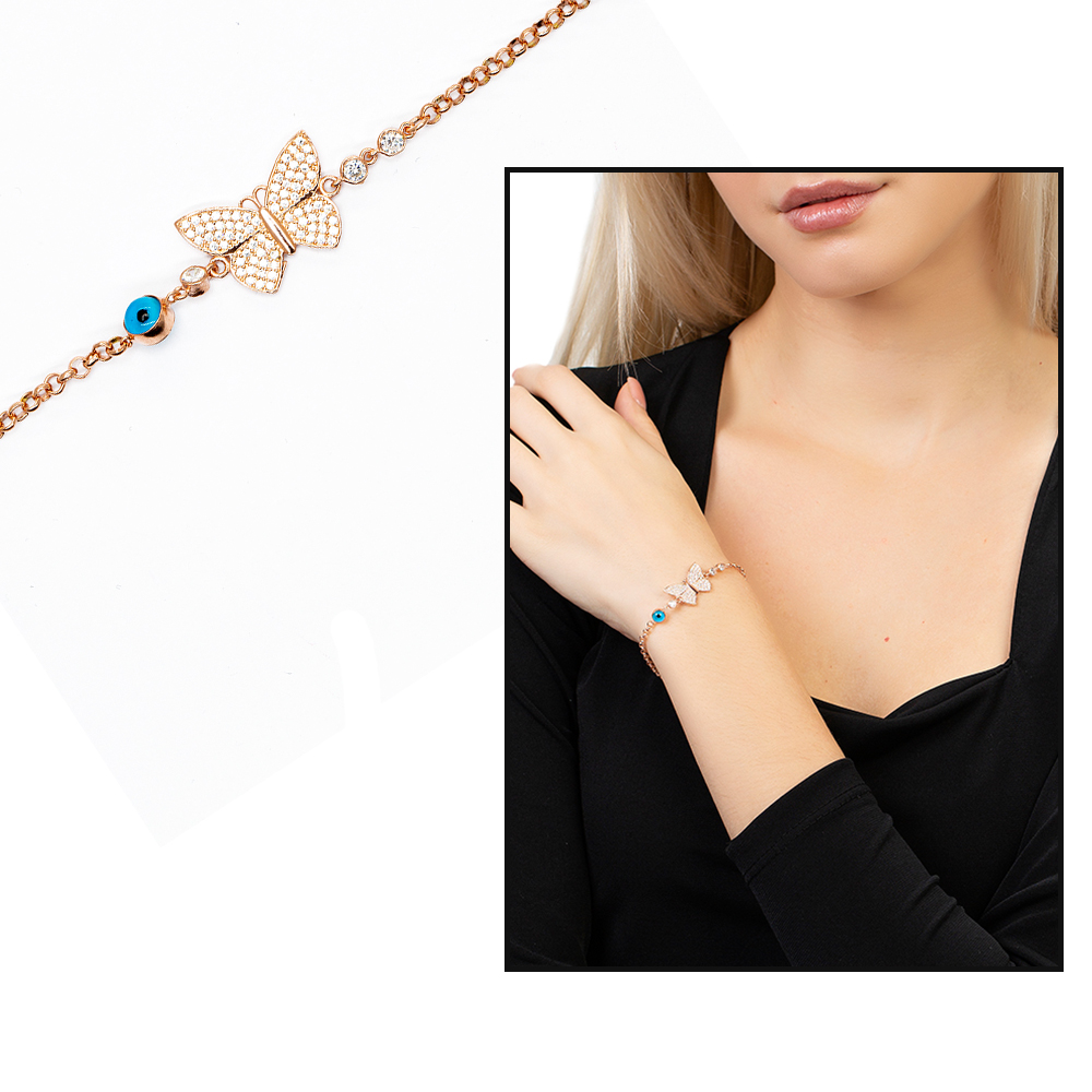 Beyaz Zirkon Taşlı Rose Renk Kelebek Tasarım Nazar Boncuğu Detaylı 925 Ayar Gümüş Kadın Bileklik