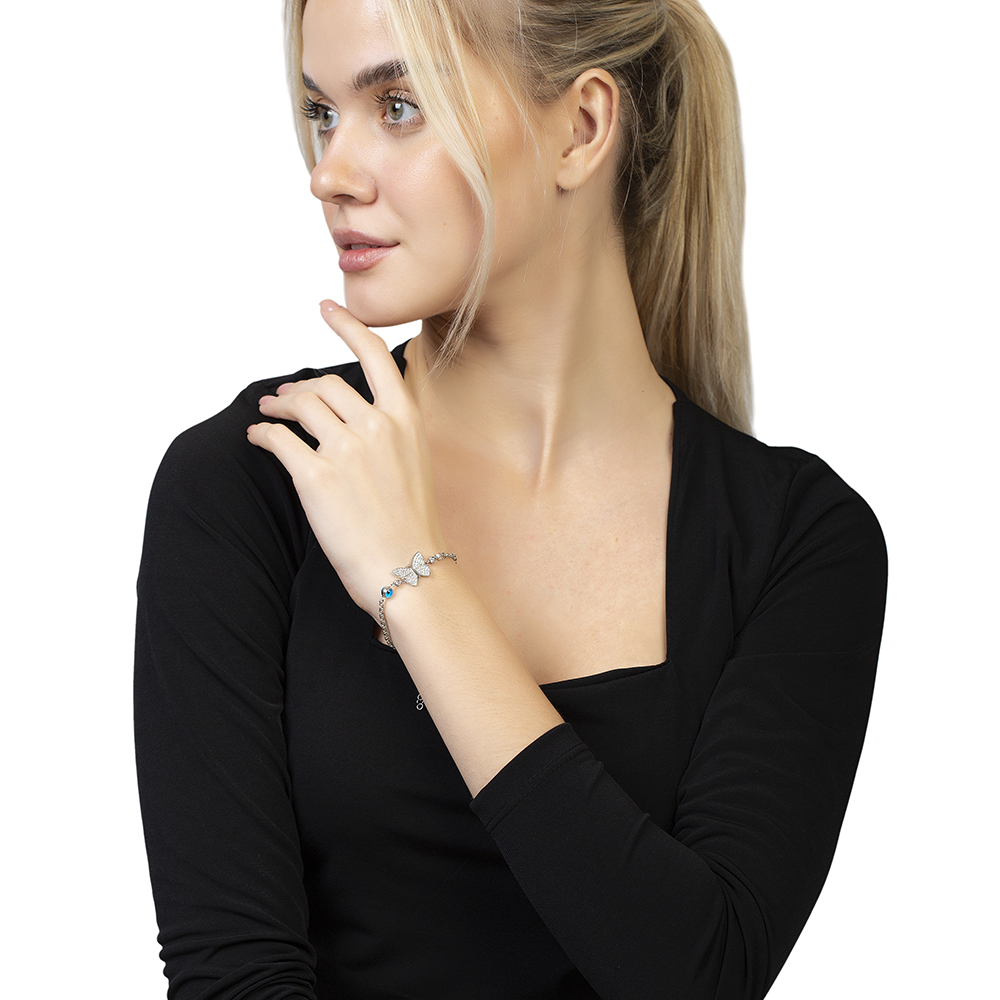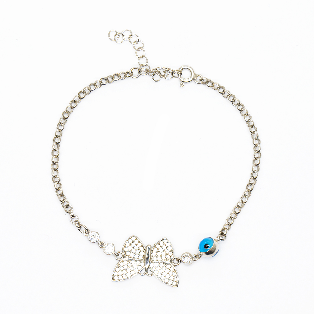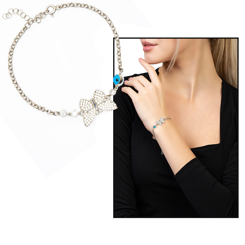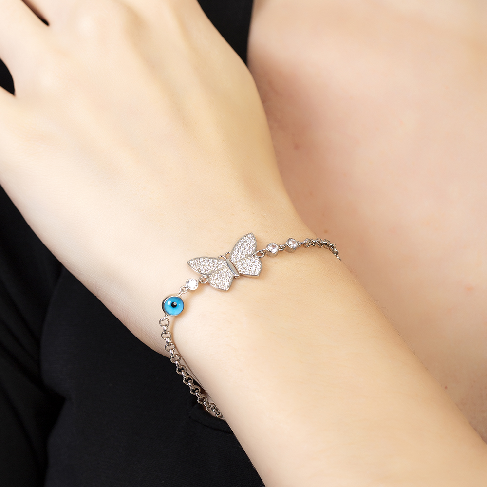 Beyaz Zirkon Taşlı Gümüş Renk Kelebek Tasarım Nazar Boncuğu Detaylı 925 Ayar Gümüş Kadın Bileklik