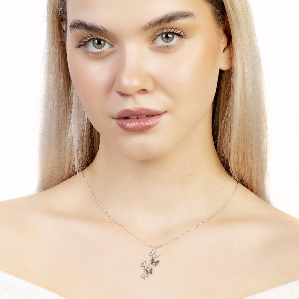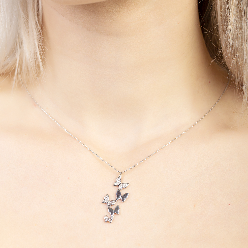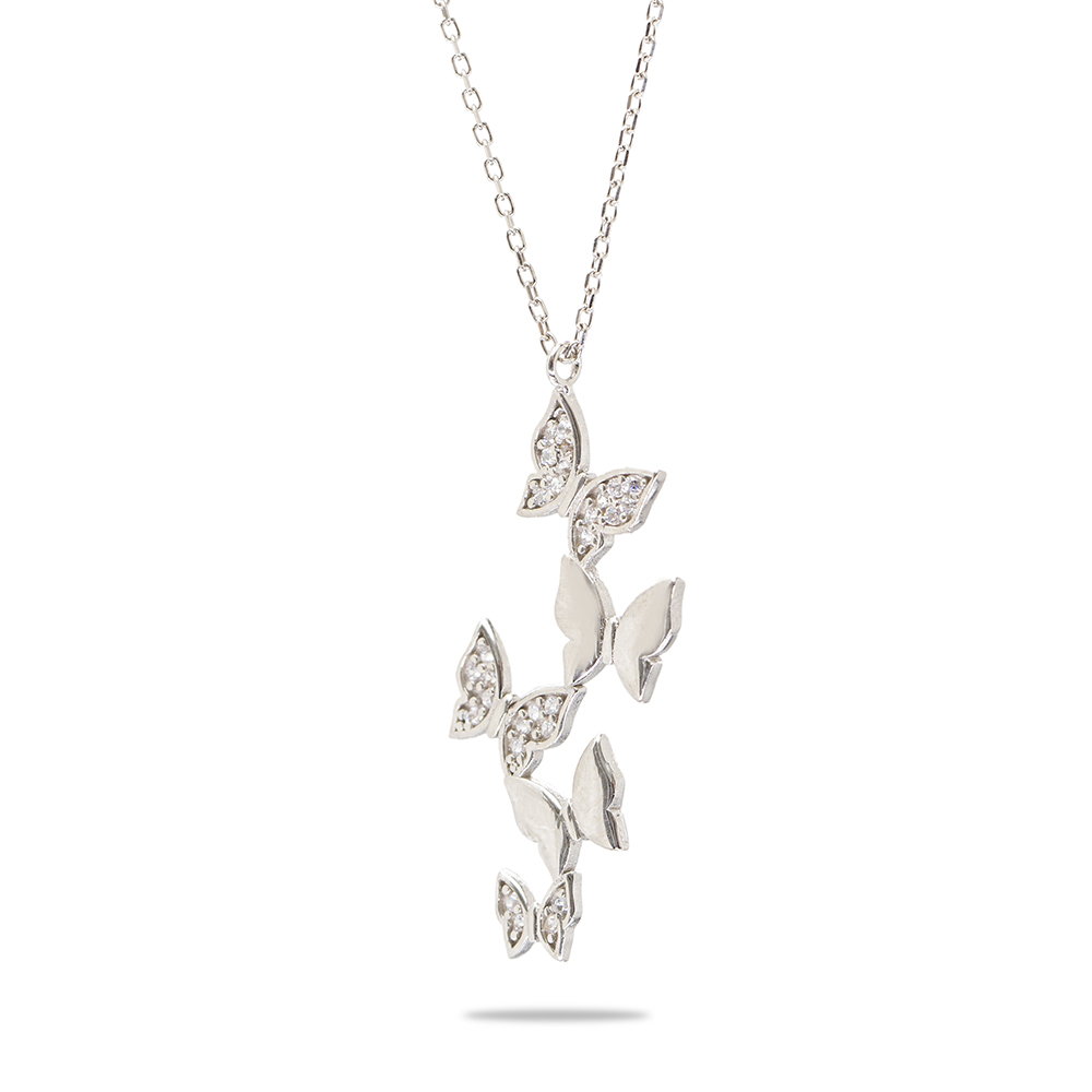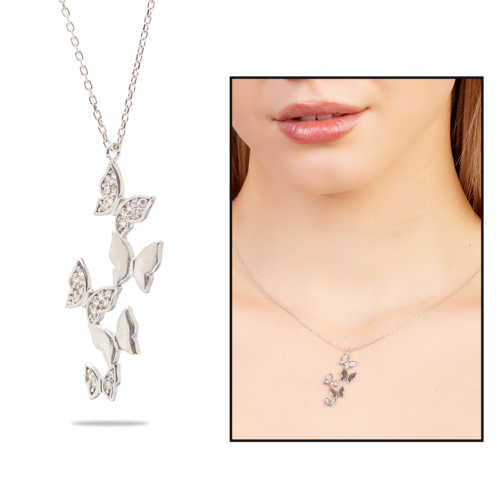 Beyaz Zirkon Taşlı Sıralı Kelebek Tasarım 925 Ayar Gümüş Kadın Kolye