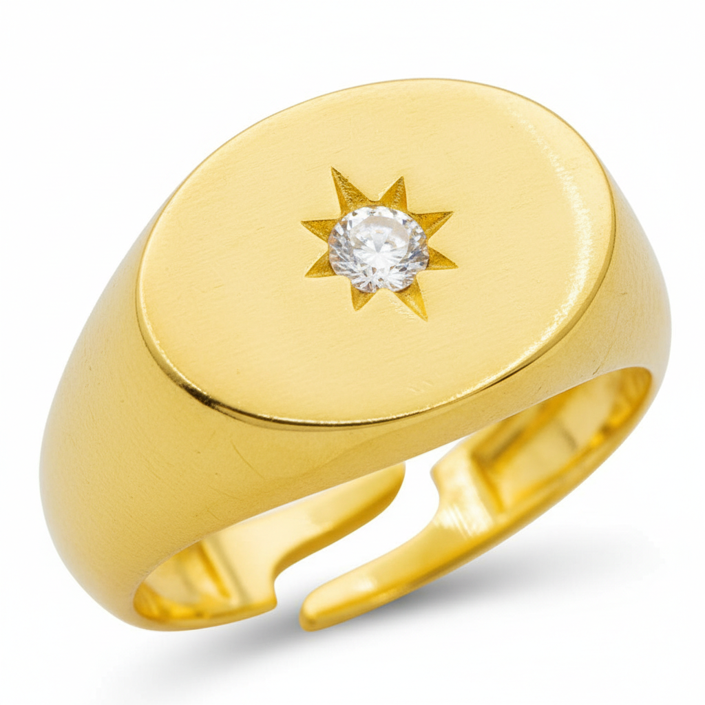 Beyaz Zirkon Taşlı Yıldız Detaylı Altın Renk Ayarlanabilir Ölçü 925 Ayar Gümüş Kadın Tektaş Yüzük