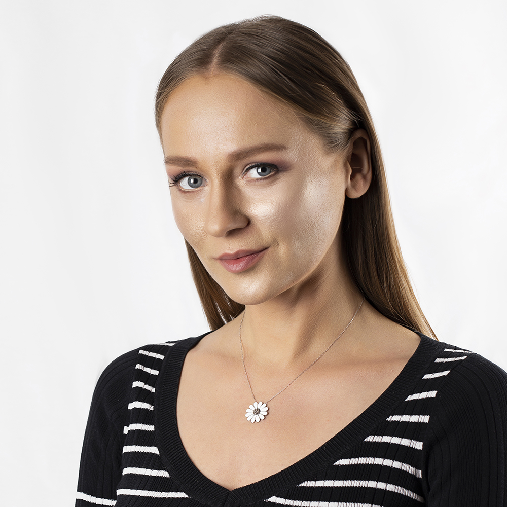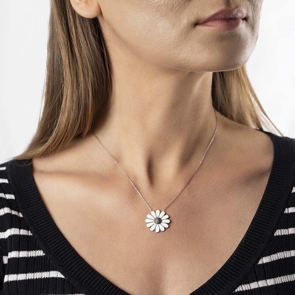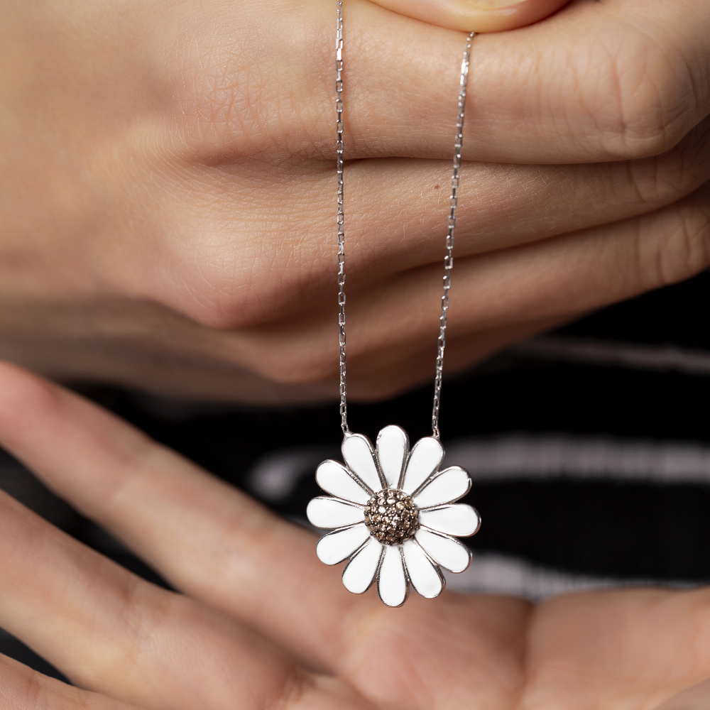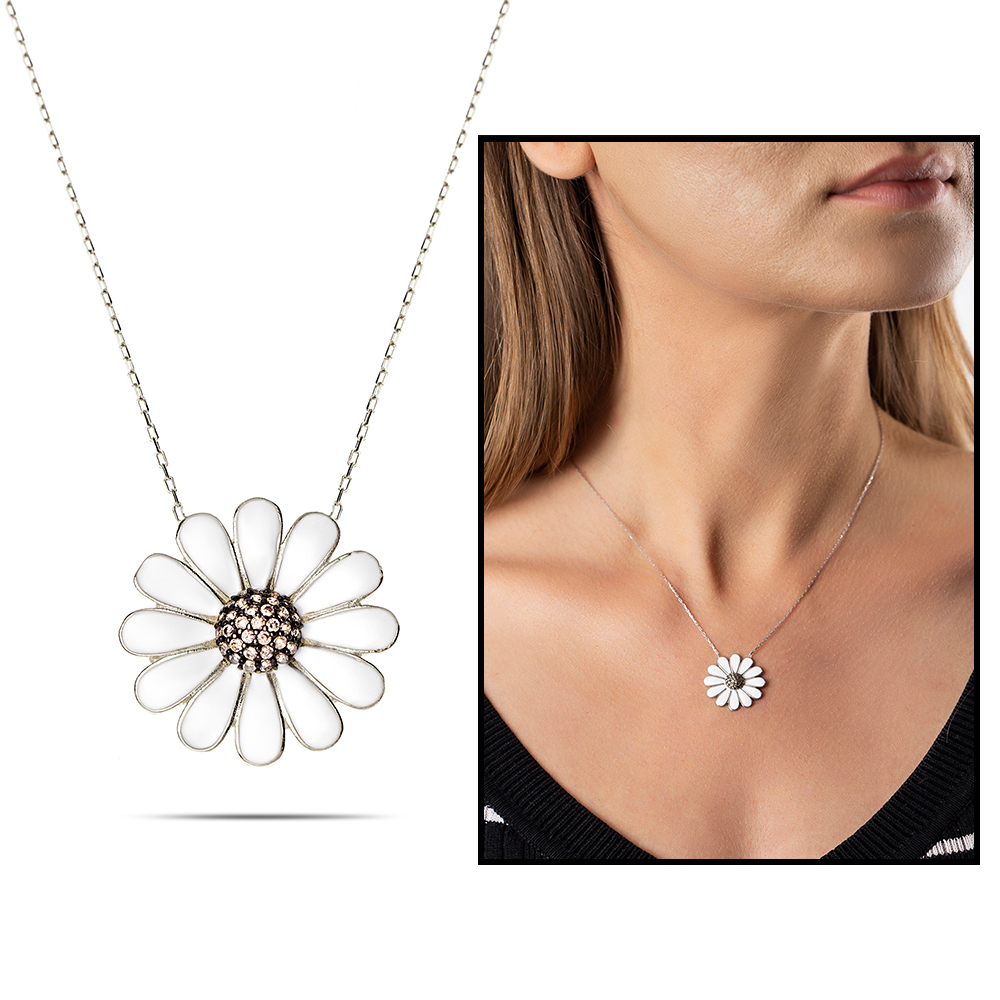 Beyaz Zirkon Taşlı Zarif Tasarım 925 Ayar Gümüş Papatya Kolye