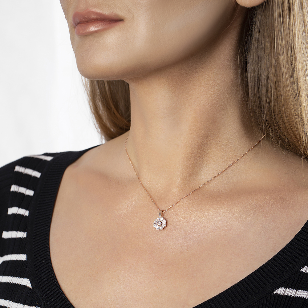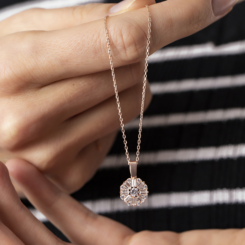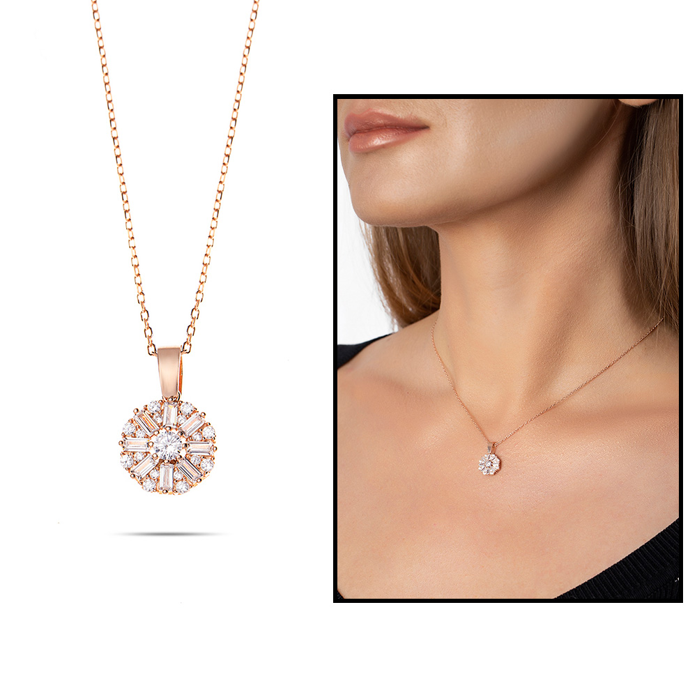 Beyaz Zirkon Taşlı Zarif Tasarım Rose Renk 925 Ayar Gümüş Trend Kolye