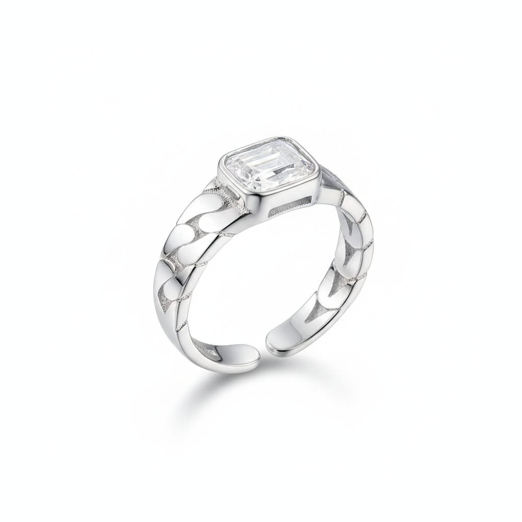 Beyaz Zirkon Taşlı Zincir Tasarım Gümüş Renk Ayarlanabilir Ölçü 925 Ayar Gümüş Kadın Tektaş Yüzük