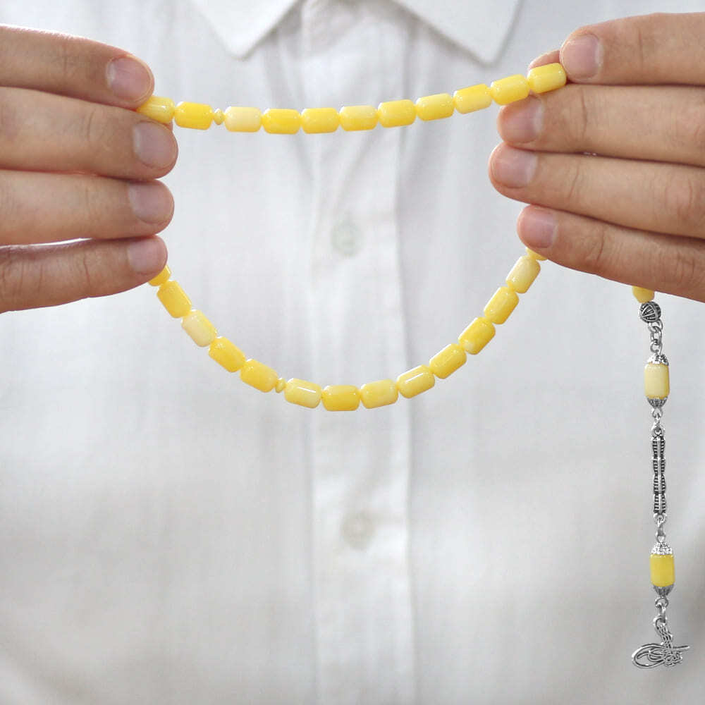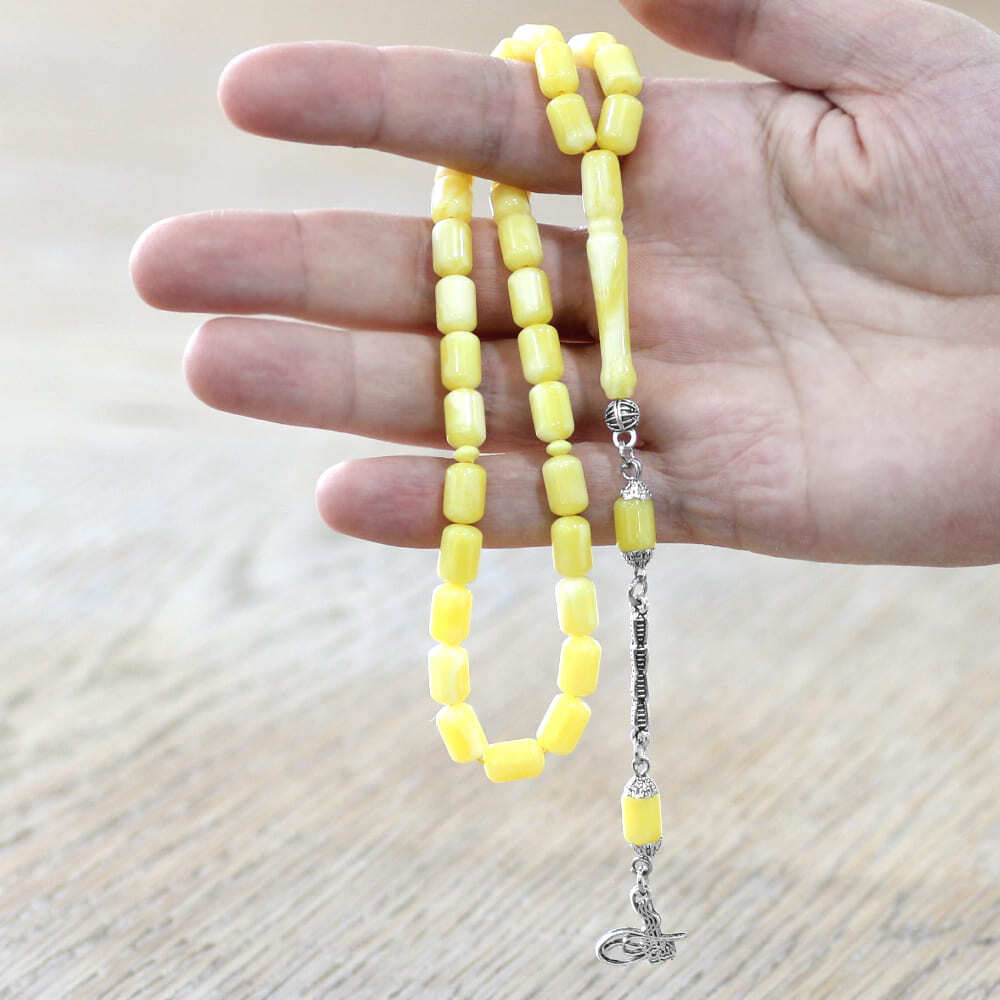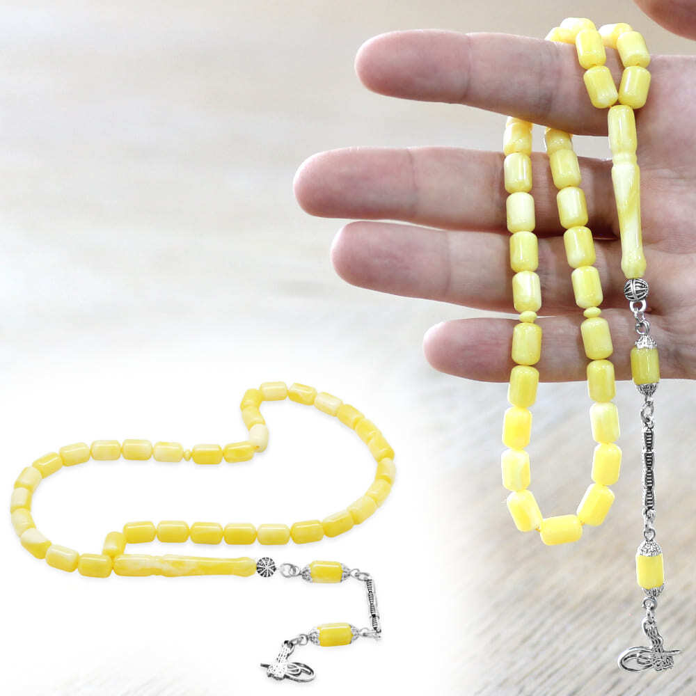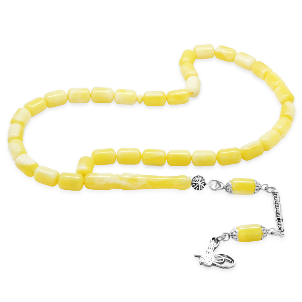 Beyrut Kehribar Tesbih- Kararmaz Metal Tuğra Püsküllü - Sarı Beyaz Renk - Kapsül Kesim