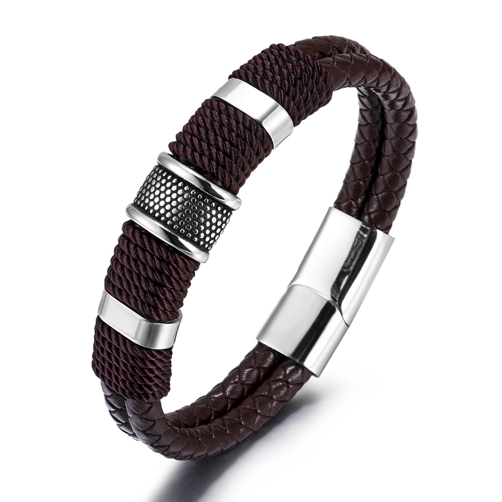 Çift Katmanlı Kahverengi Deri Halat ve Siyah 316L Kalite Çelik Mekanizmalı Avangart Erkek Bileklik