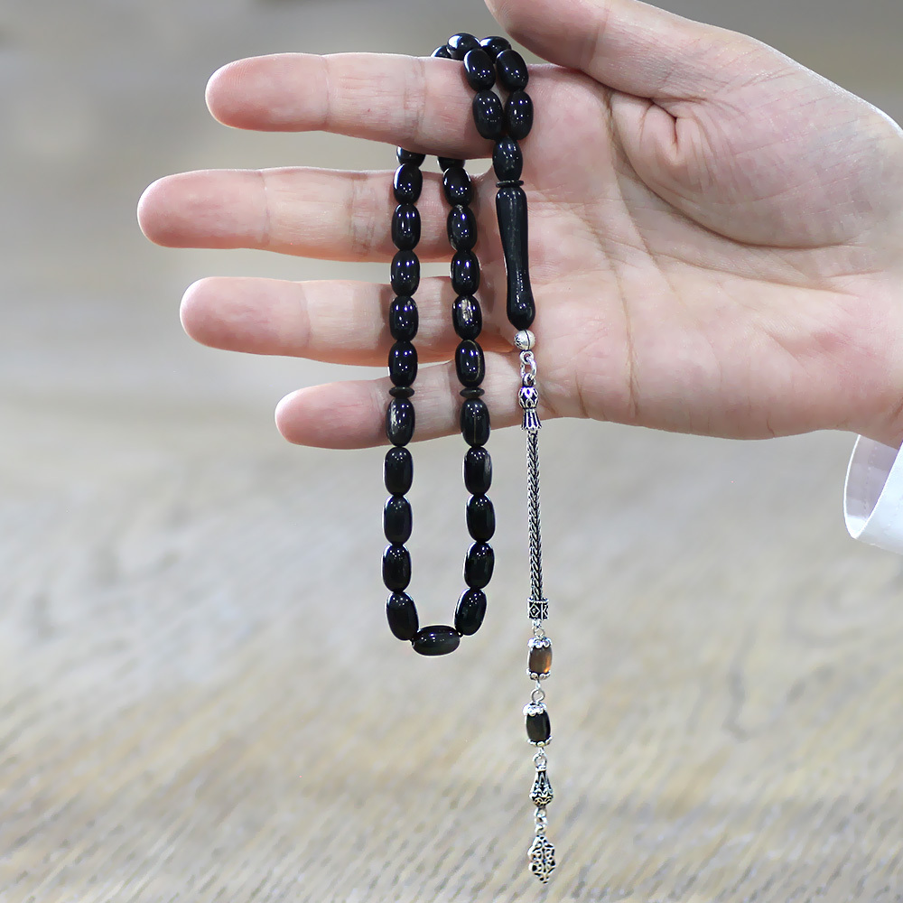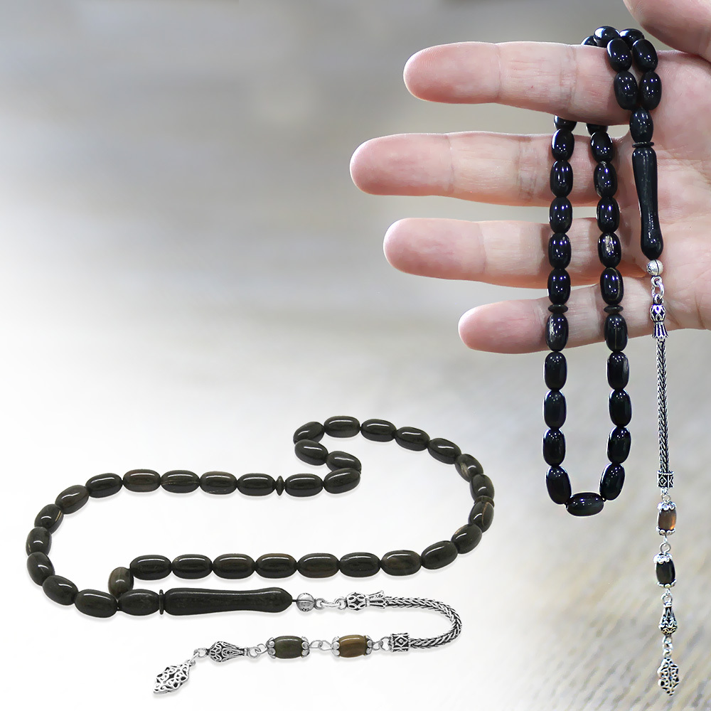 Bufalo Boynuzu Tesbih - 925 Ayar Gümüş Püsküllü - Koyu Renk - Kapsül Kesim