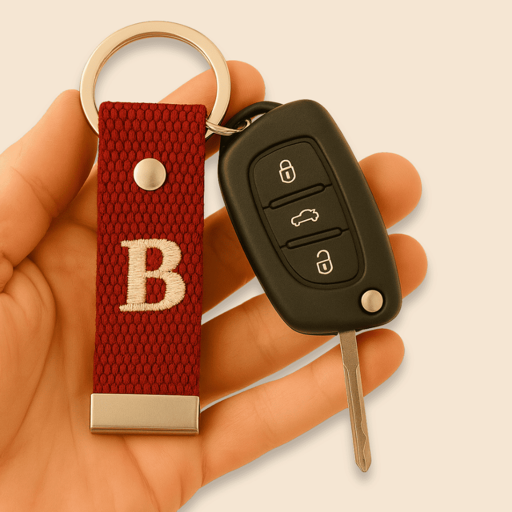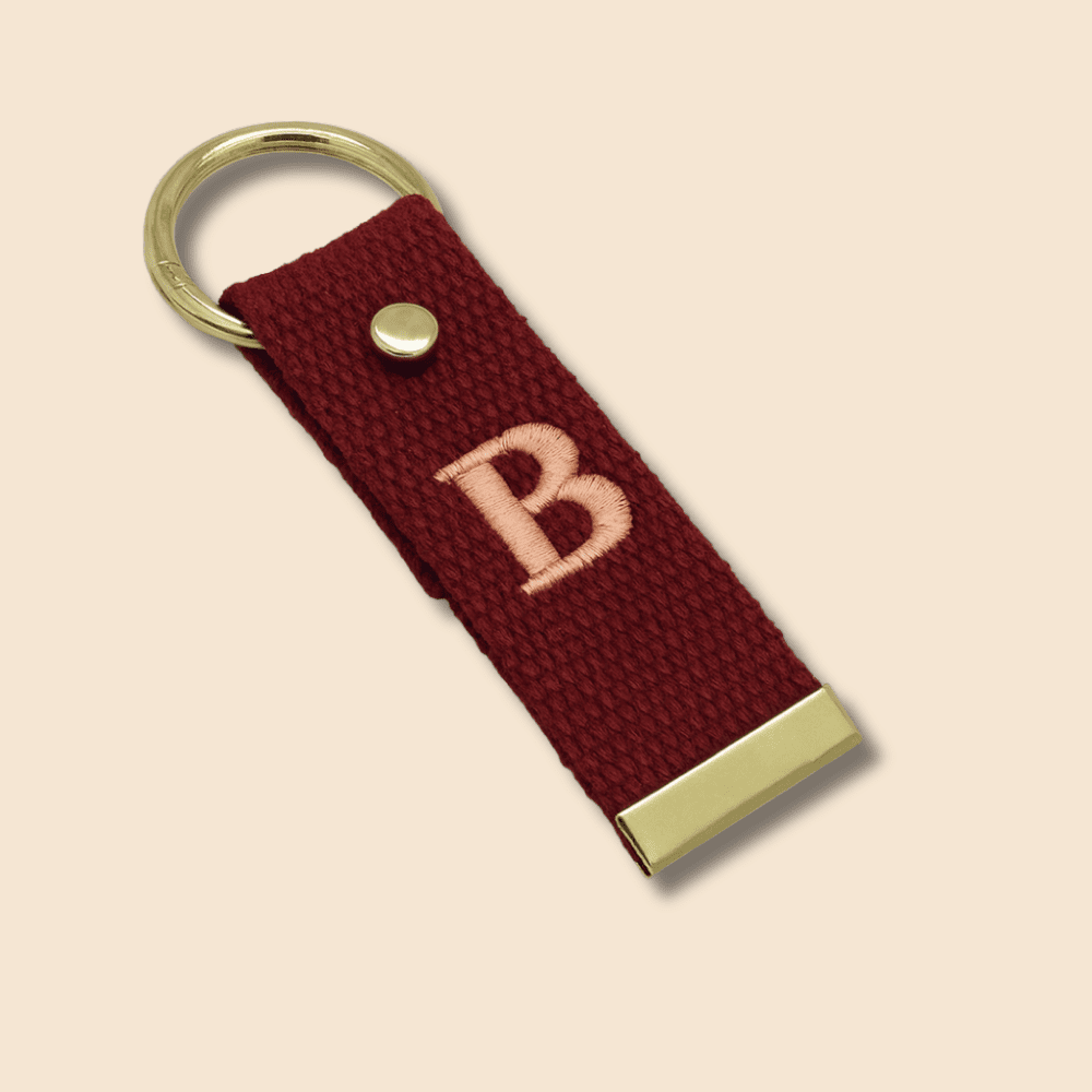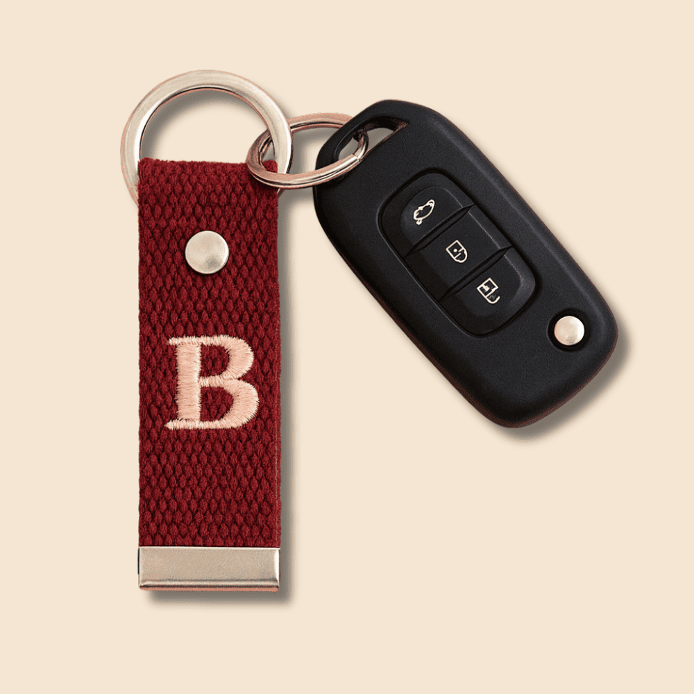 Çelik Tokalı - Kişiye Özel Anahtarlık - Bordo Renk - Dayanıklı Kumaş Üzerine Harf - Sembol Nakışlı