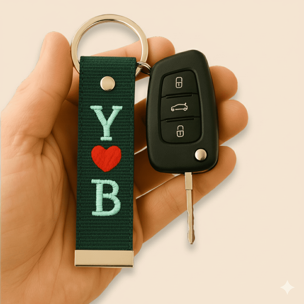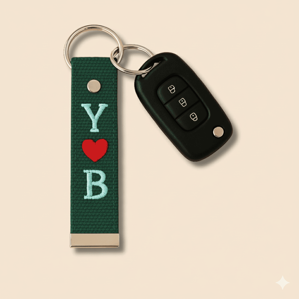 Sevdiklerinize özel ve anlamlı bir hediye arıyorsanız, kişiye özel tasarlanabilen bu şık anahtarlık tam size göre! Dayanıklı dokulu kumaş üzerine, dilediğiniz 2 harf ve kalp gibi semboller nakışla işlenerek kişiye özel hale getirilir. Zarif çelik toka detayı, anahtarlığınıza hem modern bir görünüm hem de uzun ömürlü kullanım sunar.