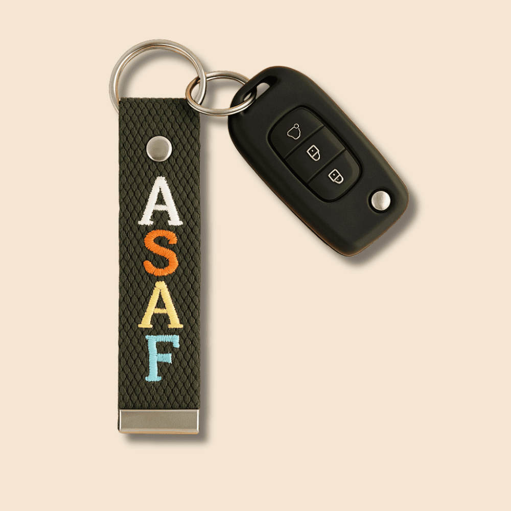 Çelik Tokalı - Kişiye Özel Anahtarlık - Haki Renk - Dayanıklı Kumaş Üzerine İsim - Sembol Nakışlı