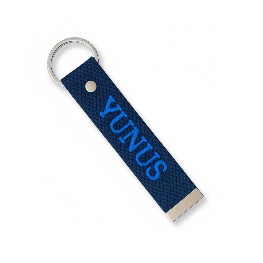 Çelik Tokalı - Kişiye Özel Anahtarlık - Lacivert - Dayanıklı Kumaş Üzerine İsim Plaka Nakışlı